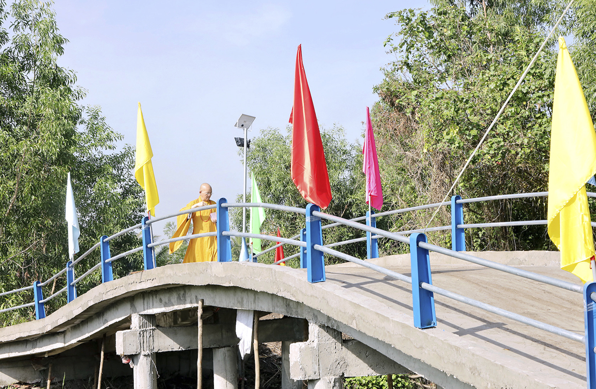 HT. Thích Minh Thiện – Trưởng BTS GHPGVN tỉnh Long An có lời phát biểu. Hoà thượng nhắc về lòng biết ơn là truyền thống quý báu của dân tộc Việt Nam, qua đó bày tỏ niềm hoan hỷ trước sự kết nối của nhóm thiện nguyện Hoa Sen đã thực hiện được nhiều hoạt động thiện nguyện khác nhau, đặc biệt là đối với việc xây dựng cầu Thiên Châu 5, góp phần đẩy mạnh phát triển kinh tế của người dân xã nhà và tiến đến là xã đạt chuẩn nông thôn mới. Hoà thượng gửi lời cảm ơn chân thành đến chính quyền địa phương huyện Thủ Thừa, xã Tân Thành, Phật tử Tâm Tín, nhóm thiện nguyện Hoa Sen đã trợ duyên mọi phương diện để cây cầu được khởi công xây dựng, đồng thời hy vọng cho Lễ khánh thành cầu Thiên Châu 5 được diễn ra thành tựu, chiếc cầu sử dụng được lâu dài, hiệu quả, đúng với tâm nguyện của toàn thể nhân dân xã nhà. Cuối lời, Hoà thượng gửi lời chúc sức khỏe đến Chư tôn đức Tăng Ni, lãnh đạo địa phương và quý nhà tài trợ. Buổi lễ khánh thành cầu Thiên Châu 5 đã kết thúc thành công tốt đẹp