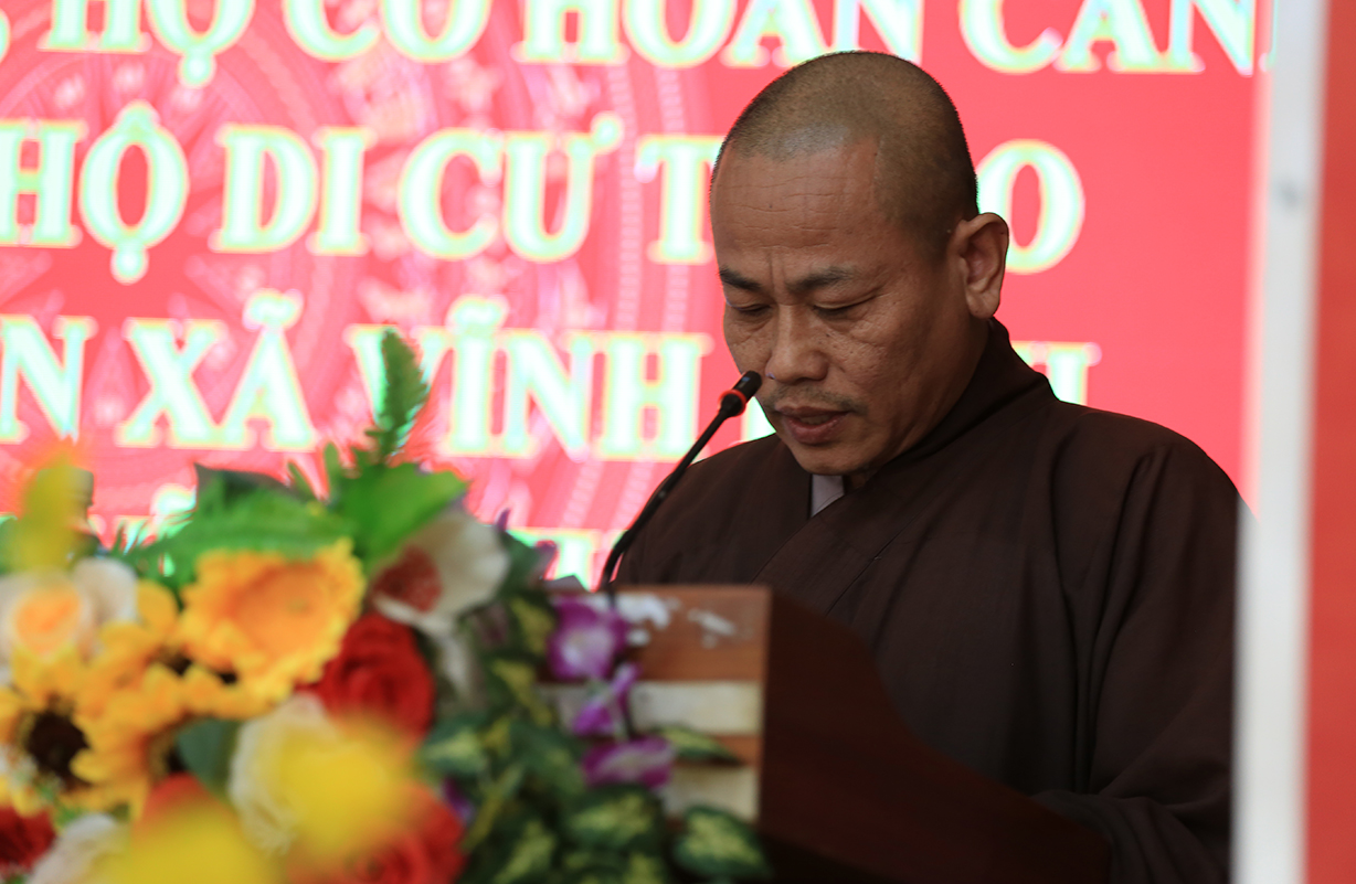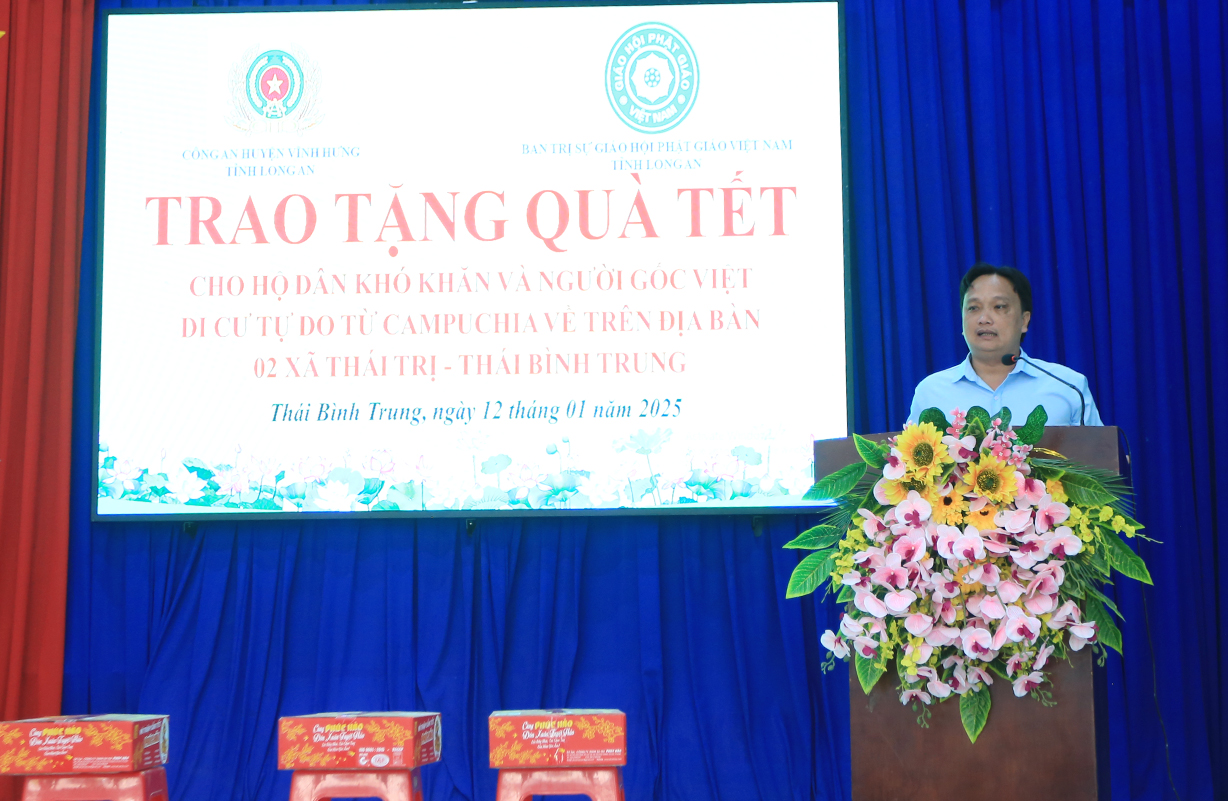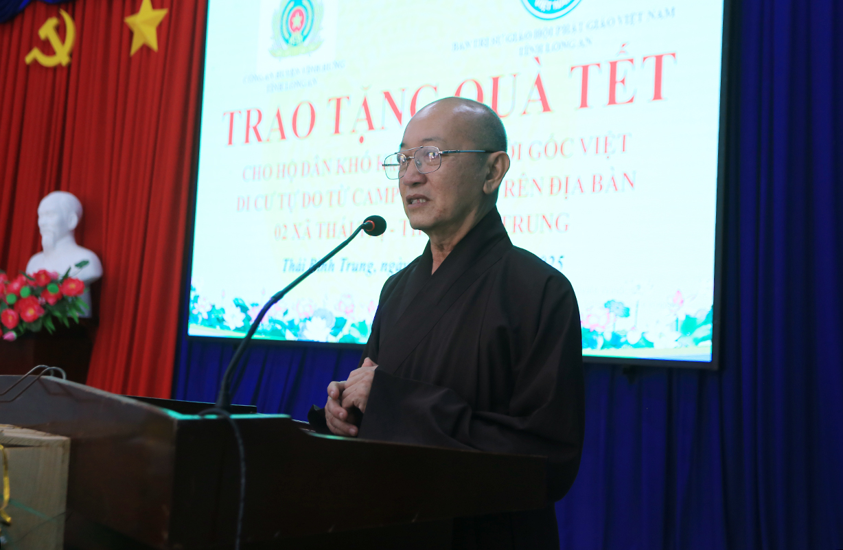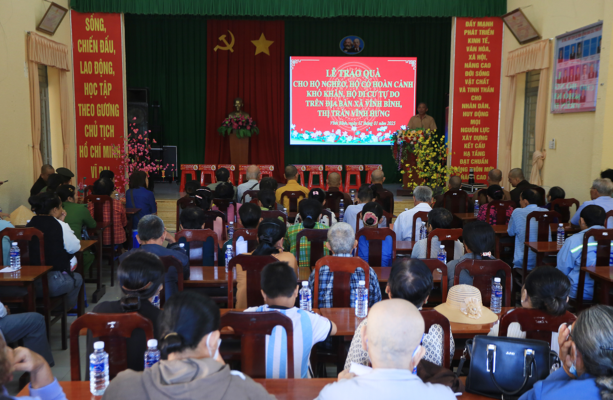 Tại buổi lễ trao quà TT. Thích An Khang – UVTT BTS GHPGVN tỉnh, Trưởng BTS GHPGVN huyện Vĩnh Hưng có lời phát biểu chào mừng. Thượng toạ tri ân sự quan tâm chỉ đạo của Thường trực BTS Phật giáo tỉnh, chính quyền địa phương huyện Vĩnh Hưng, xã Vĩnh Bình, cũng như tri ân đến phái đoàn bác sĩ từ TP.HCM đã mang những món quà xuân đến bà con vùng sâu vùng xa. Hành động thiết thực này của phái đoàn tài trợ đã thể hiện tinh thần tương thân tương ái của dân tộc, đồng thời tô đậm thêm tinh thần “Đạo pháp – Dân tộc” của đạo Phật. Thượng toạ chia sẻ, những phần quà Xuân này sẽ giúp bà con vơi bớt khó khăn, là động lực để bà con sớm hoà nhập với cộng đồng.