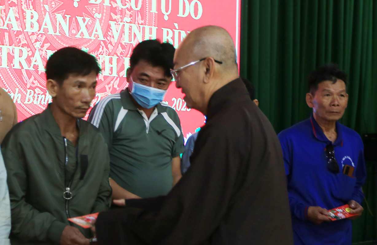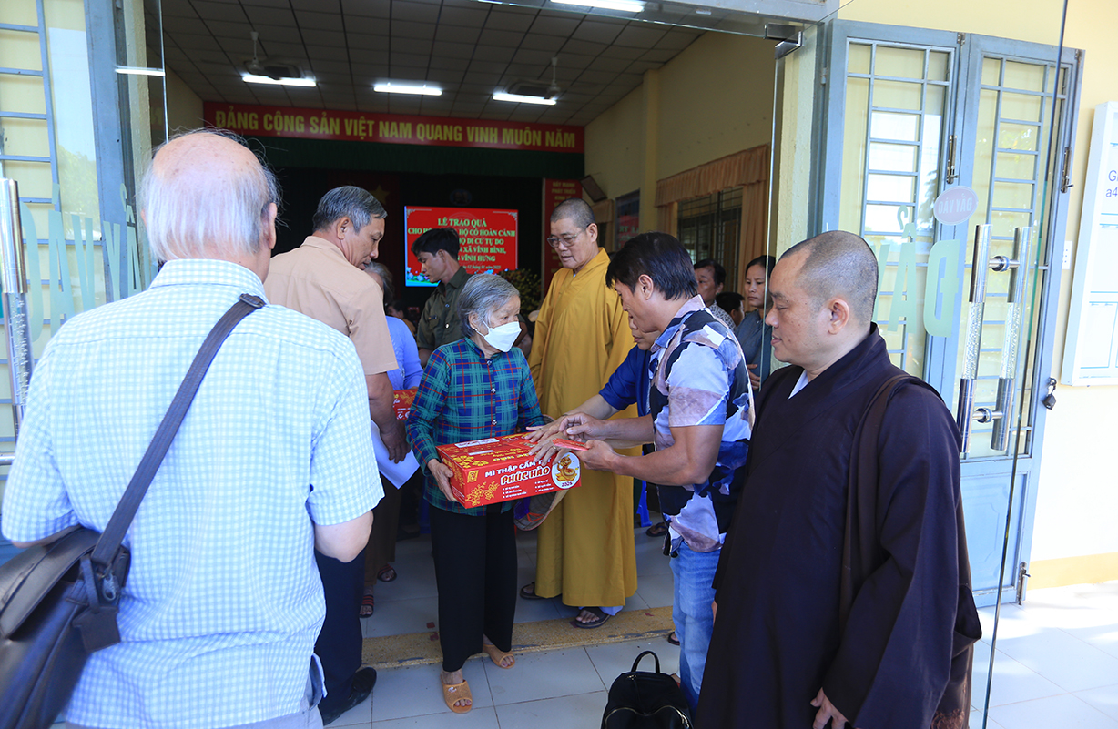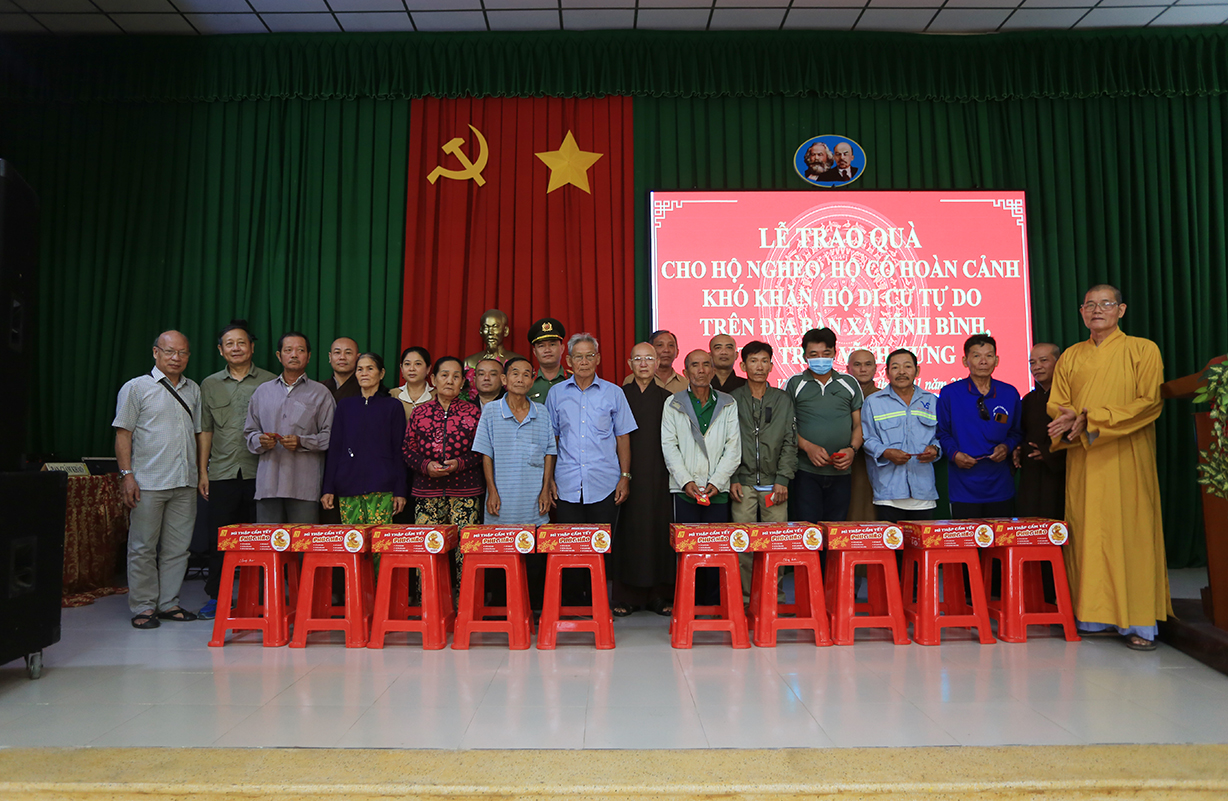 Trong đó phái đoàn bác sĩ Phạm Văn Bắc ủng hộ 360 phần quà phát tại 3 xã Vĩnh Bình, Xã Thái Trị, Thái Bình Trung. Phái đoàn Công ty Vĩnh Hoàn tỉnh Đồng Tháp ủng hộ 200 phần phát xã Vĩnh Trị và Phật tử đạo tràng Khánh Hưng