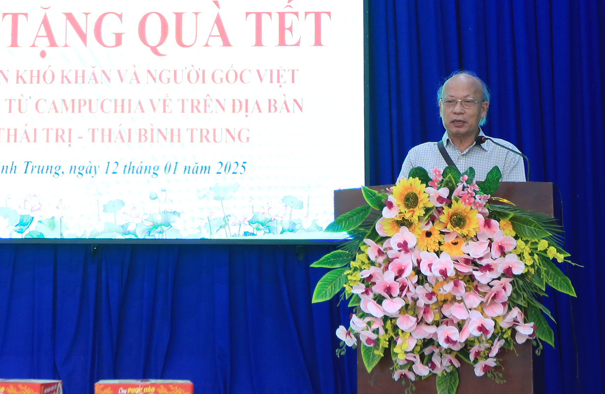 Bác sĩ Phạm Văn Bắc – Đại diện đơn vị tài trợ có lời phát biểu. Bác sĩ cho biết những phần quà xuân là tấm lòng của đội ngũ y bác sĩ hướng về bà con hộ nghèo, hộ khó khăn, hộ di cư từ Campuchia về sinh sống trên địa bàn tỉnh xã Vĩnh Bình, Xã Thái Trị, Thái Bình Trung, Xã Vĩnh Trị, Xã Khánh Hưng nhằm phần nào ổn định cuộc sống. Ông tri ân Chư Tôn đức và lãnh đạo chính quyền đã tạo điều kiện để buổi phát quà được diễn ra theo sở nguyện.