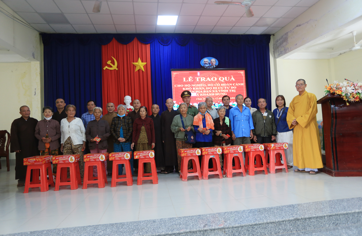Được biết, lần trao quà này, Chư Tôn đức BTS Phật giáo tỉnh, lãnh đạo chính quyền cùng đoàn tài trợ đã trao quà đến 4 xã Vĩnh Bình, xã Thái Trị, Thái Bình Trung, Xã Vĩnh Trị, đạo tràng Khánh Hưng hộ nghèo, hộ khó khăn, hộ di cư từ Campuchia về sinh sống trên địa bàn tỉnh xã Vĩnh Bình.