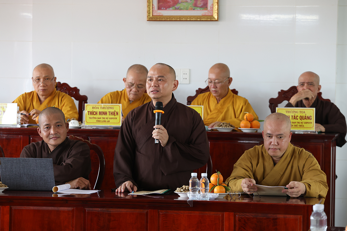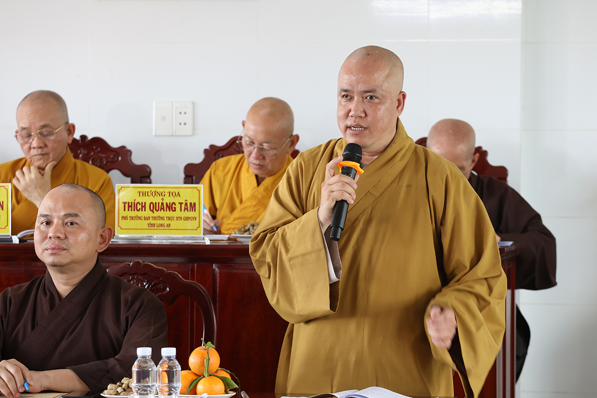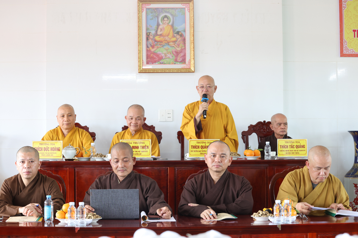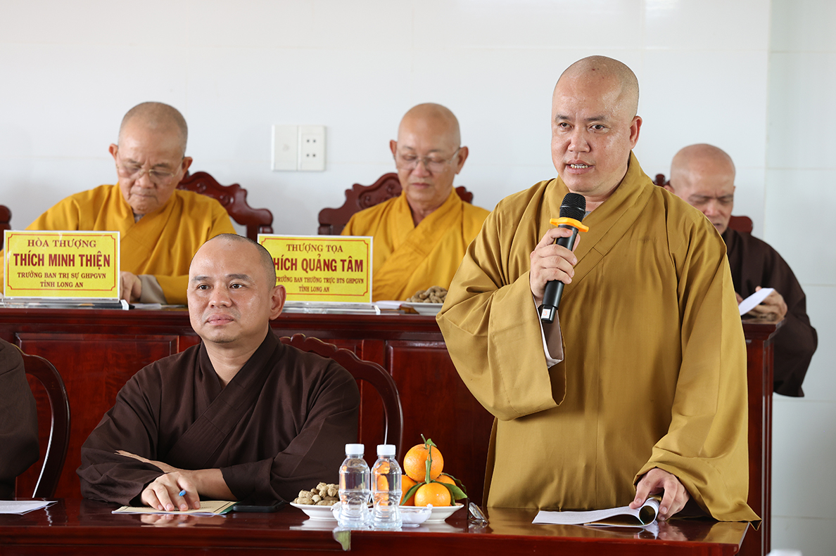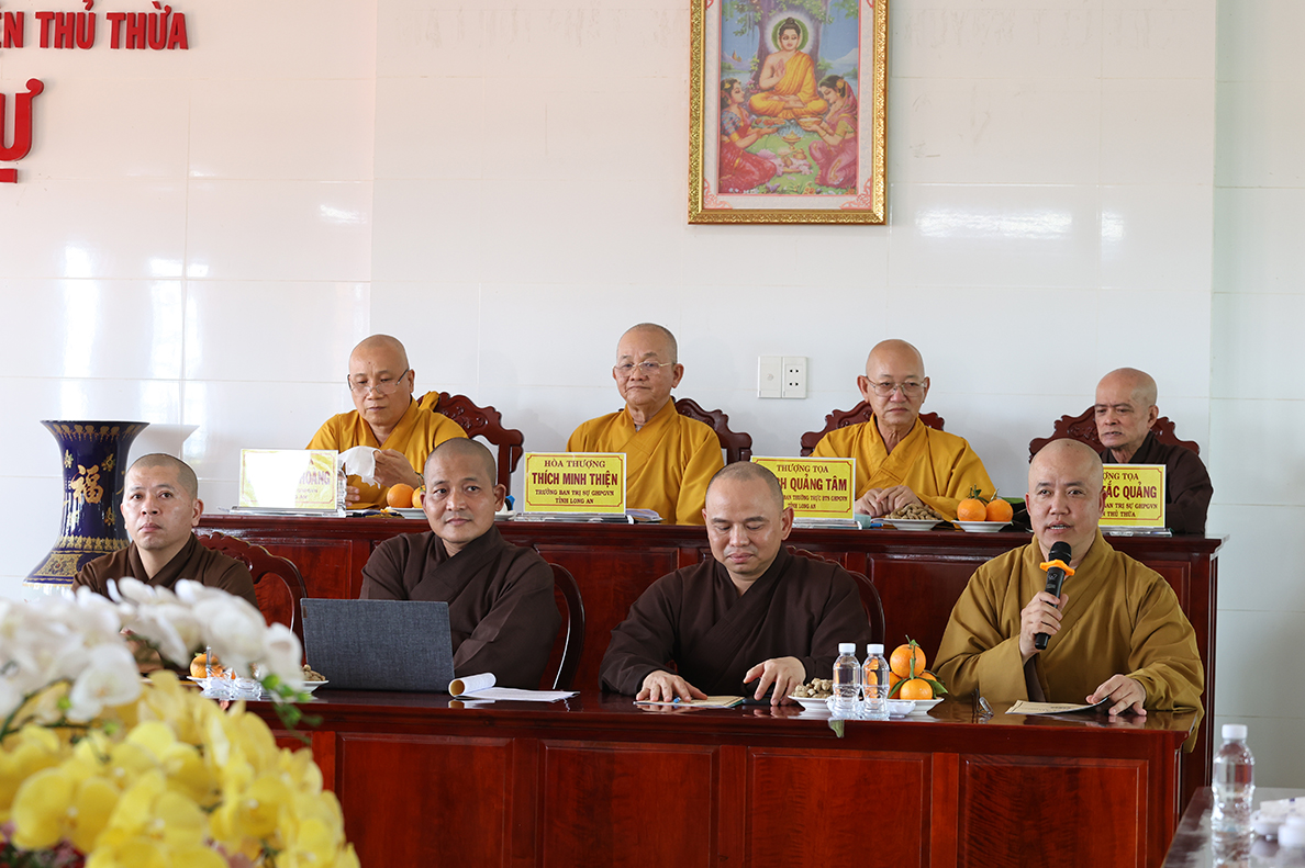 Phát biểu tại buổi họp, Thượng tọa Thích Quảng Tâm thay mặt BTS tỉnh đã đúc kết hoạt động Phật sự nhiệm kỳ X và ghi nhận các ý kiến đóng góp thiết thực của chư Tôn đức huyện Thủ Thừa nhằm củng cố và phát triển Phật sự địa phương.
