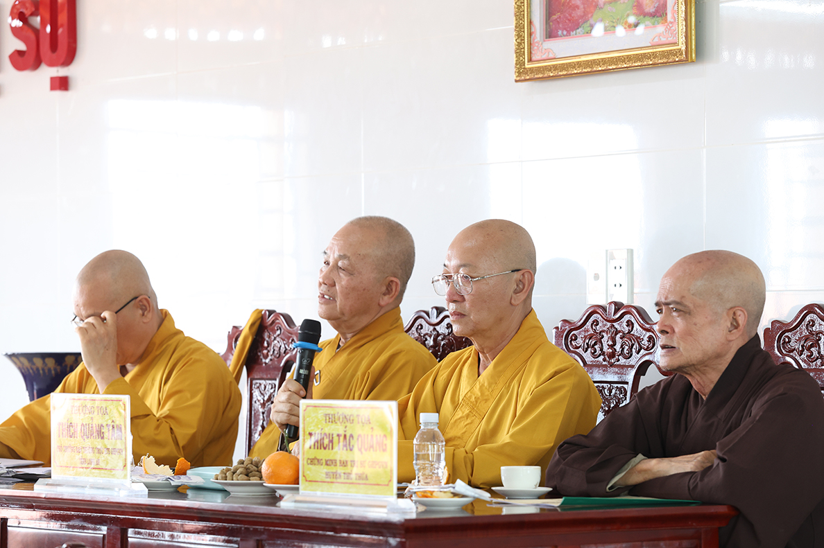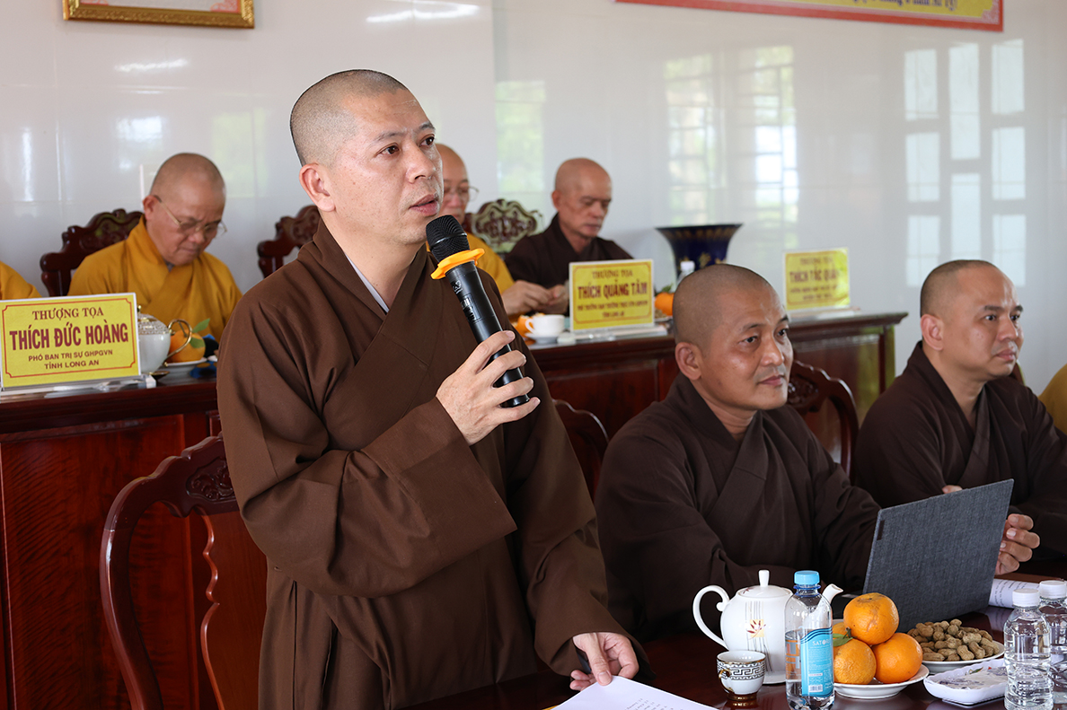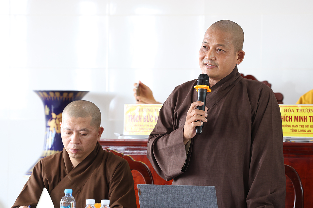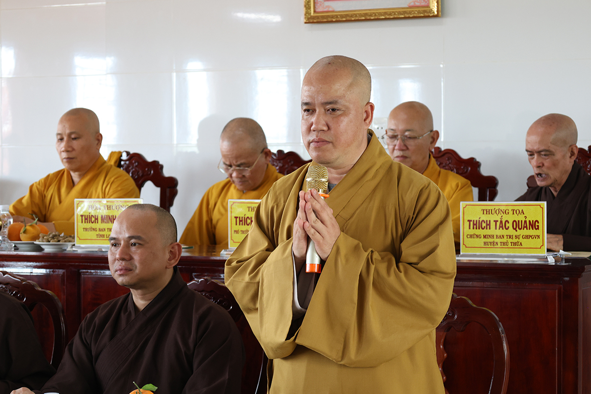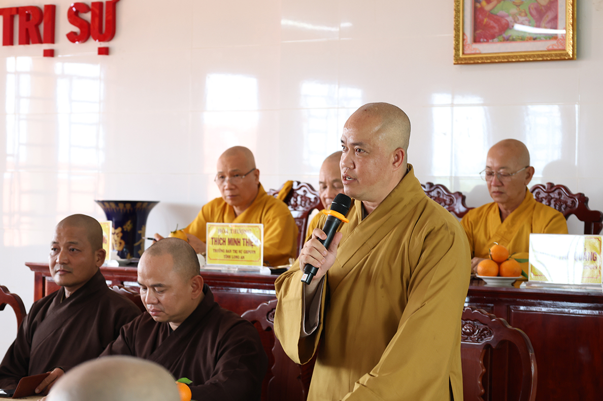 Phát biểu tại buổi họp, Thượng tọa Thích Quảng Tâm thay mặt BTS tỉnh đã đúc kết hoạt động Phật sự nhiệm kỳ X và ghi nhận các ý kiến đóng góp thiết thực của chư Tôn đức huyện Thủ Thừa nhằm củng cố và phát triển Phật sự địa phương.