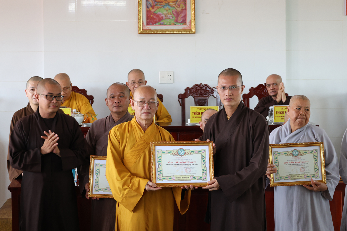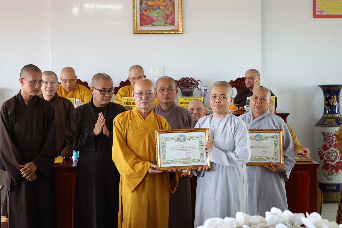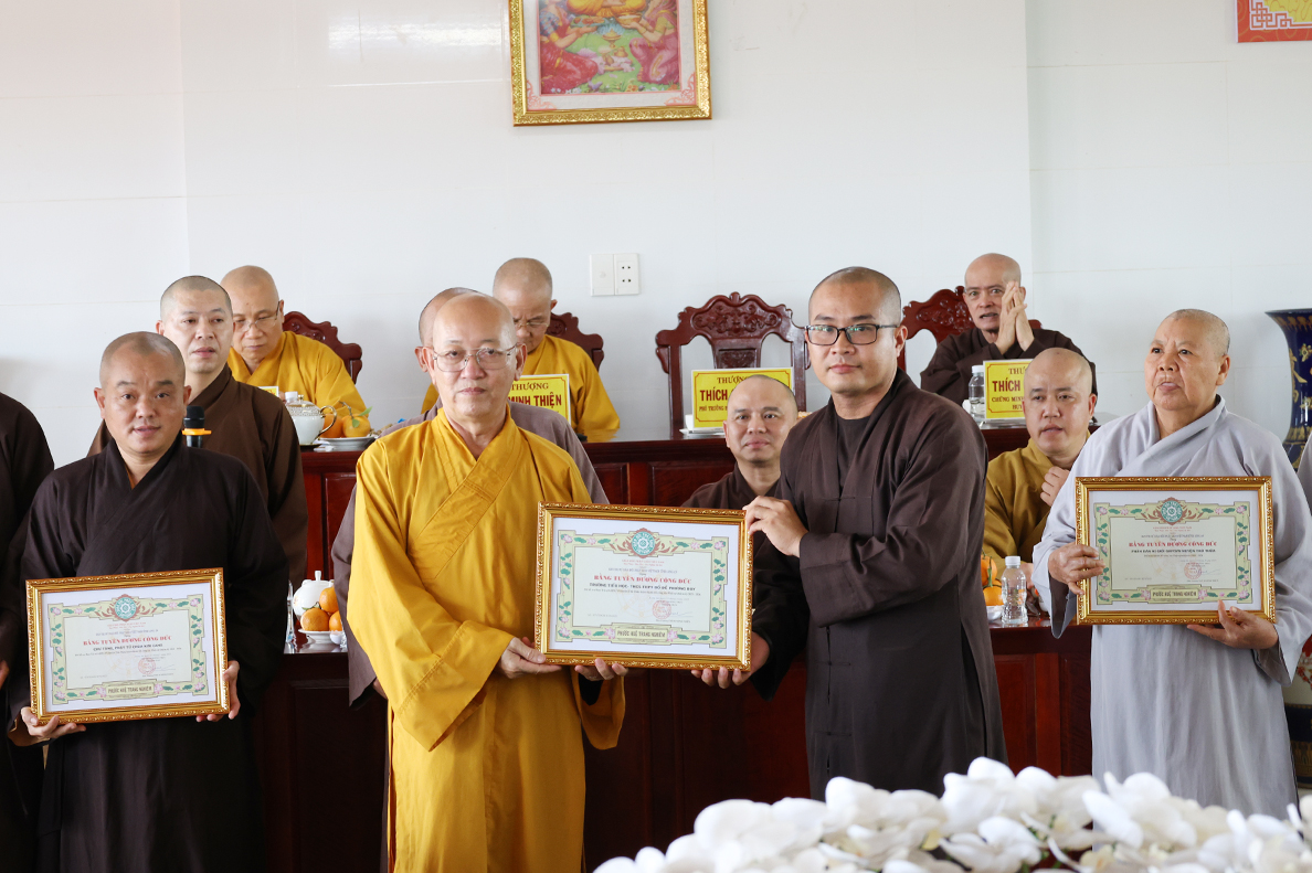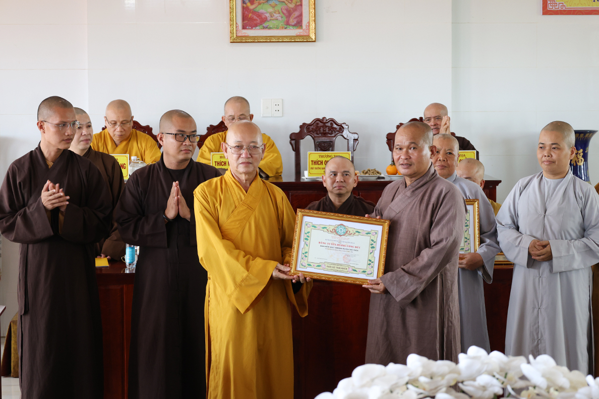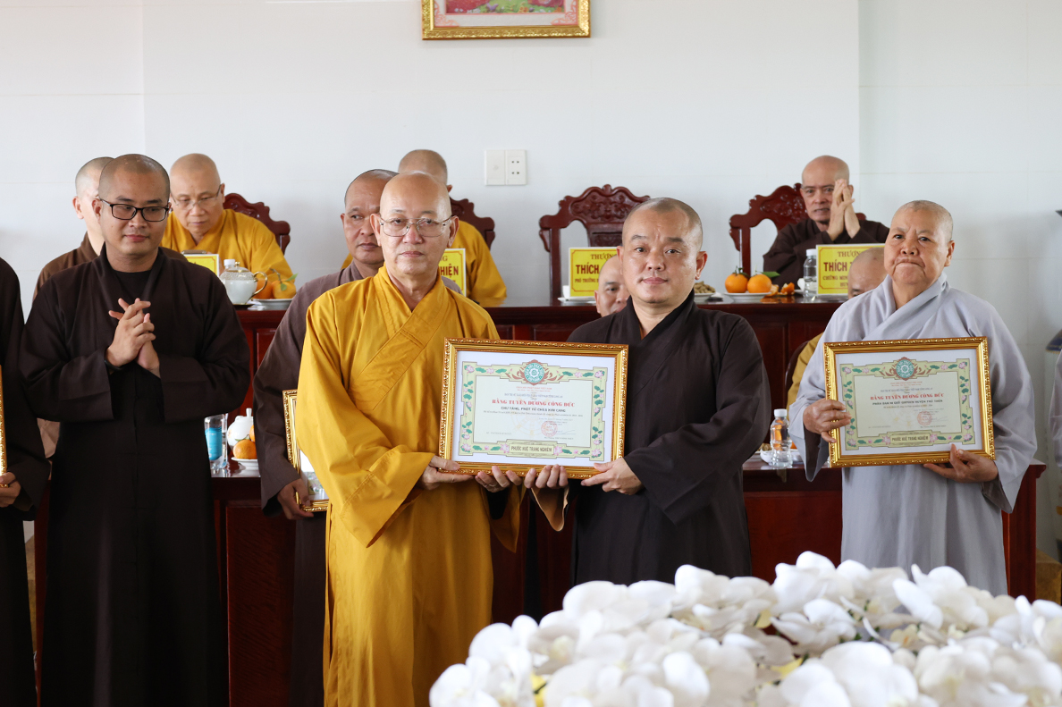 Nhân dịp này, BTS GHPGVN tỉnh Long An đã trao bằng tuyên dương công đức đến các cá nhân và tập thể đã hoàn thành xuất sắc công tác Phật sự nhiệm kỳ 2021 – 2025.