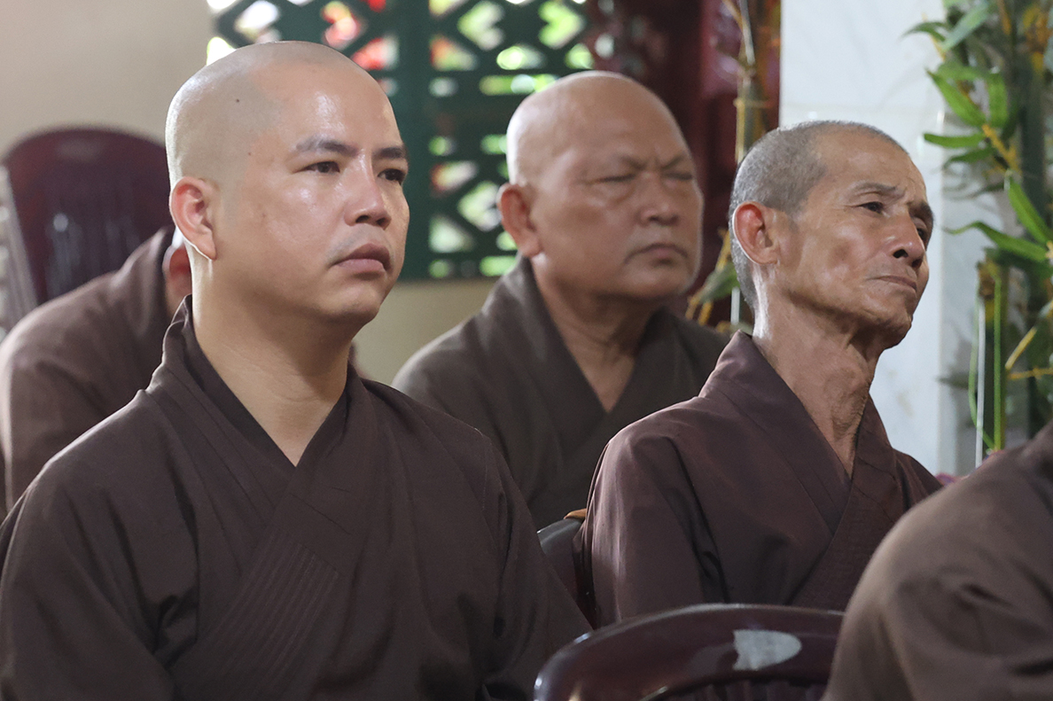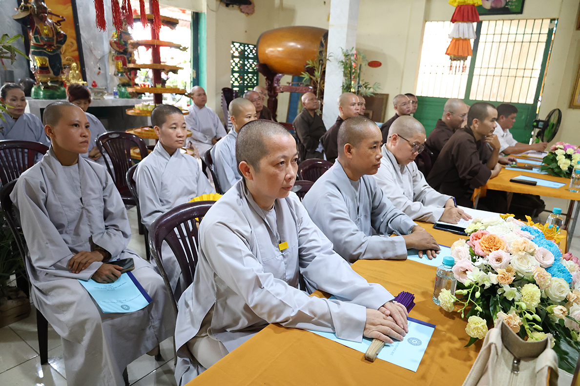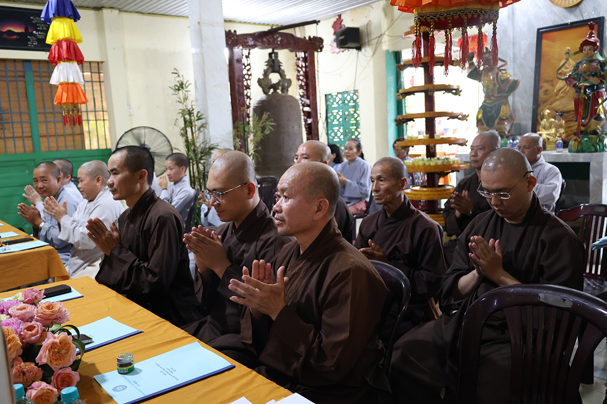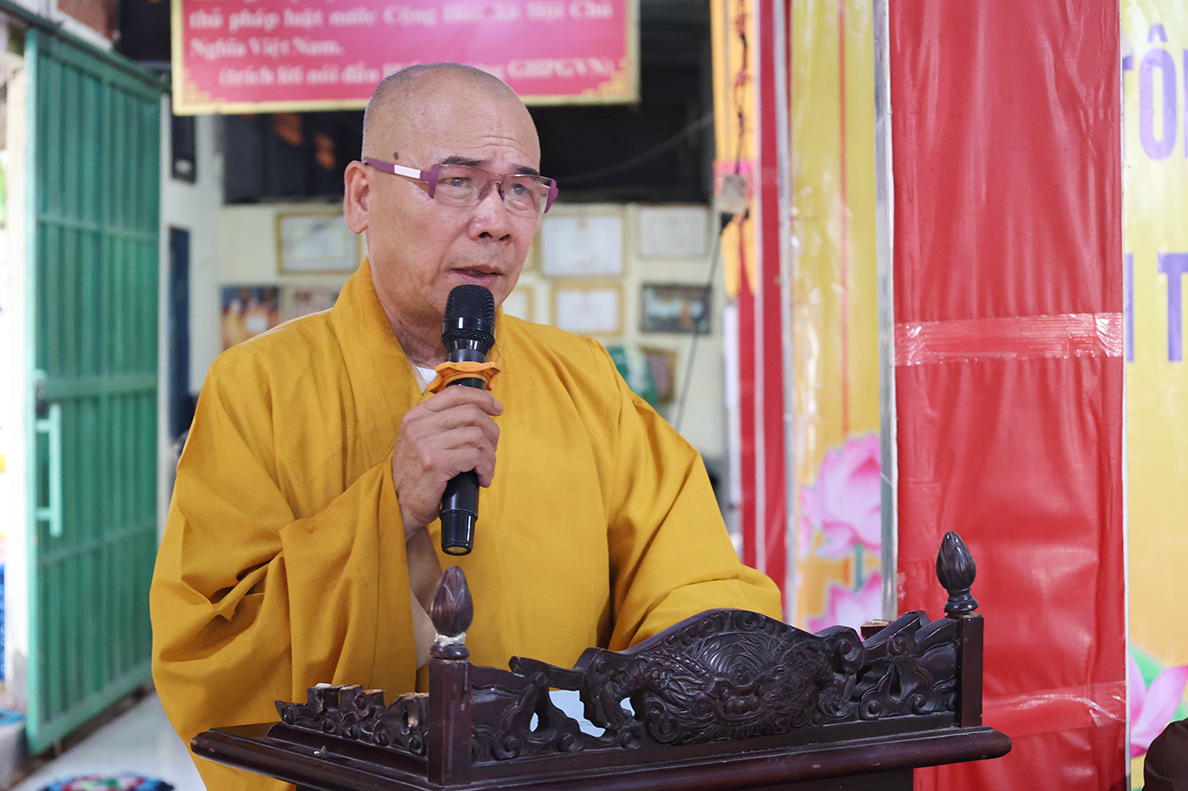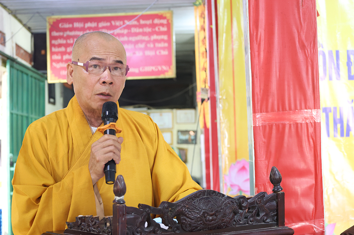 HT. Thích Minh Thiện – Trưởng BTS GHPGVN tỉnh có lời phát biểu đạo từ. Hòa thượng tán thán công đức Tăng Ni Phật tử huyện Đức Huệ đã đồng lòng, hòa hợp, phát huy tinh thần lục hòa cộng trụ trong suốt nhiệm kỳ qua, nhiều Phật sự trọng yếu đã được triển khai một cách hiệu quả, góp phần lan tỏa chánh pháp, làm sáng đạo giữa đời và đi sâu vào lòng dân tộc, nhất là trong điều kiện đặc thù của một huyện vùng biên như Đức Huệ. Hòa thượng ghi nhận sự phát triển khi từ 2 tự viện ban đầu, đến nay toàn huyện đã có thêm 6 điểm sinh hoạt tôn giáo tập trung, cho thấy sự phát triển ổn định của Phật giáo huyện nhà. Định hướng cho chặng đường sắp tới, Hòa thượng nhấn mạnh tầm quan trọng của việc giữ gìn và phát huy truyền thống tu học, đặc biệt là thực hành An cư kiết hạ theo đúng tinh thần Luật tạng để chư Tăng Ni thúc liễm thân tâm, trau dồi giới – định – tuệ, tăng trưởng đạo lực, từ đó làm nền tảng vững chắc cho sự hành đạo và hoằng pháp lợi sinh sau này.