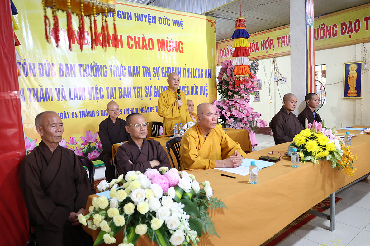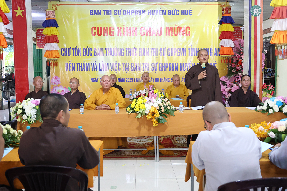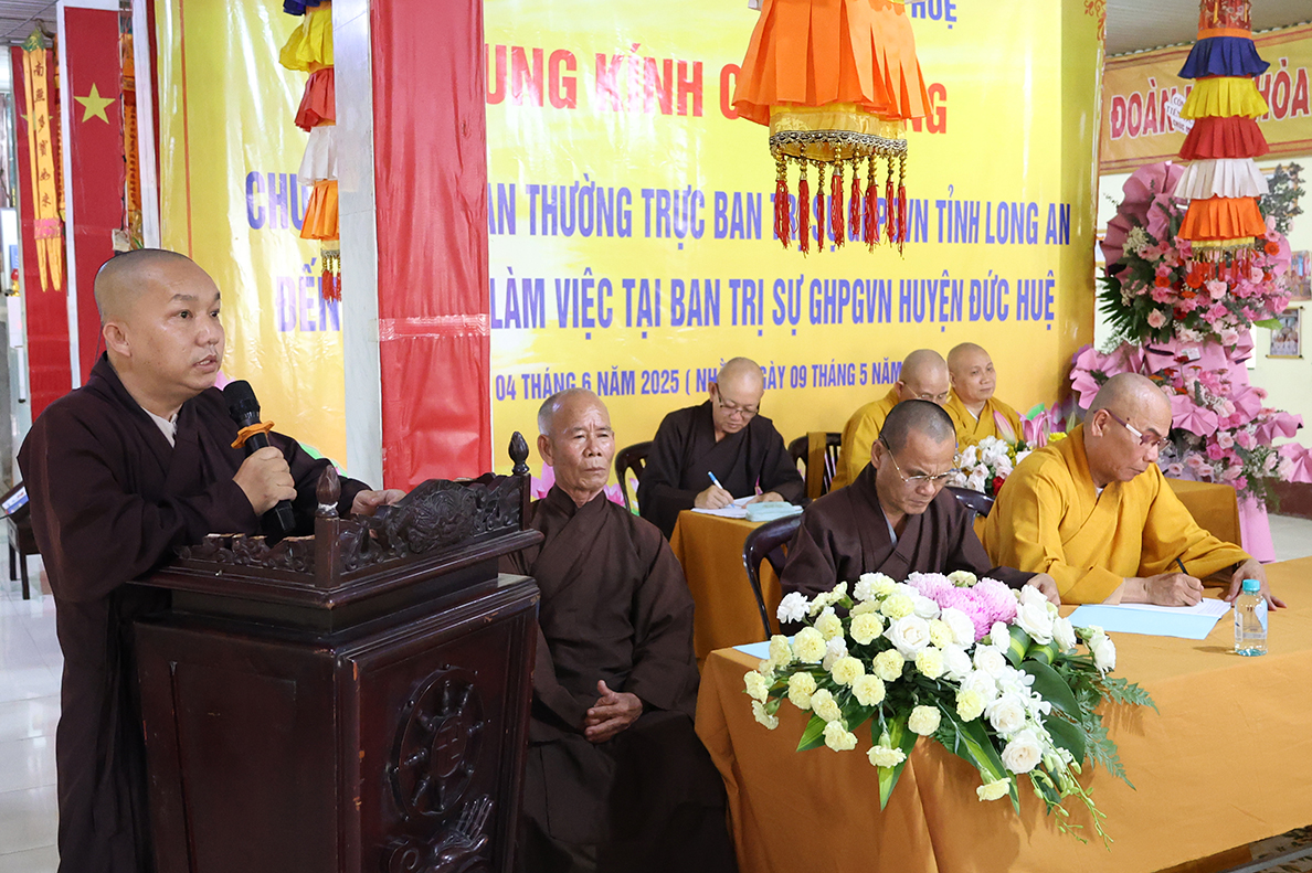 Thay mặt BTS GHPGVN huyện Đức Huệ, Đại đức Thích Thiện An đã trình bày báo cáo khái quát những thành tựu Phật sự trong nhiệm kỳ 2021 – 2026. Tuy Ban Trị sự huyện được thành lập vào năm 2021 nhưng nhờ có sự chỉ đạo của BTS GHPGVN tỉnh Long An, Phật giáo huyện Đức Huệ đã đạt được những thành tựu nhất định. Theo đó, trên địa bàn huyện Đức Huệ có 2 tự viện và 6 điểm sinh hoạt tôn giáo tập trung đang hoạt động với 32 Chư Tôn đức Tăng Ni tu học và sinh hoạt. Công tác hoằng pháp tại địa phương được chú trọng: có nhiều đạo tràng tu học như đạo tràng Bát quan trai, niệm Phật được tổ chức định kỳ hằng tháng. Ngoài ra, BTS GHPGVN huyện còn phối hợp với chính quyền địa phương thực hiện nhiều chương trình an sinh xã hội thiết thực. Nổi bật nhất là về công tác từ thiện và an sinh xã hội, Tăng Ni Phật tử huyện Đức Huệ đã đóng góp vào nhiều cầu giao thông, nhà tình nghĩa, phát quà cho hộ nghèo, học bổng cho học sinh nghèo,… Tổng giá trị từ thiện xã hội trong 4 năm đầu nhiệm kỳ đạt hơn 7 tỷ đồng.
