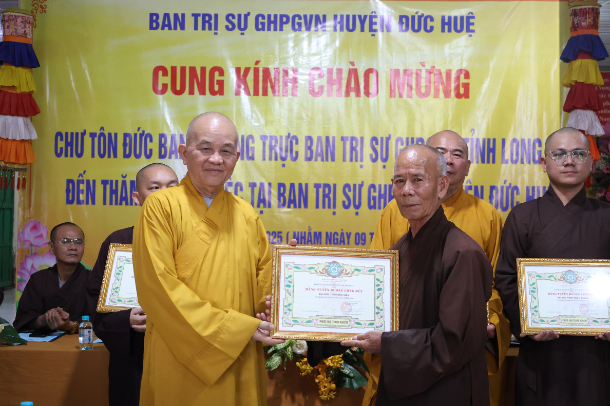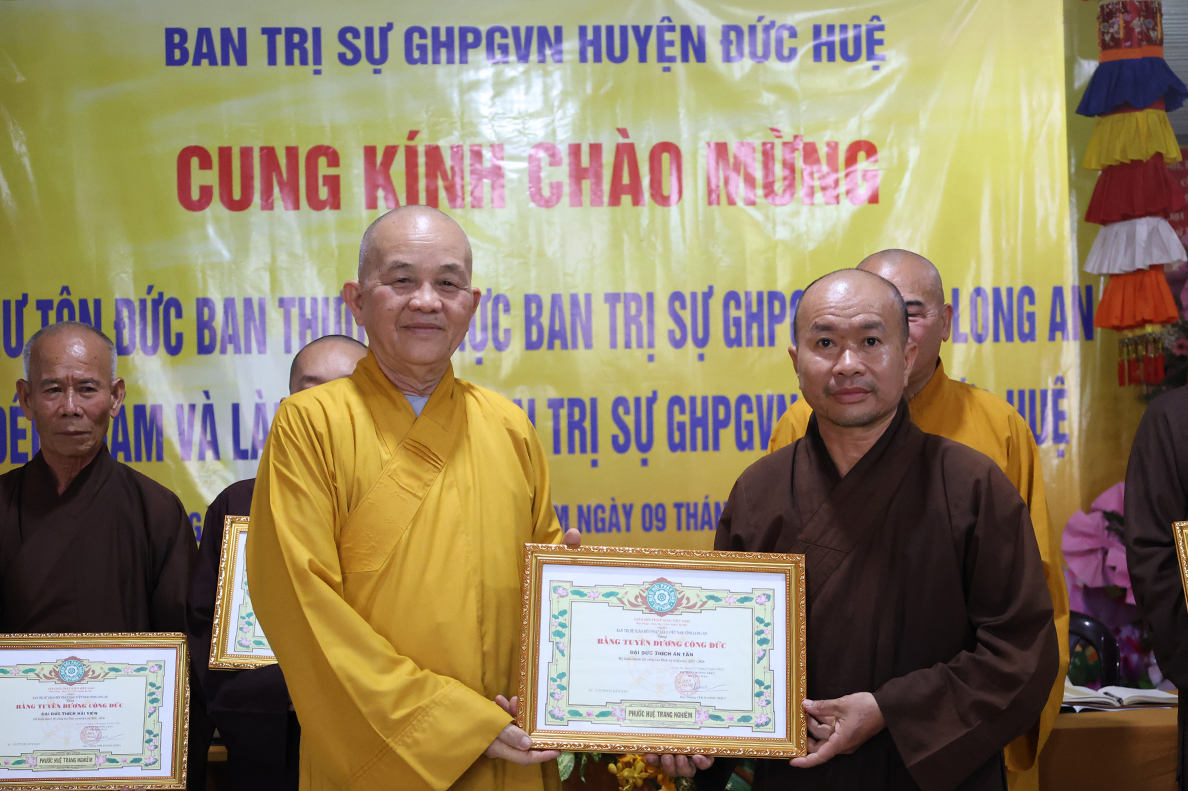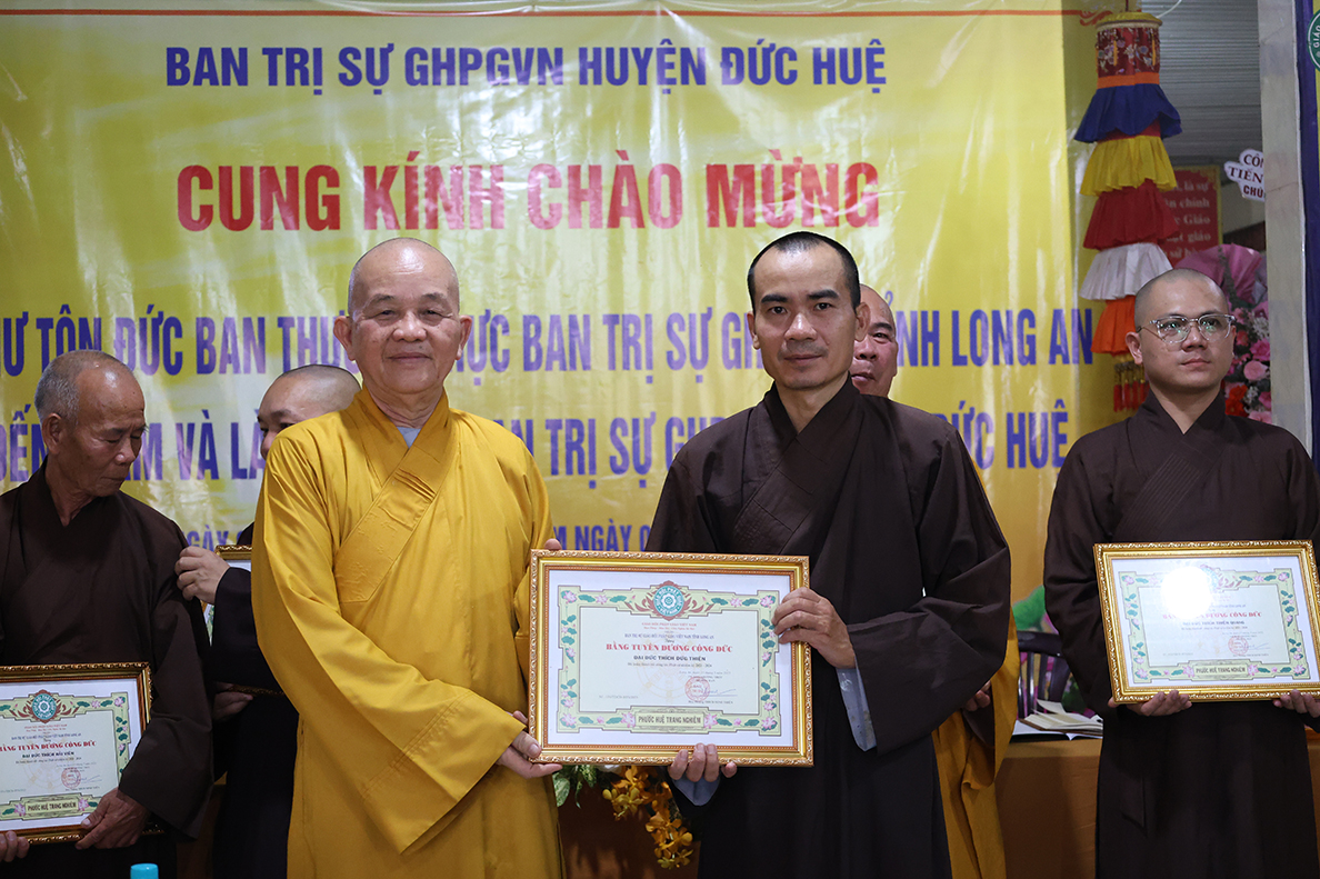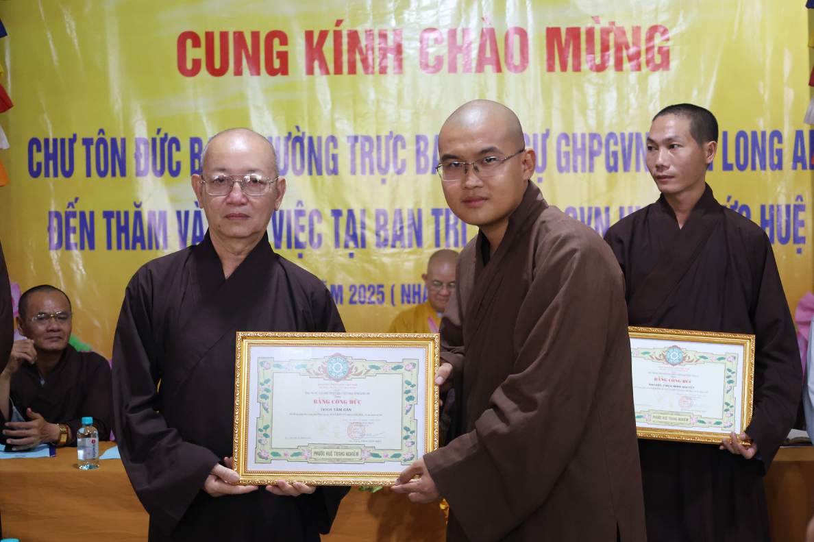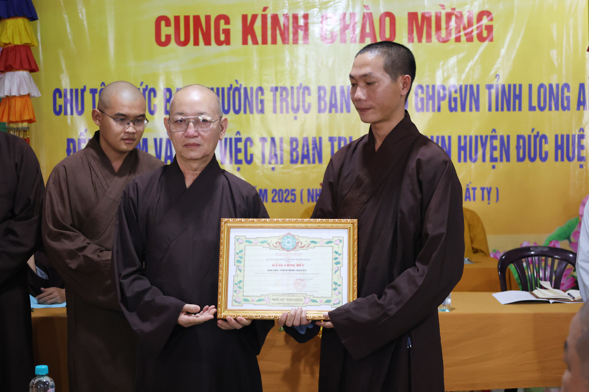 Dịp này, Ban Thường trực BTS GHPGVN tỉnh Long An đã trao bằng tuyên dương công đức đến các cá nhân và tập thể Chư Tôn đức BTS GHPGVN huyện Đức Huệ đã hoàn thành tốt công tác Phật sự năm 2025 (nhiệm kỳ 2021 – 2026).