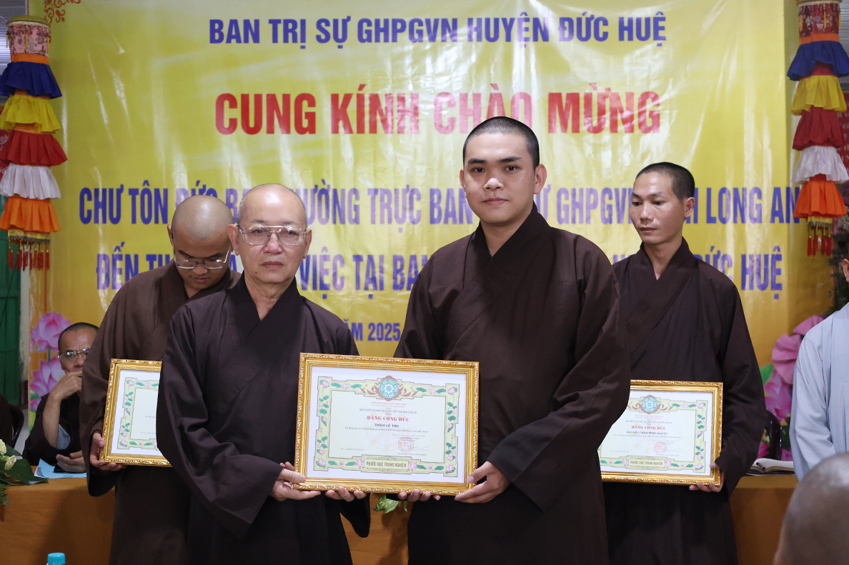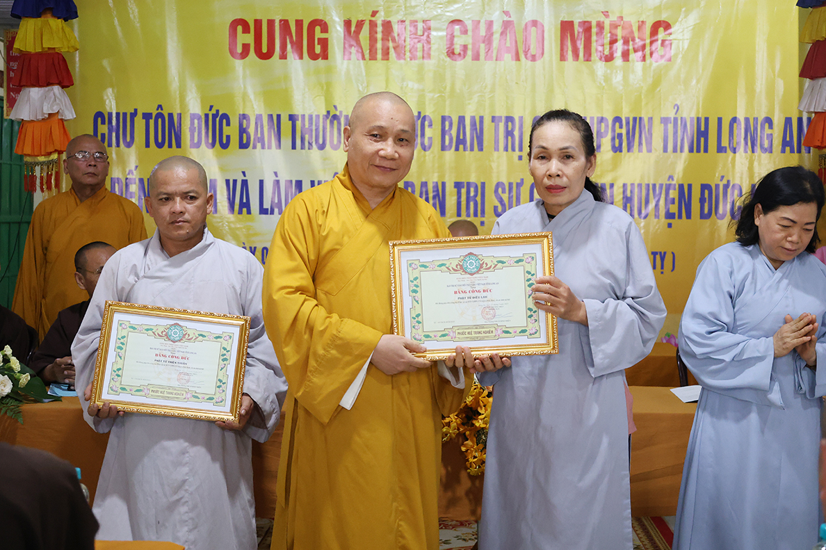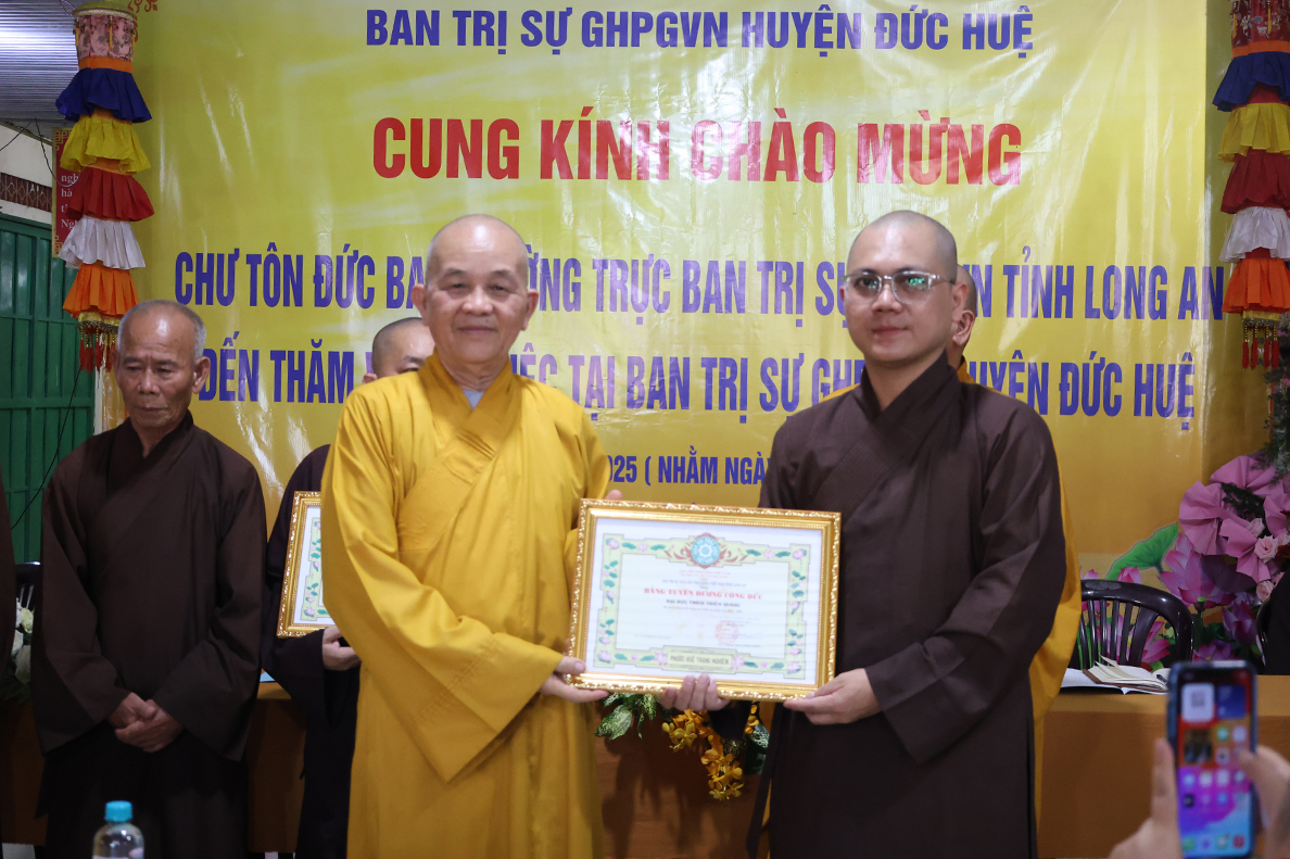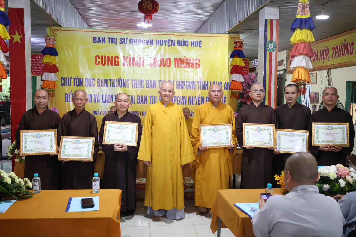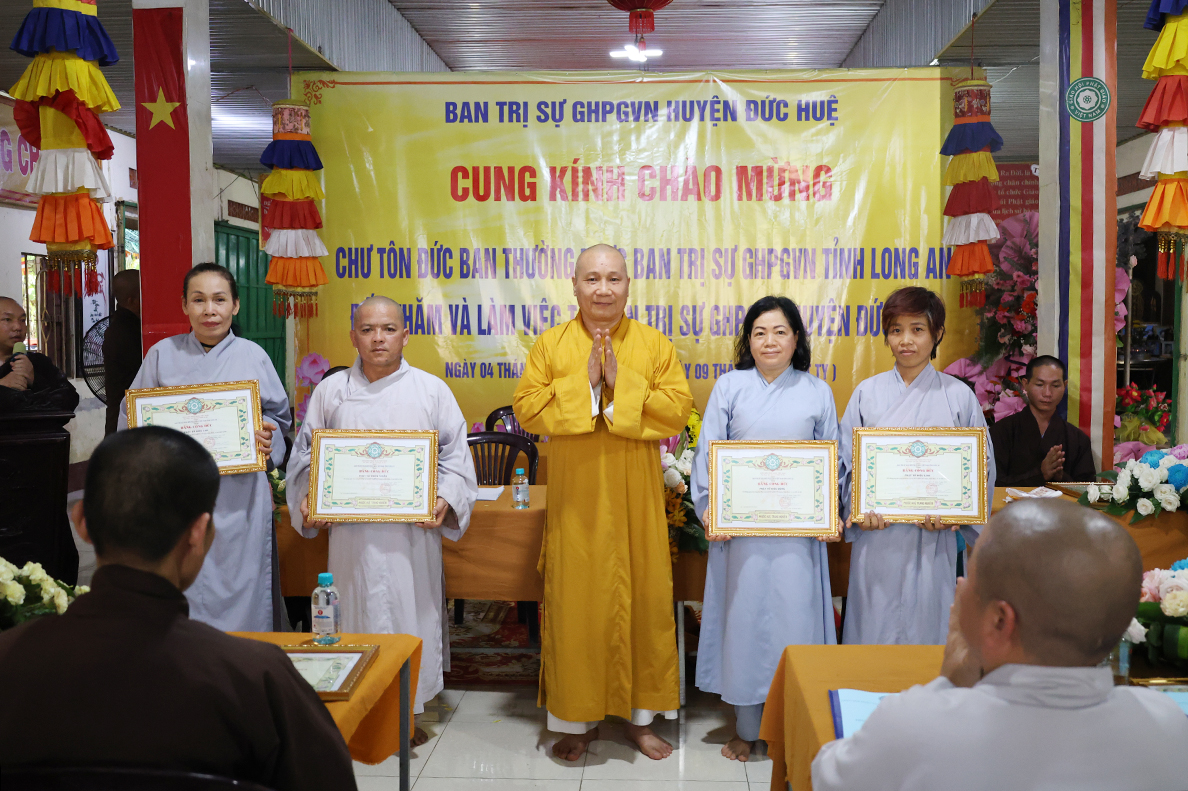 Dịp này, Ban Thường trực BTS GHPGVN tỉnh Long An đã trao bằng tuyên dương công đức đến các cá nhân và tập thể Chư Tôn đức BTS GHPGVN huyện Đức Huệ đã hoàn thành tốt công tác Phật sự năm 2025 (nhiệm kỳ 2021 – 2026).