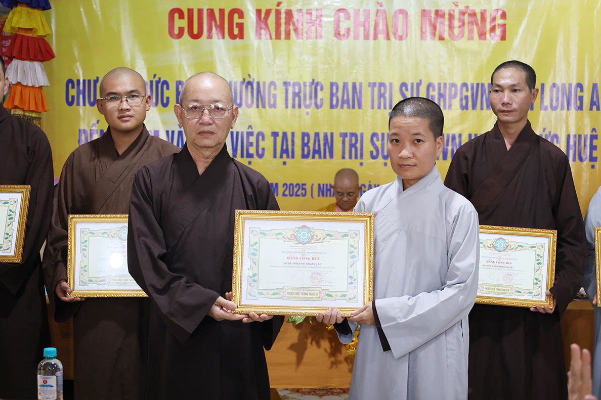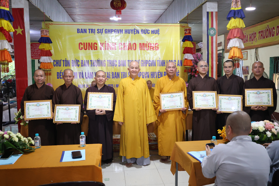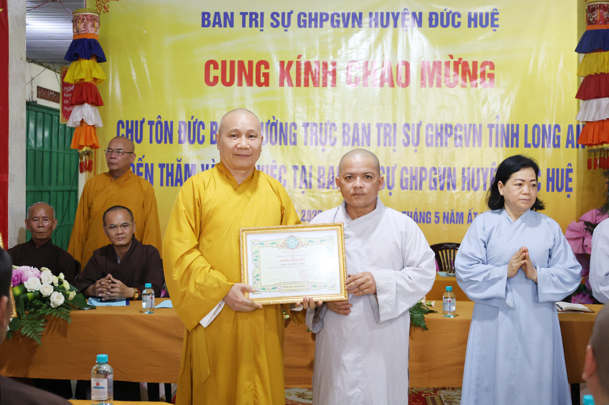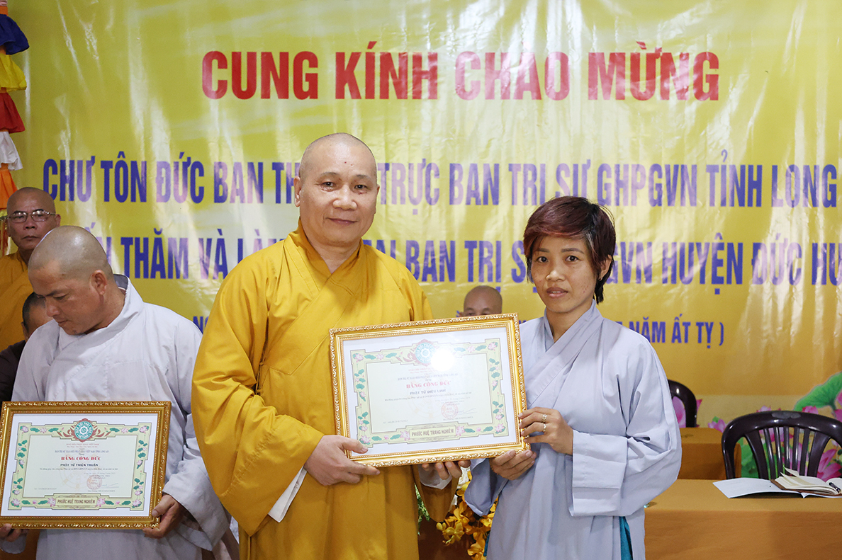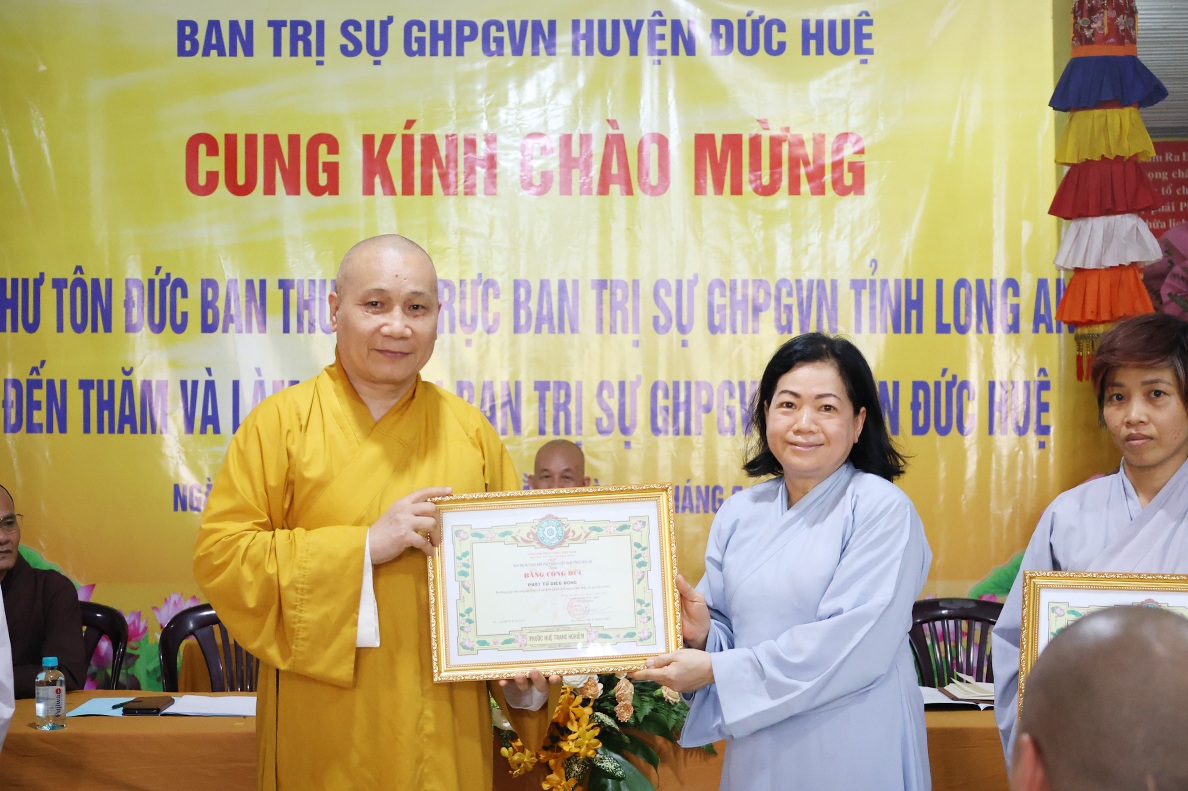 Dịp này, Ban Thường trực BTS GHPGVN tỉnh Long An đã trao bằng tuyên dương công đức đến các cá nhân và tập thể Chư Tôn đức BTS GHPGVN huyện Đức Huệ đã hoàn thành tốt công tác Phật sự năm 2025 (nhiệm kỳ 2021 – 2026).