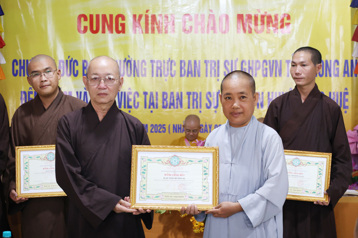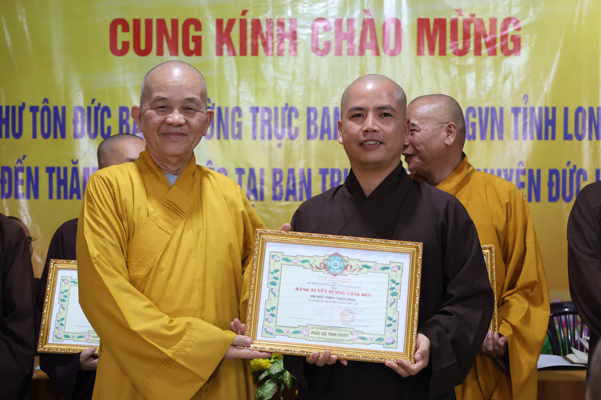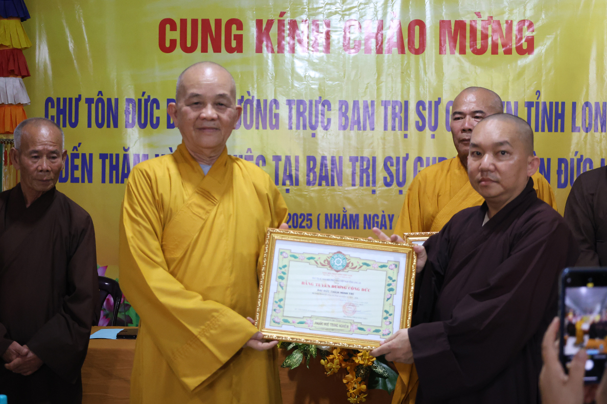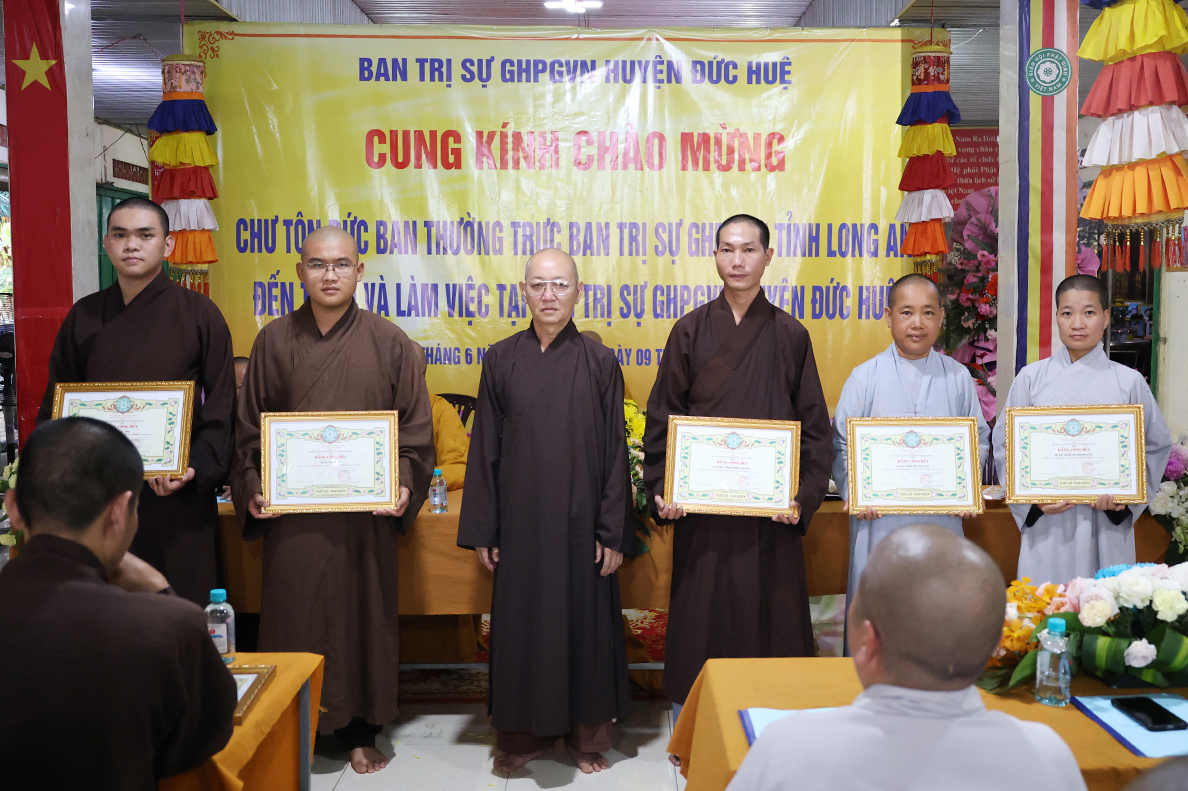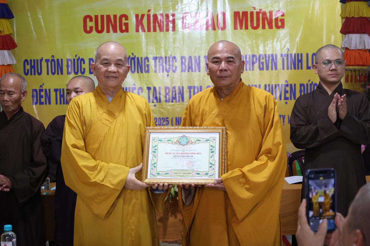 Dịp này, Ban Thường trực BTS GHPGVN tỉnh Long An đã trao bằng tuyên dương công đức đến các cá nhân và tập thể Chư Tôn đức BTS GHPGVN huyện Đức Huệ đã hoàn thành tốt công tác Phật sự năm 2025 (nhiệm kỳ 2021 – 2026).