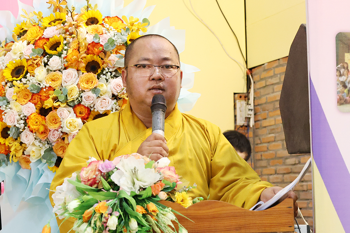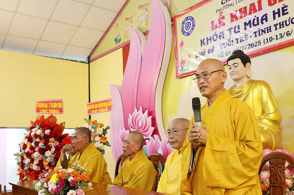 Mở đầu buổi lễ, TT. Thích Lệ Trí – Trưởng BTC báo cáo kế hoạch tổ chức khóa tu. Theo đó, khóa tu được tổ chức trong 04 ngày từ ngày 04 đến 07 tháng 7 năm 2025 với hơn 500 khóa sinh tham dự với sự bảo hộ và đồng ý của phụ huynh. Thượng tọa cho biết, hòa vào trong khí trang nghiêm của chư Tôn đức Tăng ni đăng vun bồi giới thân huệ mạng nơi các trú xứ an cư kiết hạ, Thanh thiếu niên Phật tử cũng phát nguyện trở về các tự viện để tu học đạo đức mùa hè, đó cũng chính là mục tiêu cốt lõi của Khóa tu mùa hè tại chùa Long Phước hằng năm. Tại khóa tu, các khóa sinh không phải chịu bất kỳ chi phí nào. Thượng tọa cũng thông qua chương trình chi tiết và nội dung khóa tu, ngoài tụng niệm theo nghi thức Phật giáo, còn rèn luyện các kỹ năng sống thiết thực, áp dụng vào đời sống hằng ngày thông qua các bài thuyết giảng, chia sẻ và trò chơi lồng ghép trong chương trình.