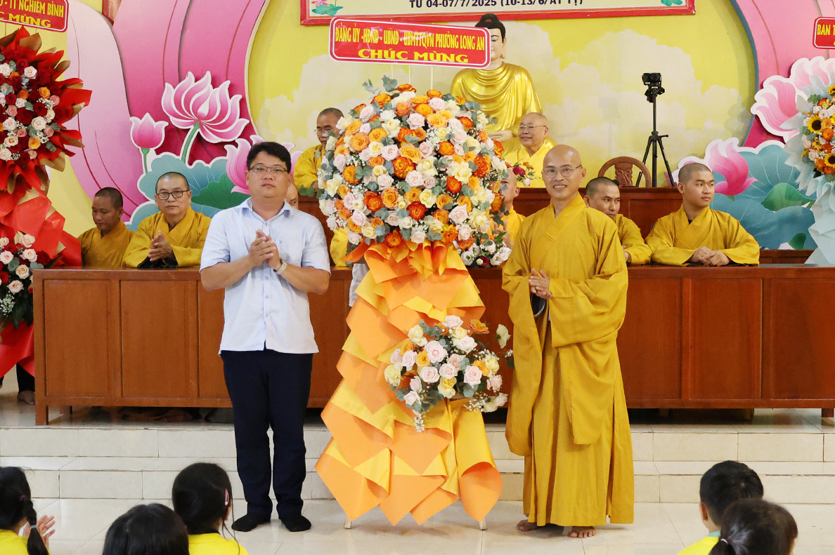 Buổi lễ đón nhận lẵng hoa chúc mừng của: Ban Trị sự GHPGVN tỉnh Tây Ninh, TT. Thích Nghiêm Đạo & TT. Thích Nghiêm Bình, Đảng ủy – HĐND – UBND – UBMTTQVN phường Long An.