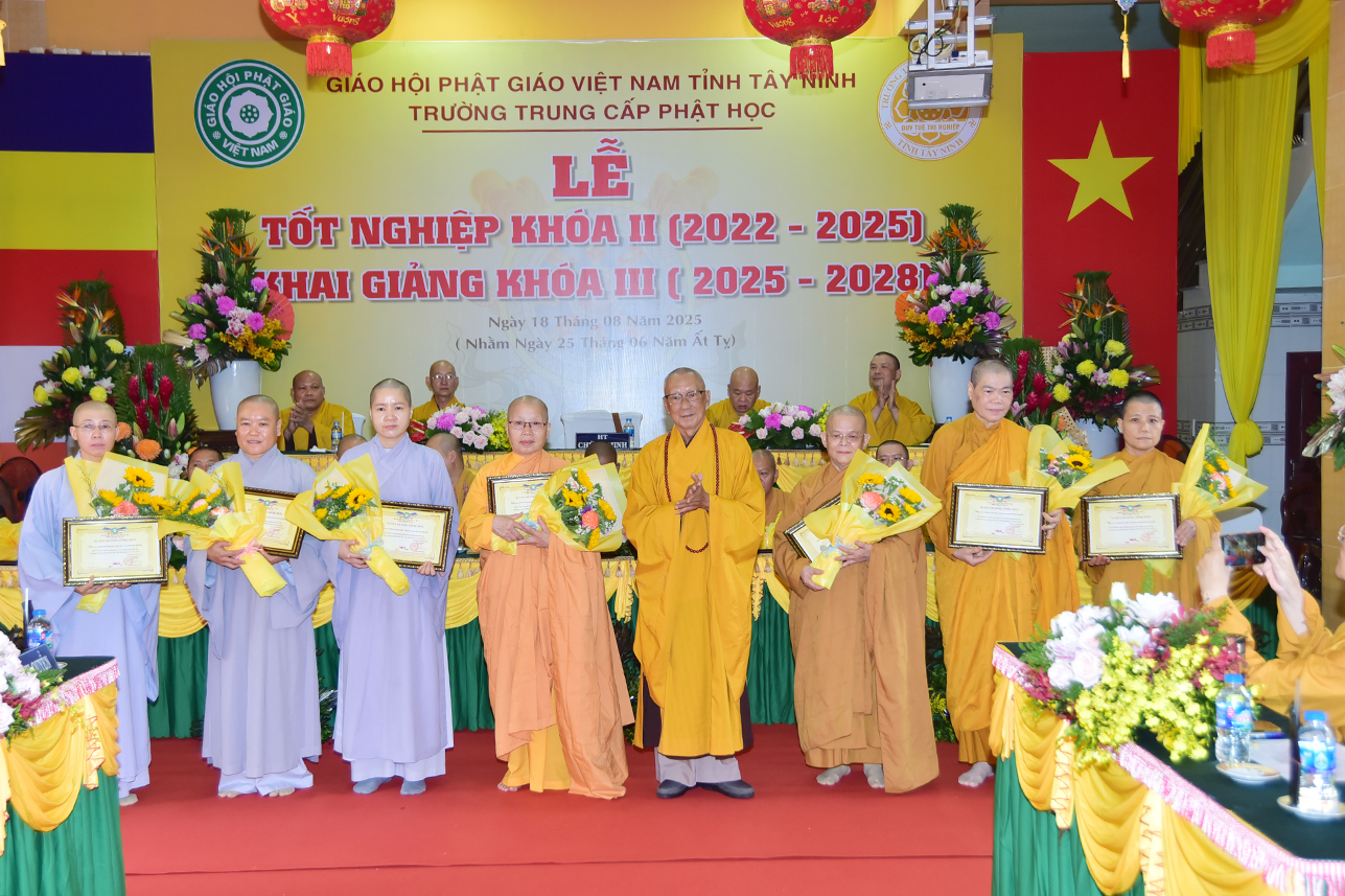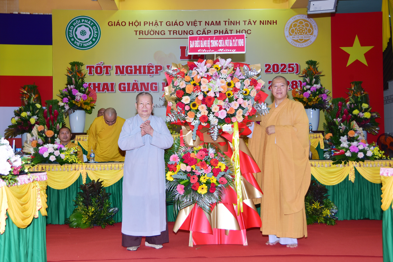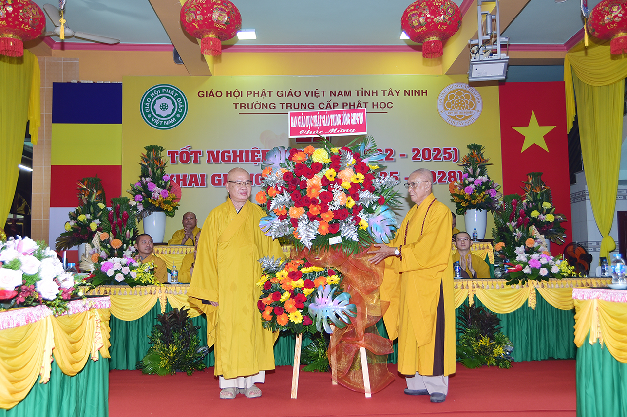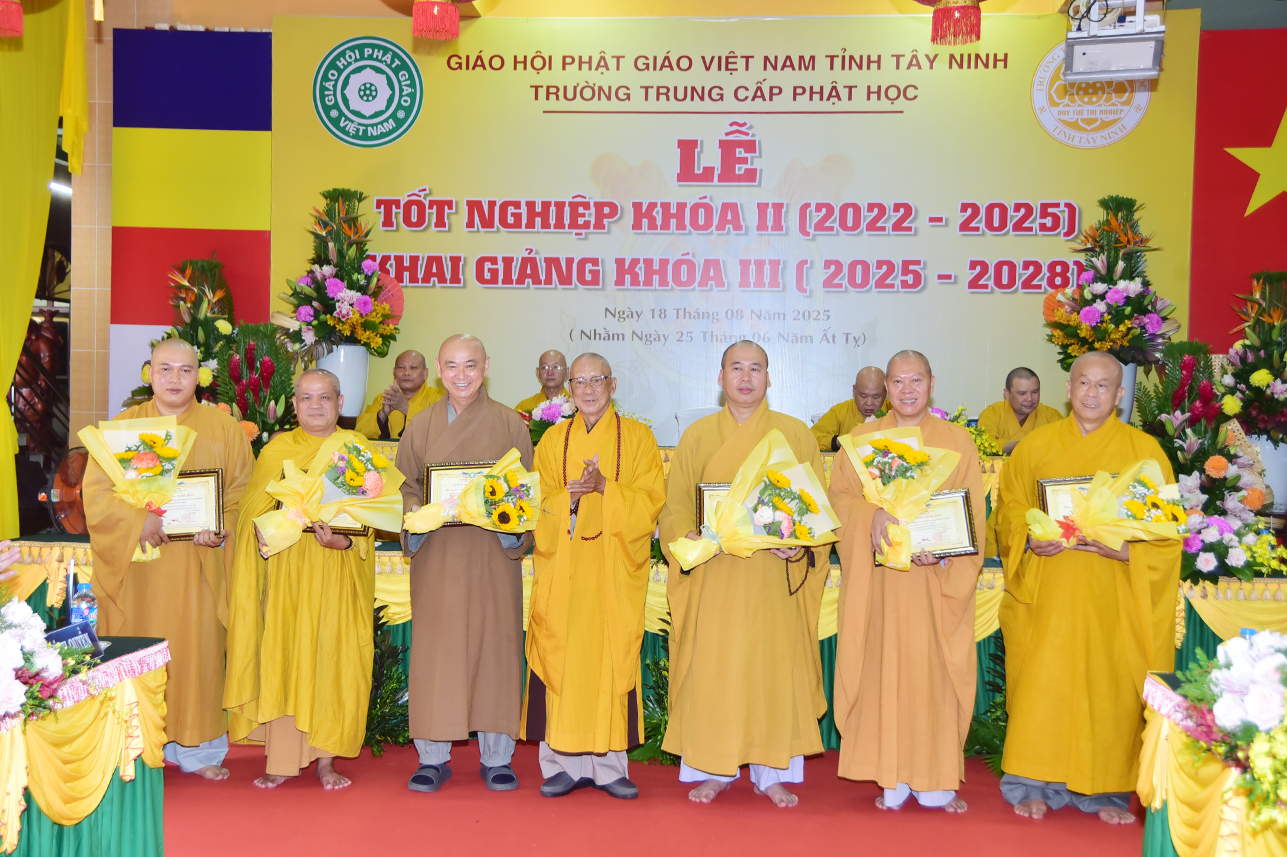 Nhân dịp này, Hội đồng Trị sự GHPGVN và Ban Giáo dục Phật giáo Trung ương đã trao tặng Bằng Tuyên dương công đức đến Trường Trung cấp Phật học Tây Ninh, Ban Giám hiệu, cùng HT. Thích Huệ Tâm – Hiệu trưởng và TT. Thích Thiện Thức – Phó Hiệu trưởng nhằm ghi nhận và tán dương những thành tích xuất sắc trong sự nghiệp giáo dục và đào tạo Tăng Ni.