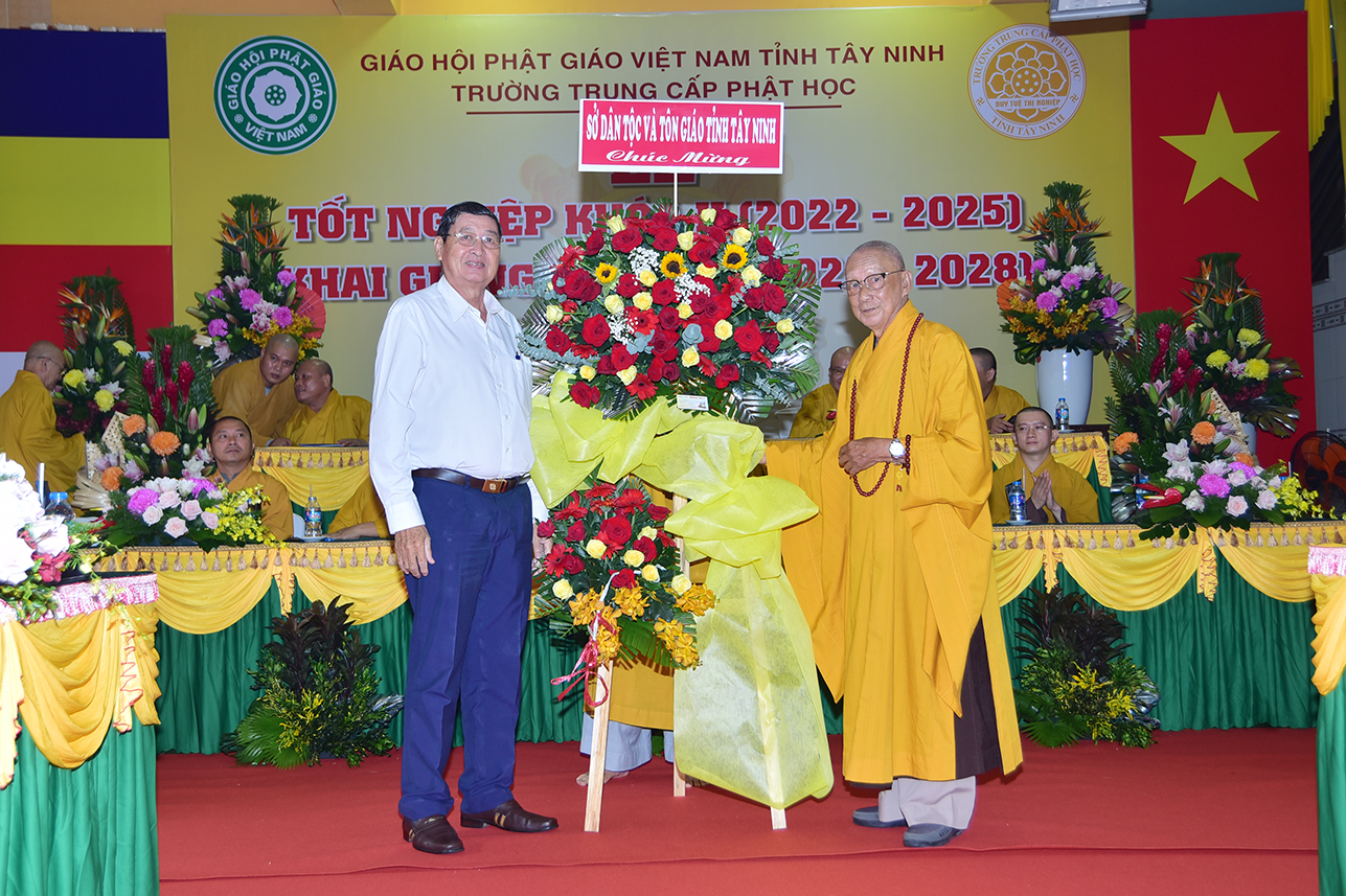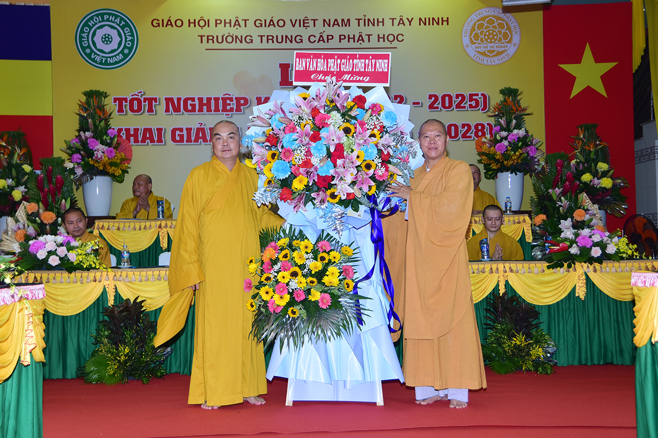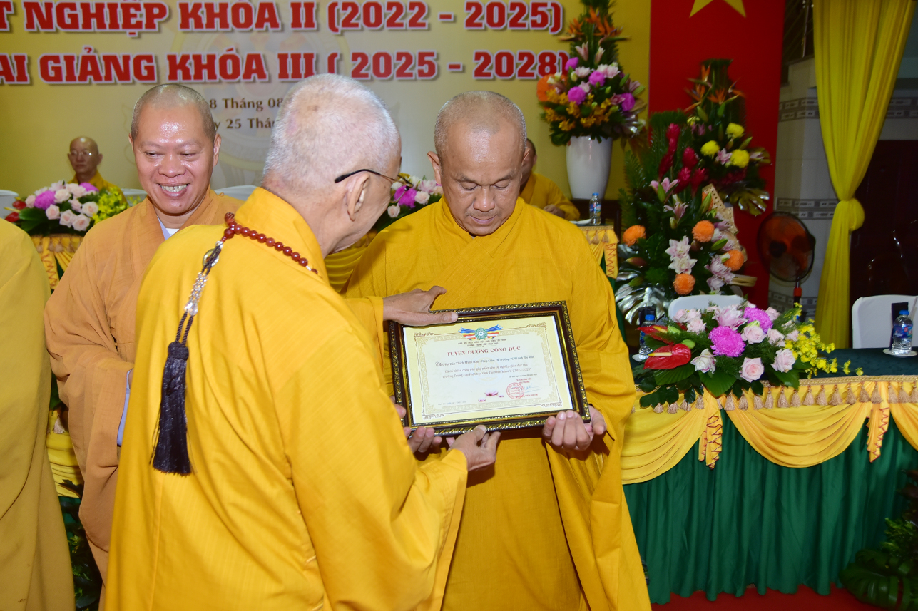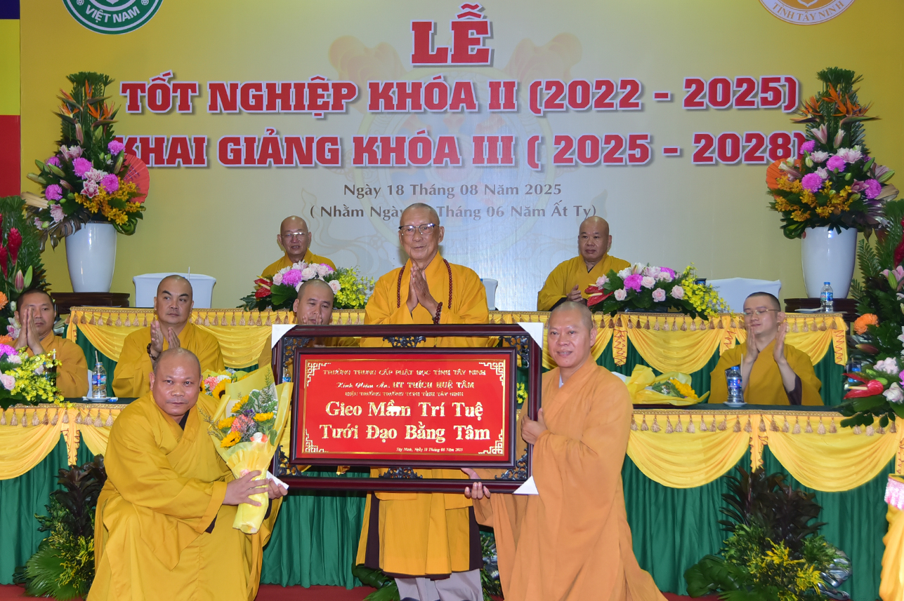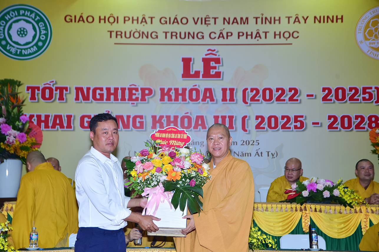 Nhân dịp này, Hội đồng Trị sự GHPGVN và Ban Giáo dục Phật giáo Trung ương đã trao tặng Bằng Tuyên dương công đức đến Trường Trung cấp Phật học Tây Ninh, Ban Giám hiệu, cùng HT. Thích Huệ Tâm – Hiệu trưởng và TT. Thích Thiện Thức – Phó Hiệu trưởng nhằm ghi nhận và tán dương những thành tích xuất sắc trong sự nghiệp giáo dục và đào tạo Tăng Ni.