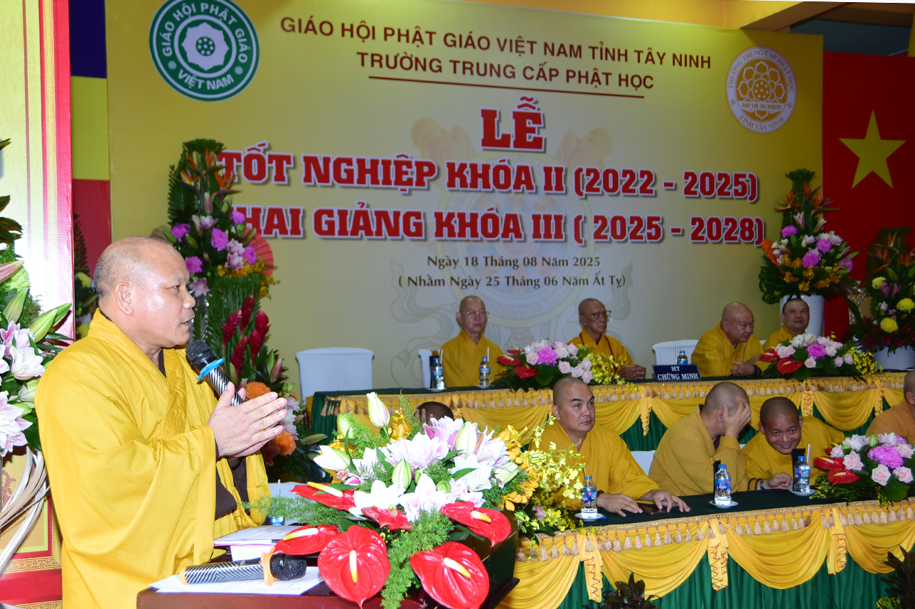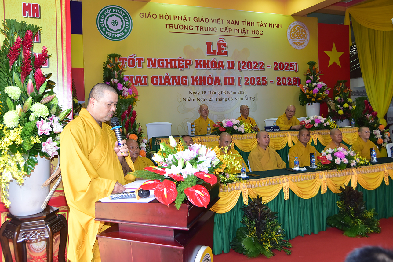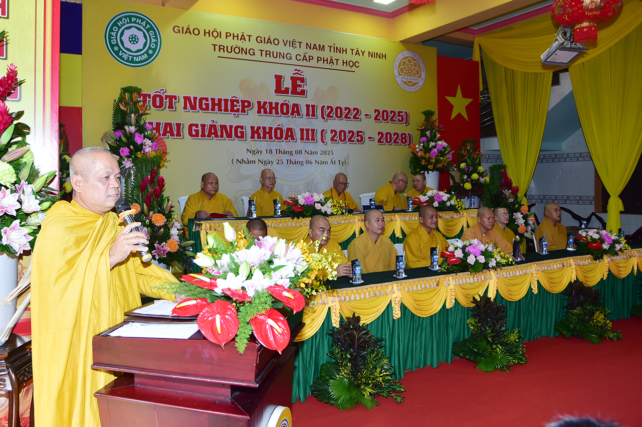 Ban lời đạo từ, TT. Thích Phước Đạt – Ủy viên Thường trực HĐTS, Phó Trưởng Ban Thường trực Ban Giáo dục Phật giáo GHPGVN tán thán công đức của Ban Giám hiệu Trường TCPH Tây Ninh cùng sự nỗ lực tu học của Tăng Ni sinh trong suốt thời gian qua. Thượng tọa nhấn mạnh, sự thành tựu của một khóa học là sự hòa hợp của nhiều yếu tố: sự tận tụy giảng dạy của chư Tôn đức Giáo thọ, sự nâng đỡ của Ban Bảo trợ, sự hỗ trợ của chính quyền địa phương và nhất là tinh thần tinh tấn, cầu học nơi Tăng Ni sinh. Thượng tọa cũng khuyến tấn Tăng Ni sinh sau khi tốt nghiệp cần tiếp tục nuôi dưỡng đạo tâm, lấy trí tuệ làm sự nghiệp, góp phần hoằng dương chánh pháp, phụng sự chúng sanh. Đồng thời, Thượng tọa kỳ vọng rằng khóa III sẽ tiếp nối truyền thống tốt đẹp, tiếp tục gặt hái nhiều thành tựu để Trường TCPH Tây Ninh trở thành môi trường giáo dục Phật học mẫu mực, đào tạo nên những thế hệ Tăng Ni có đầy đủ trí tuệ và đạo hạnh.