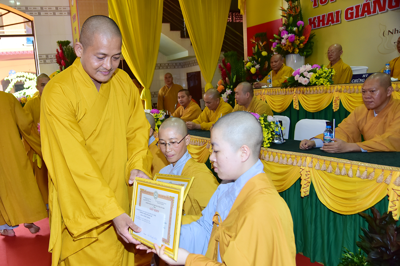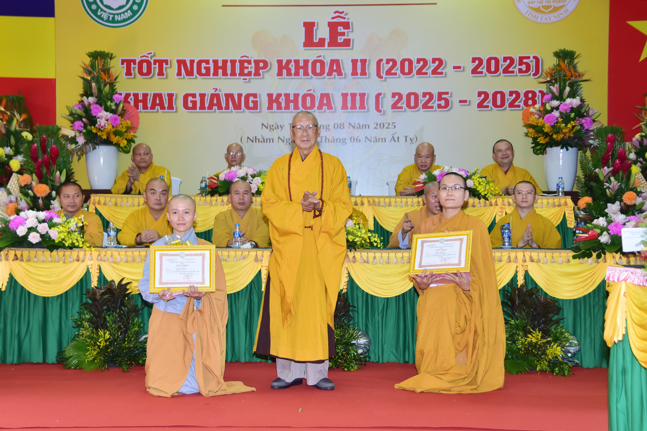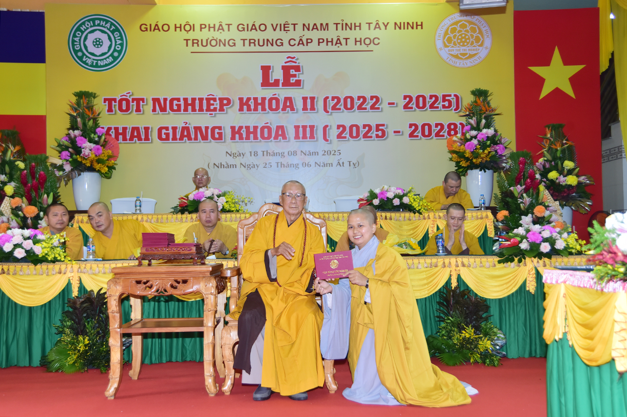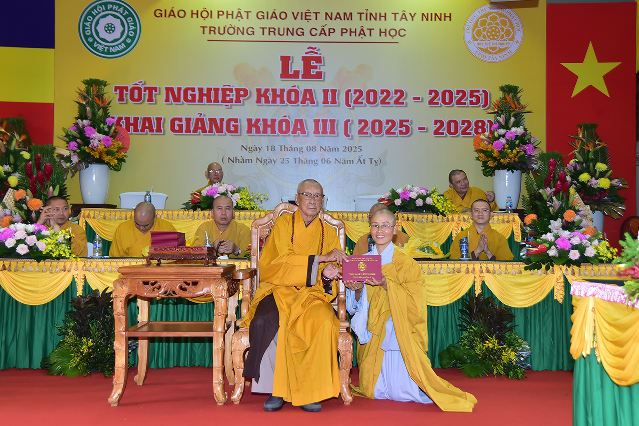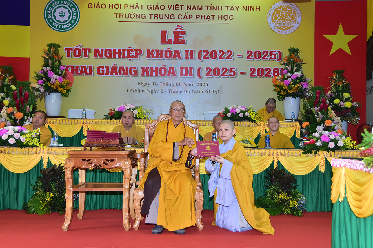 Tiếp đó, HT. Thích Huệ Tâm – Hiệu trưởng Trường TCPH Tây Ninh trao Chứng chỉ tốt nghiệp cho các Tăng Ni sinh, đánh dấu một thành tựu to lớn sau những năm tinh tấn học tập.