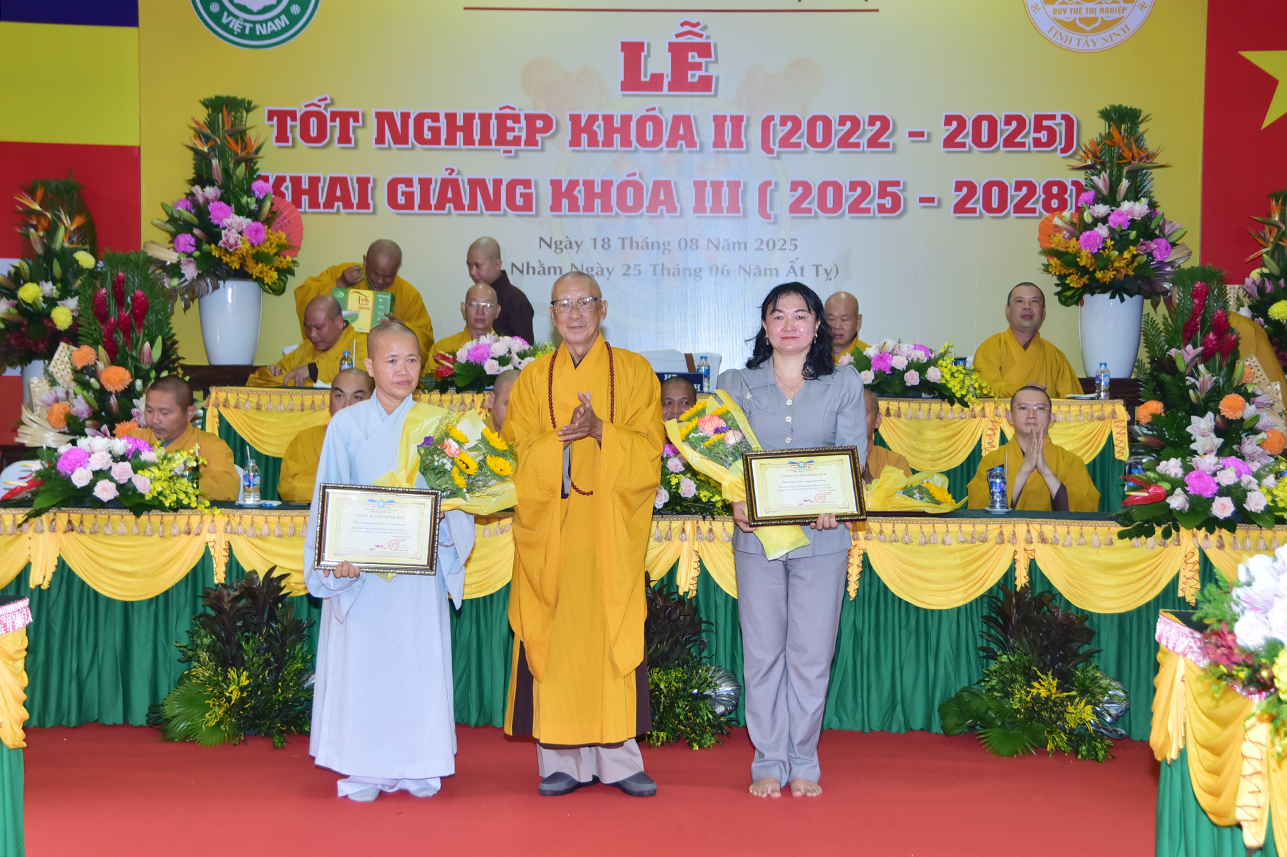 Ban Giám hiệu Trường TCPH Tây Ninh đã trân trọng ghi nhận và trao tặng Bằng Tuyên dương công đức đến Chư Tôn đức Giáo thọ, Giám thị và Ban Bảo trợ đã đóng góp cho sự nghiệp giáo dục Tăng Ni khóa II. Đồng thời, để khích lệ tinh thần học tập, Ban Giám hiệu cũng đã trao phần thưởng đến các Tăng Ni sinh có thành tích xuất sắc trong học tập cũng như tinh tấn phụng sự Tam bảo suốt khóa học.