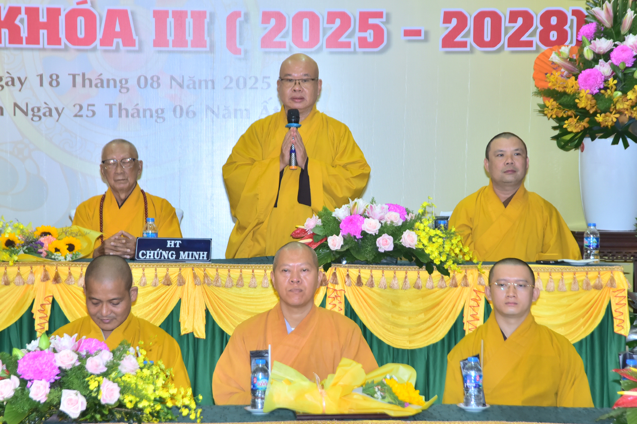 HT. Thích Huệ Tâm – Hiệu trưởng Trường TCPH Tây Ninh phát biểu khai mạc, bày tỏ niềm hoan hỷ khi Tăng Ni sinh khóa II đã hoàn thành hạnh nguyện học tập của mình sau ba năm rèn luyện và nay tiếp tục có thêm khóa III kế thừa. Hòa thượng nhấn mạnh, việc học tập của Tăng Ni không chỉ để mở mang tri thức mà còn nhằm nuôi dưỡng đạo hạnh, thực hành hạnh nguyện hoằng pháp lợi sinh, góp phần xây dựng Giáo hội ngày càng vững mạnh. Trường TCPH Tây Ninh được thành lập từ năm 2017, là thành quả của sự quan tâm sâu sát từ lãnh đạo chính quyền địa phương và công đức đóng góp của Thượng tọa trụ trì chùa Phước Thành – nơi đặt văn phòng trường. Nhờ những nhân duyên thù thắng ấy, ngôi trường trở thành mái nhà chung để Tăng Ni sinh chuyên tâm trau dồi kiến thức, vun bồi đạo lực và phụng sự đạo pháp, dân tộc.