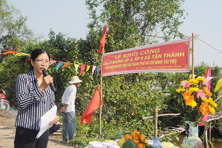 Bà Lê Thị Thu Hà- Phó chủ tịch UBND xã Tân Thành phát biểu tri ân Chư tôn đức chứng minh tham dự. Bà bày tỏ những những khó khăn của Chính Quyền và nhân dân địa phương trong việc xây dựng cơ sở hạ tầng. Bà nêu ý nghĩa và tầm quan trọng của cây cầu Lò Đường đối với đời sống bà con nhân dân. Cuối lời bà cảm niệm tri ân sâu sắc đến Chư tôn đức, nhà tài trợ tham dự buổi lễ và kính chúc sức khỏe đến toàn thể mọi người.