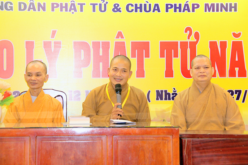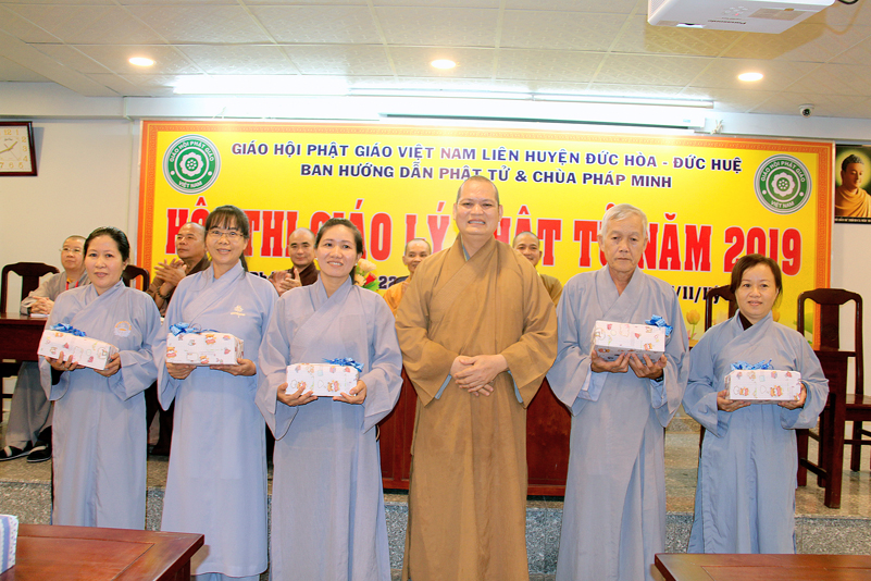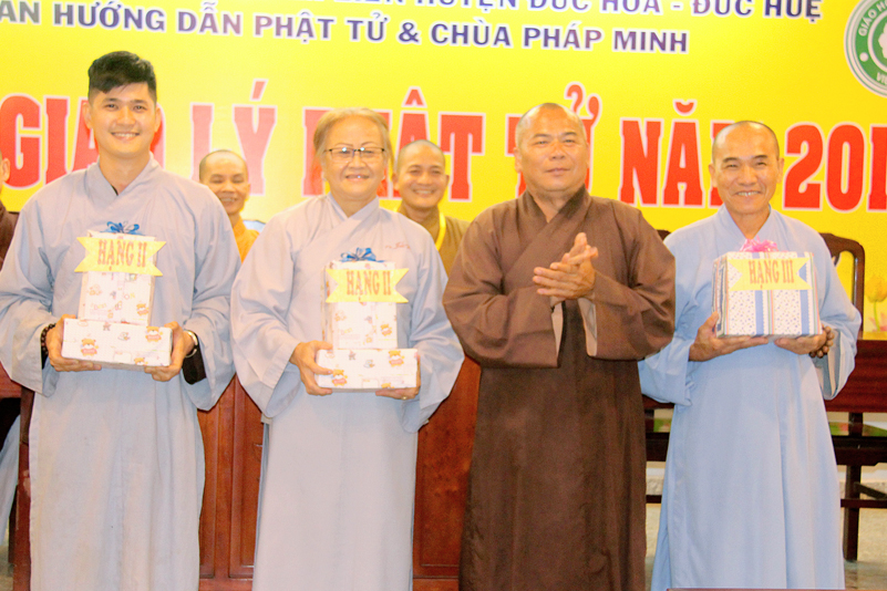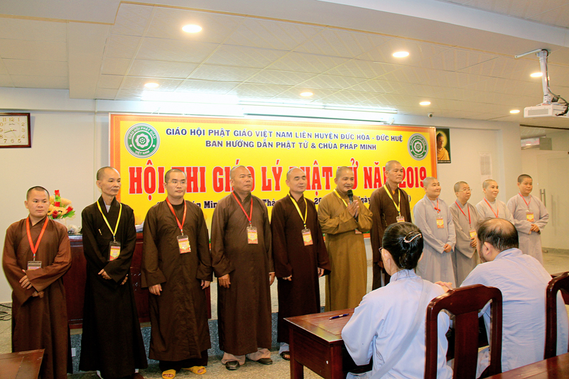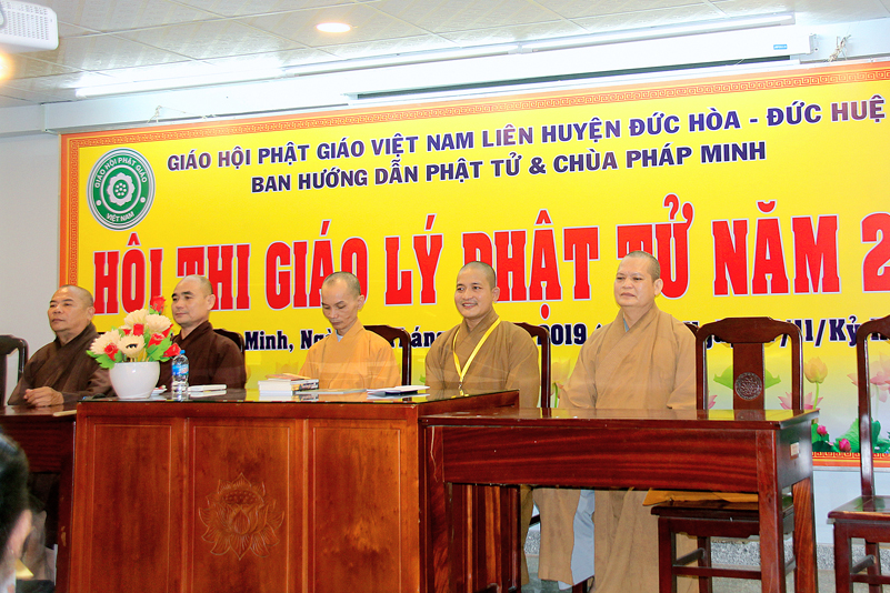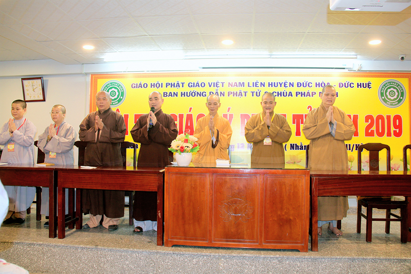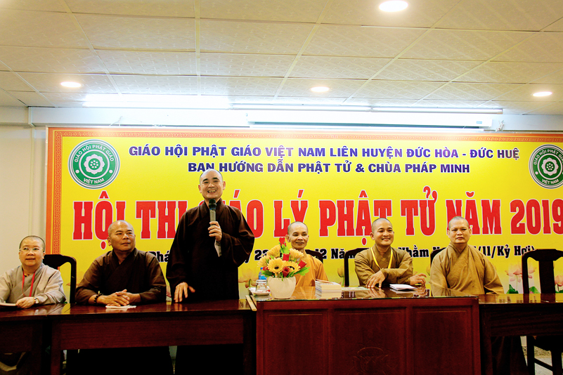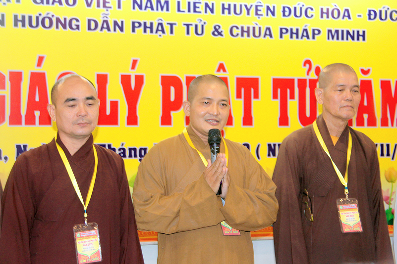 Lời đầu tiên, ĐĐ.Thích Lệ Duyên thay mặt Chư tôn đức đảnh lễ tri ân HT. Thích Minh Thiện Trưởng ban Trị sự GHPGVN tỉnh Long An cùng chư tôn đức Ban Trị sự GHPGVN tỉnh Long An-Ban Trị sự GHPGVN Liên huyện Đức Hòa-Đức Huệ đã luôn động viên, quan tâm khích lệ tinh thần để Ban hướng dẫn nam nữ Phật tử huyện nhà và chùa Pháp Minh hoàn thành tốt Phật sự trong năm 2019. Đại đức cũng gởi lời tri ân và tán thán đến các đơn vị huyện (Đức Hòa-Đức Huệ, Châu Thành, Thủ Thừa, Tân Thạnh, Cần Giuộc), chư tôn đức trụ trì các tự viện trên địa bàn tỉnh đã hưởng ứng và hướng dẫn Phật tử về tham dự Hội thi giáo lý. Đại đức cũng có lời khen tặng đến quý Phật tử đã vì tinh thần cầu học, tìm hiểu Phật pháp, muốn có được những trải nghiệm để có thể làm lợi ích cho mình và cho người.