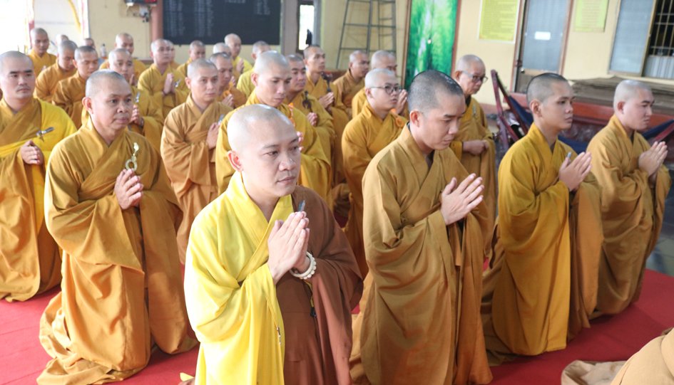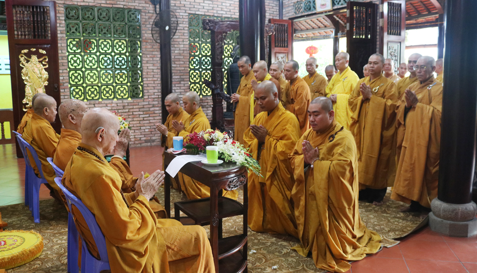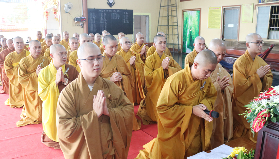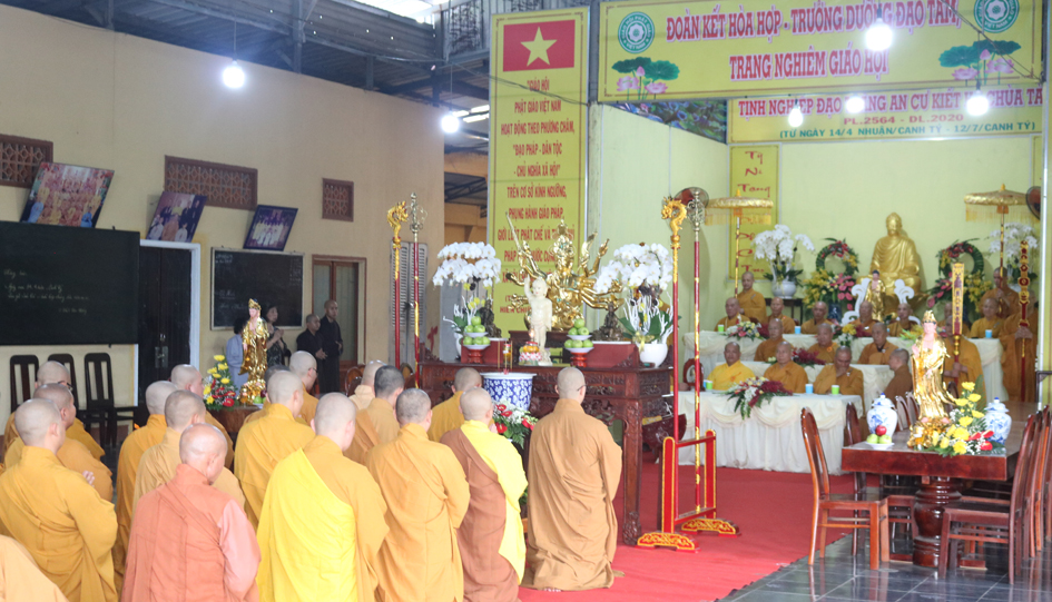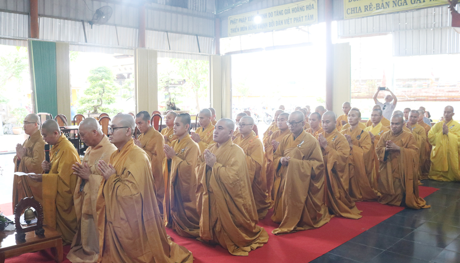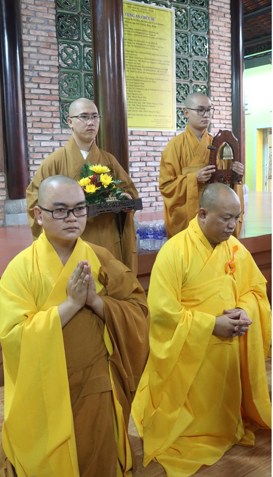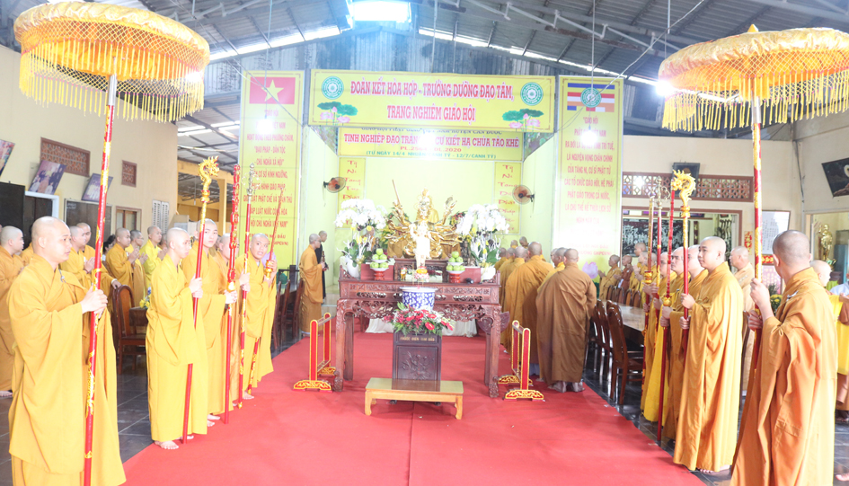 Kết thúc buổi Khai giảng, Ban chức sự Hạ trường nhất tâm cung thỉnh Hòa thượng Thích Thiện Phước – CM BTS GHPGVN Quận 6 TPHCM, HT Thích Bửu Ứng – Trưởng BTS GHPGVN Huyện Cần Đước, HT Thích Tâm Nguyên – Trưởng BPC BTS GHPGVN Huyện Cần Đước, HT Thích Giác Hạnh – CM BTS GHPGVN Tỉnh Bà Rịa – Vũng Tàu, tứ vị Hòa thượng chủ trì nghi thức đối thủ An cư cho chư Hành giả Hạ trường.