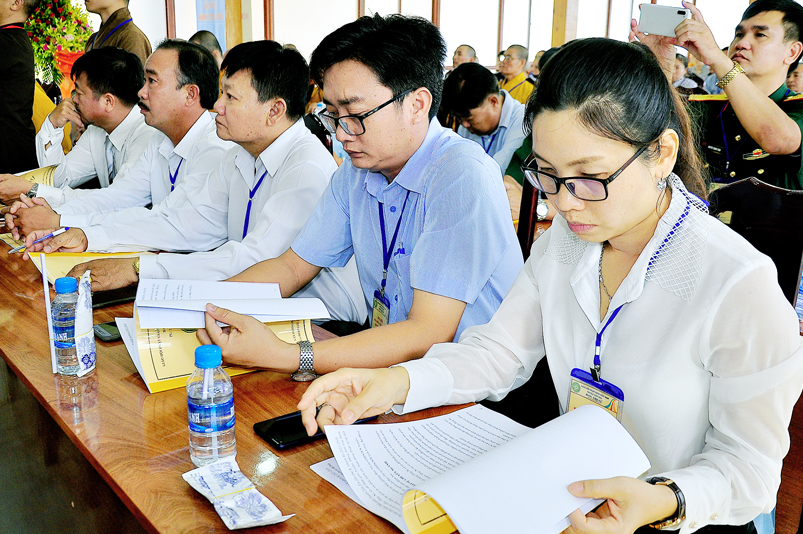 Đại đức Thích Huệ Chơn- Phó Thường trực Ban Trị sự Phật giáo huyện Tân trụ , thay mặt Ban Thư ký trình bày dự thảo Nghị quyết Đại hội và được Hòa thượng Thích Minh Thiện lấy ý kiến biểu quyết Đại hội thông qua Nghị quyết Đại hội gồm có 8 Điều