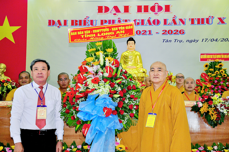 Sau phát biểu khai mạc Đại Hội, Hoà thượng Thích Từ Thiện đã đón nhận nhiều lẵng hoa chúc mừng từ Chư Tôn đức Ban Chứng minh, Ban Thường trực Ban Trị sự tỉnh, quý lãnh đạo tỉnh Long An, huyện Tân Trụ trao tặng.