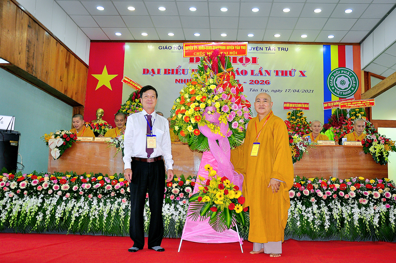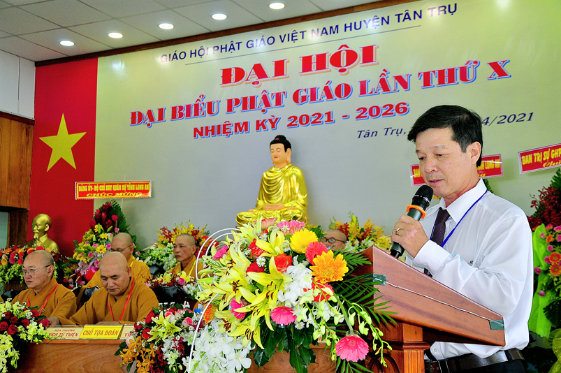 Đại hội vinh dự ghi nhận ý kiến phát biểu của Ông Trịnh Phước Trung – Phó Chủ tịch UBND huyện. Trong không khí trang nghiêm, đoàn kết thắm tình đạo, đời của đại hội, đến dự đại hội, thay mặt huyện ủy – HĐND – UBND – UBMTTQ VN huyện Tân Trụ ông gởi đến chư tôn đức giáo phẩm cùng toàn thể quý vị đại biểu lời chúc mừng hoan hỷ, chúc Đại hội đại biểu Phật giáo huyện Tân Trụ lần thứ X , Nhiệm kỳ ( 2021 – 2026) thành công tốt đẹp. Ông tán thán những năm qua toàn thể Tăng Ni, Phật tử trong huyện đã khắc phục khó khăn để hoàn thành nhiều công tác Phật sự và thế sự quan trọng. Quý chư Tăng , Ni và Phật tử góp tích cực vào sự nghiệp xây dựng và bảo vệ tổ quốc, sự phát triển kinh tế, văn hóa, xã hội và quốc phòng an ninh của huyện, xây dựng khối đại đoàn kết ngày càng thêm vững mạnh.