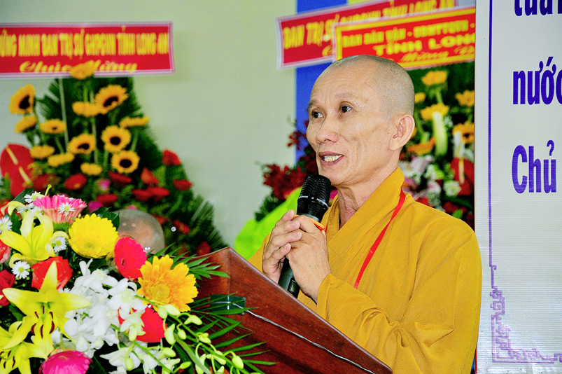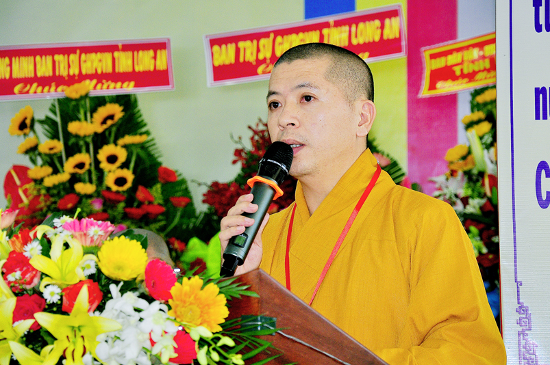 Đại đức Thích Thích Minh Đức- Trưởng Ban Trị sự Giáo hội Phật giáo huyện Tân Trụ thay mặt Ban Tổ chức phát biểu cảm tạ tri ân đến Chư Tôn đức, quý lãnh đạo Chánh quyền, Đại biểu và bế mạc Đại hội.