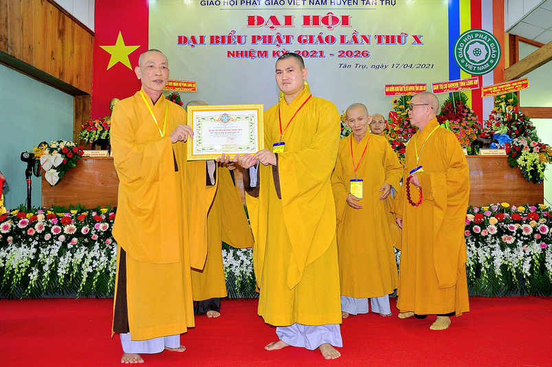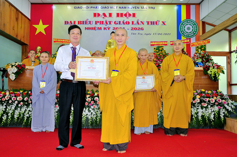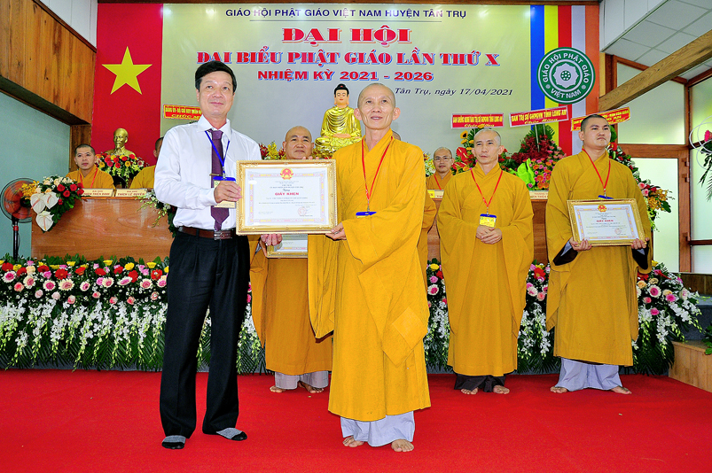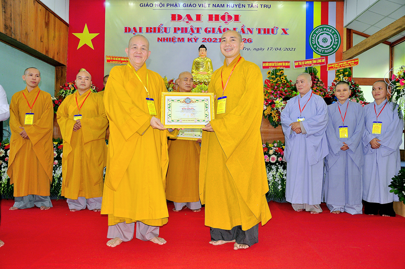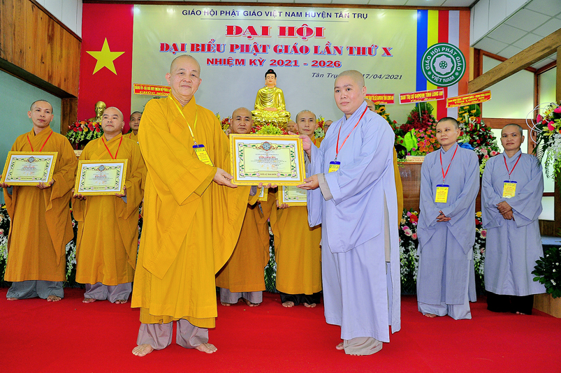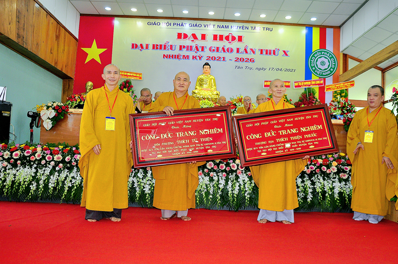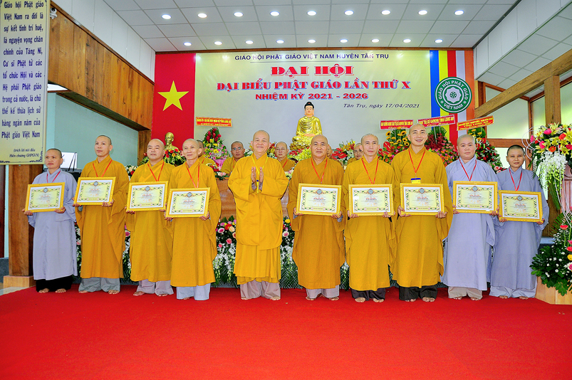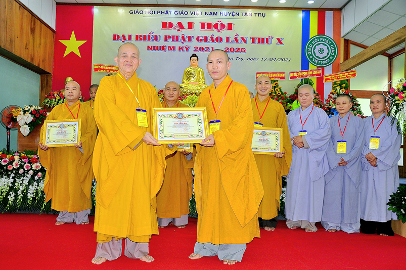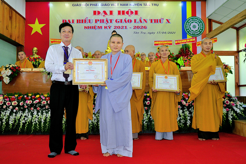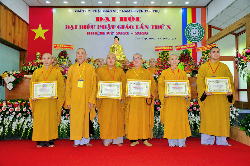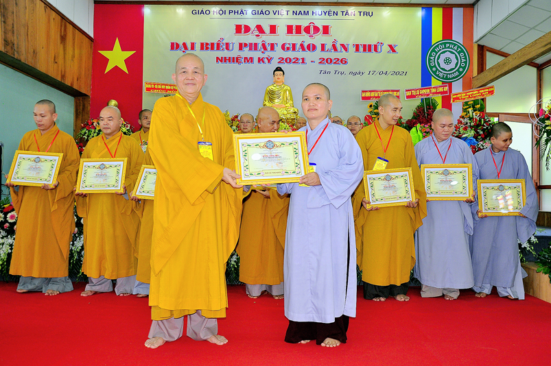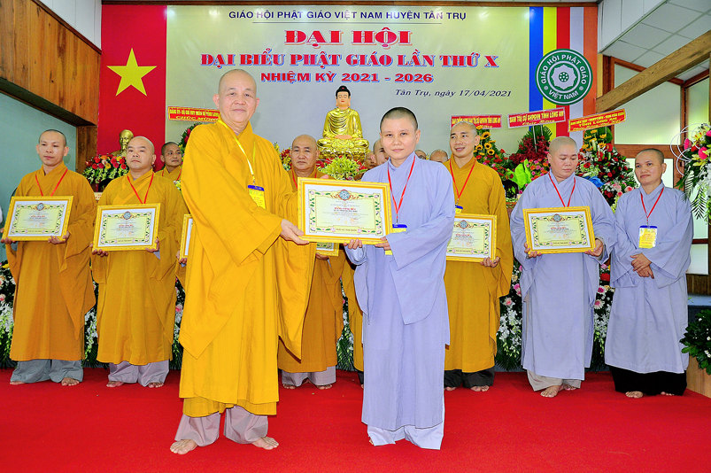 Dịp này, Thường trực BTS Phật giáo tỉnh và UBND tỉnh Long An đã trao tặng bằng tuyên dương công đức bằng khen cho tập thể, cá nhân hoàn thành xuất sắc nhiệm vụ công tác Phật sự trong nhiệm kỳ 2016 – 2021, để khích lệ đến chư Tăng Ni. Đồng thời, Ủy ban Nhân dân huyện Tân trụ cũng trao tặng bằng khen cho tập thể BTS. GHPGVN liên huyện Tân Trụ, nhiều cá nhân có thành tích tiêu biểu trong việc hướng dẫn tín đồ sống “Tốt đời, đẹp đạo”, những đóng góp tích cực, hoạt động Phật sự xuất sắc trong nhiệm kỳ cũ, góp sức vào sự nghiệp đại đoàn kết toàn dân tộc.
