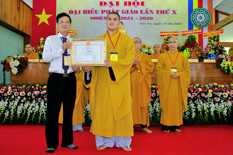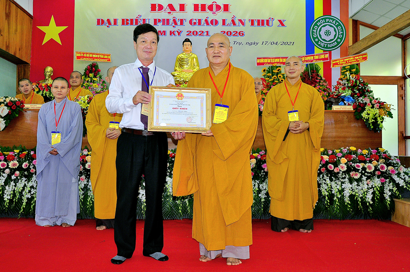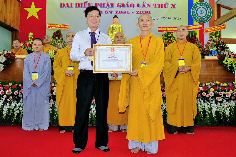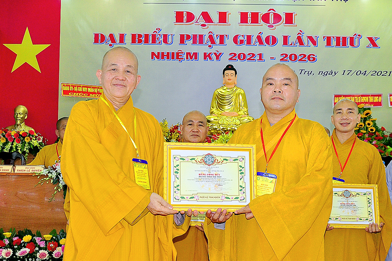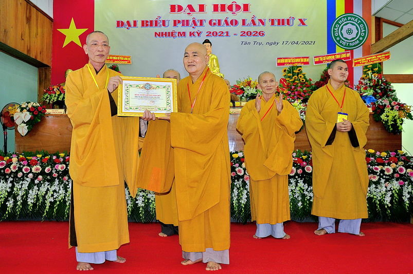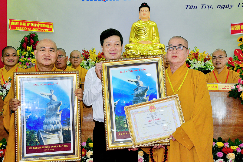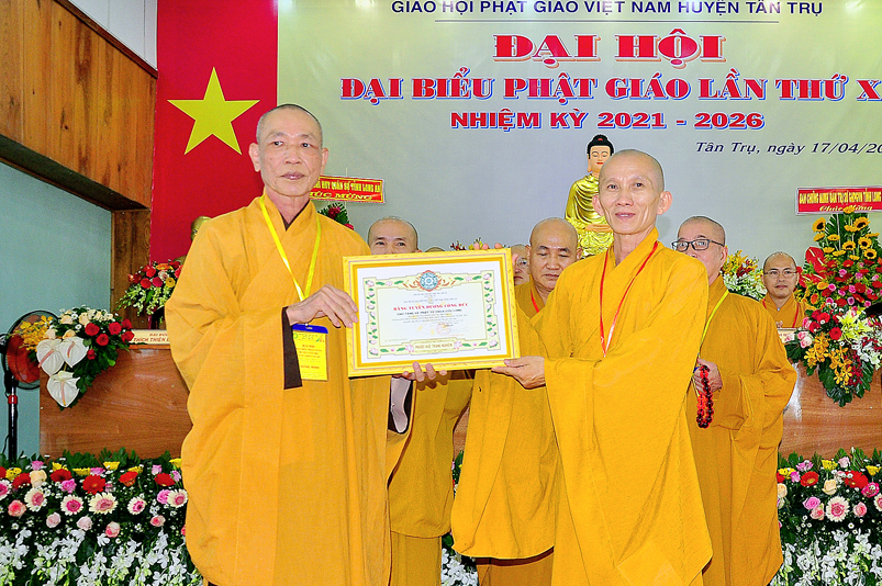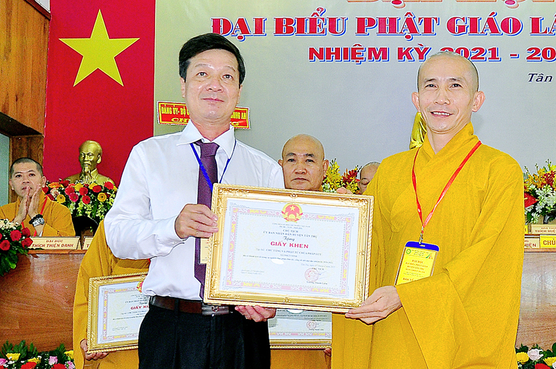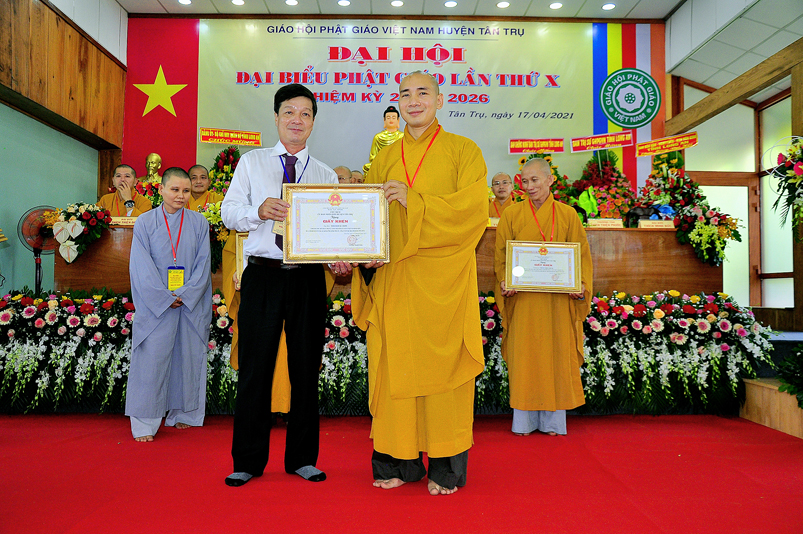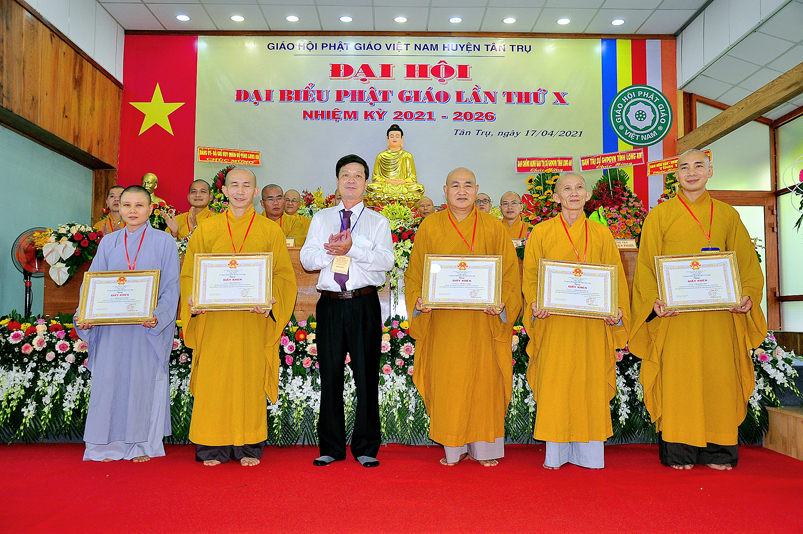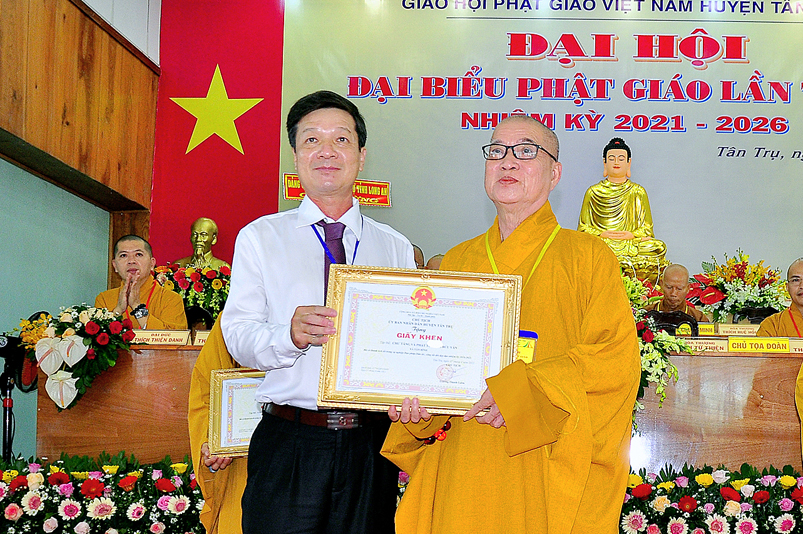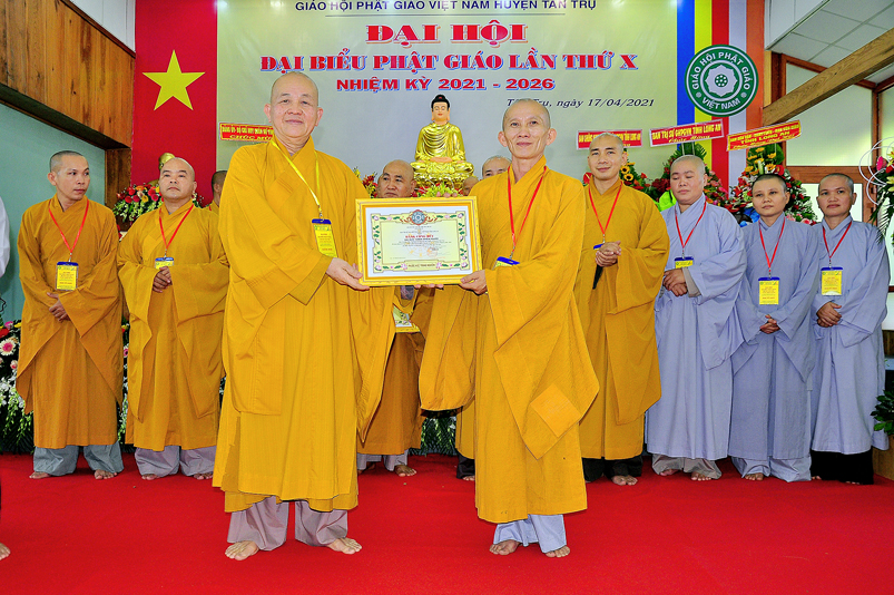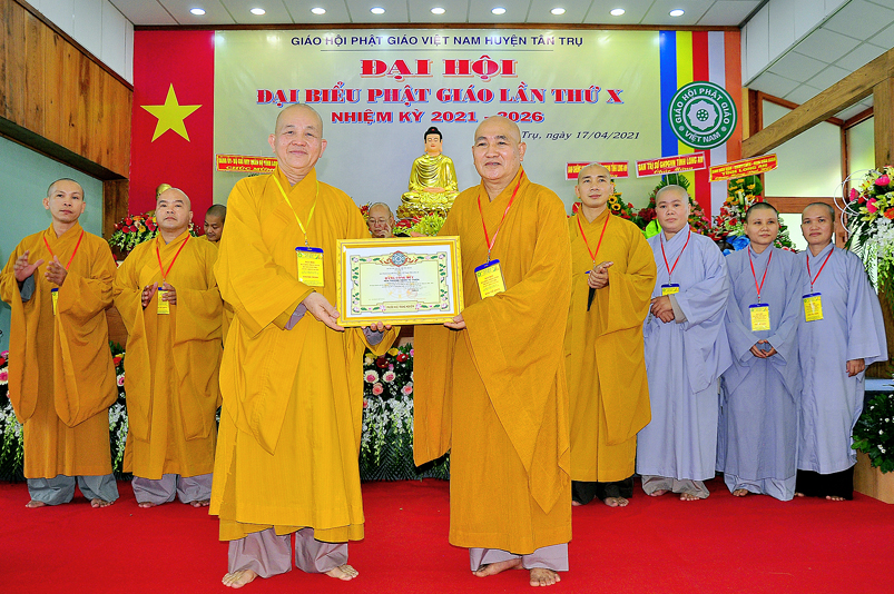 Dịp này, Thường trực BTS Phật giáo tỉnh và UBND tỉnh Long An đã trao tặng bằng tuyên dương công đức bằng khen cho tập thể, cá nhân hoàn thành xuất sắc nhiệm vụ công tác Phật sự trong nhiệm kỳ 2016 – 2021, để khích lệ đến chư Tăng Ni. Đồng thời, Ủy ban Nhân dân huyện Tân trụ cũng trao tặng bằng khen cho tập thể BTS. GHPGVN liên huyện Tân Trụ, nhiều cá nhân có thành tích tiêu biểu trong việc hướng dẫn tín đồ sống “Tốt đời, đẹp đạo”, những đóng góp tích cực, hoạt động Phật sự xuất sắc trong nhiệm kỳ cũ, góp sức vào sự nghiệp đại đoàn kết toàn dân tộc.