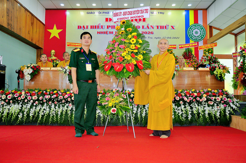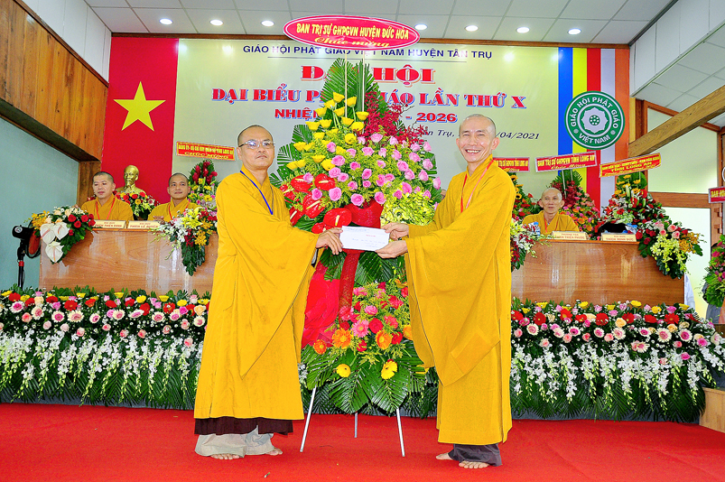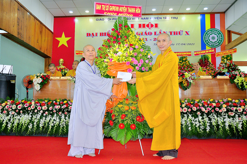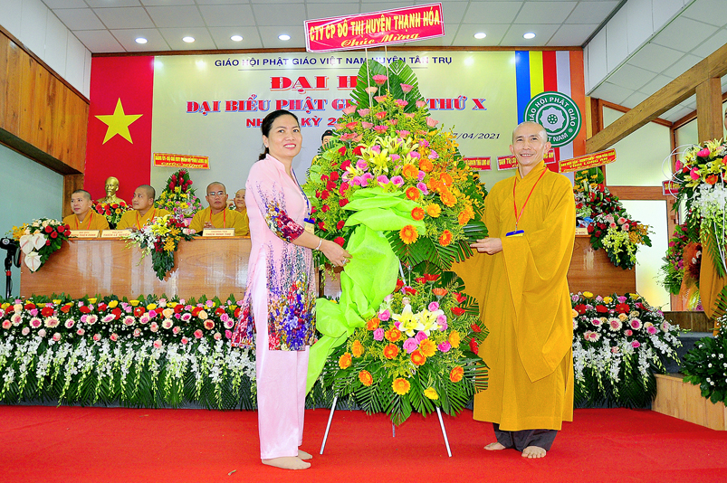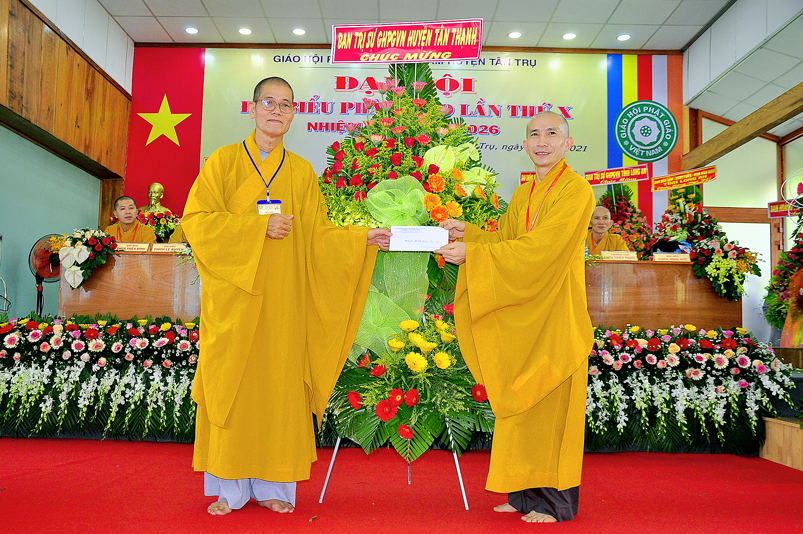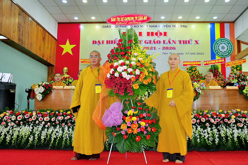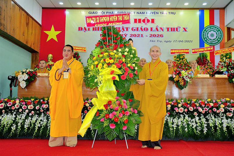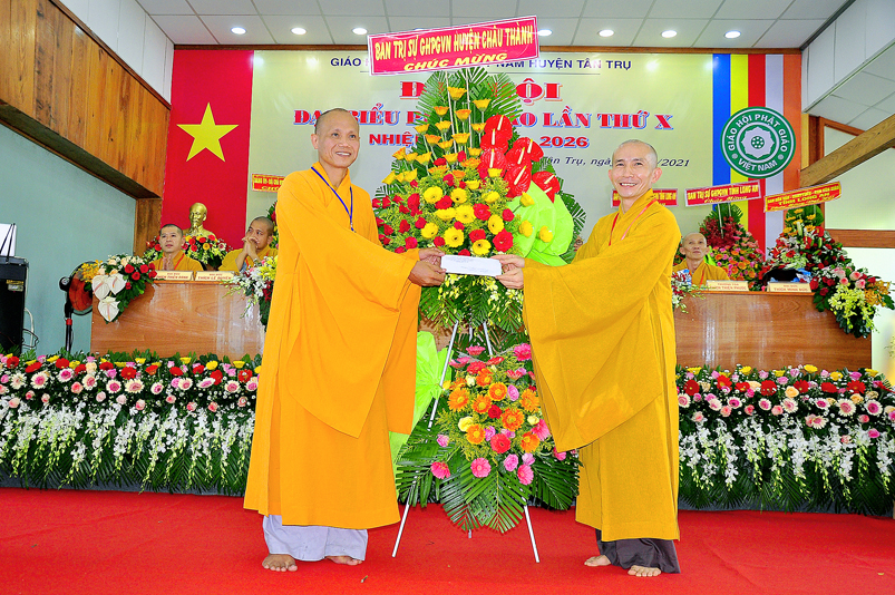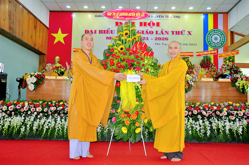 Tại Đại hội, Hoà thượng Thích Minh Thiện đã trao con dấu và tặng khánh vàng chúc mừng đến tân Ban Trị sự. Ban tổ chức đón nhận nhiều lẵng hoa cao quý của Ban Trị sự các huyện, thị, thành phố trực thuộc Phật giáo Long An, lãnh đạo chính quyền tỉnh và địa phương chúc mừng Đại hội Đại biểu GHPGVN huyện Tân Trụ nhiệm kỳ 2021 – 2026.