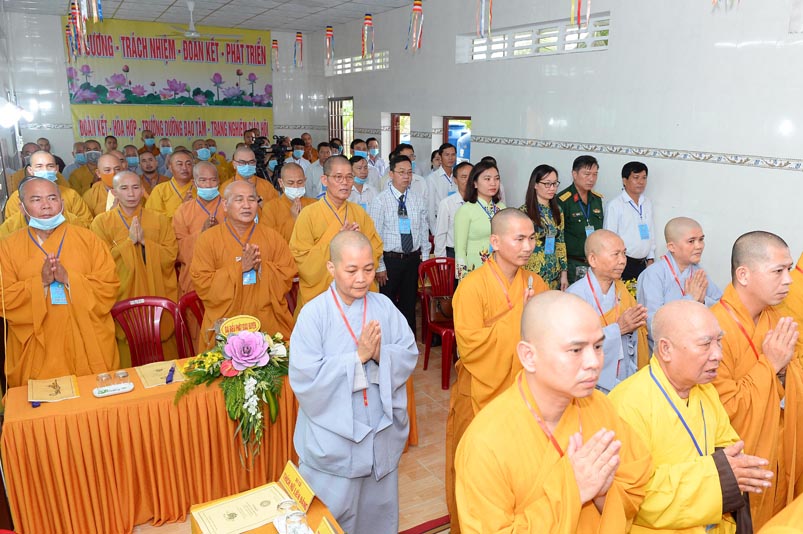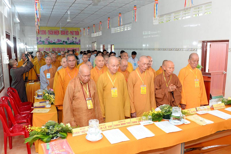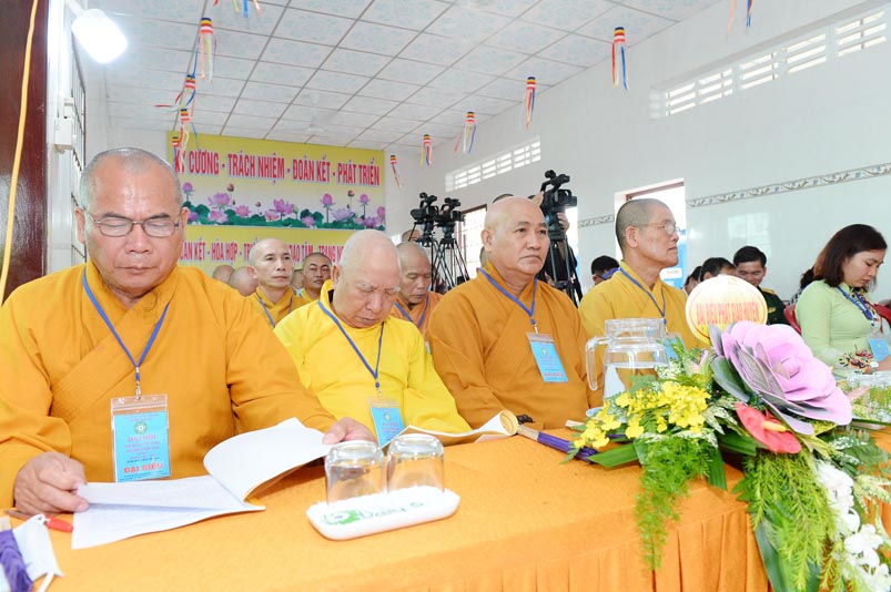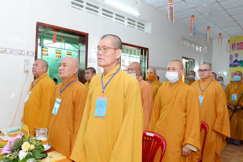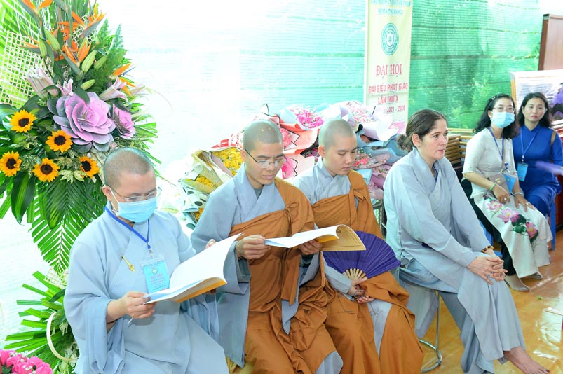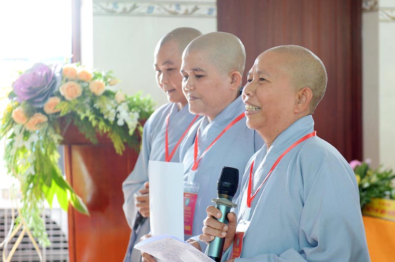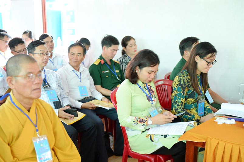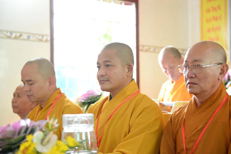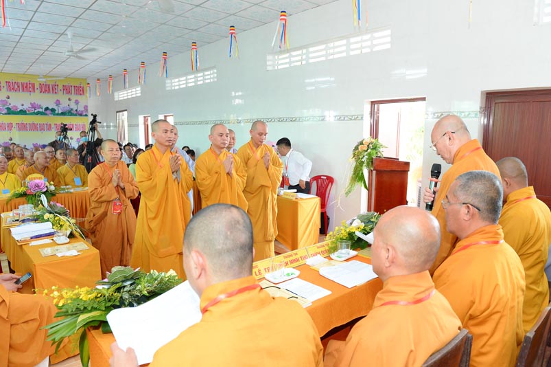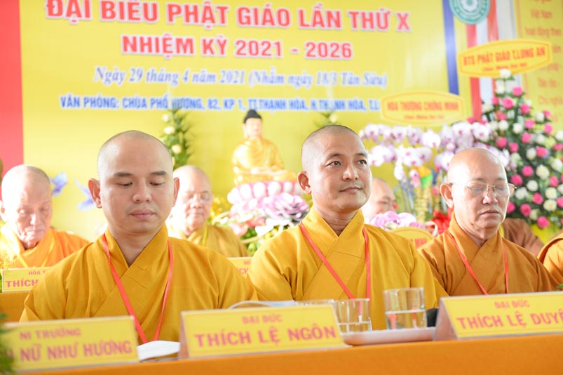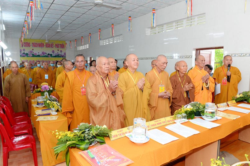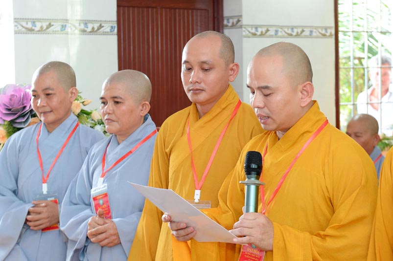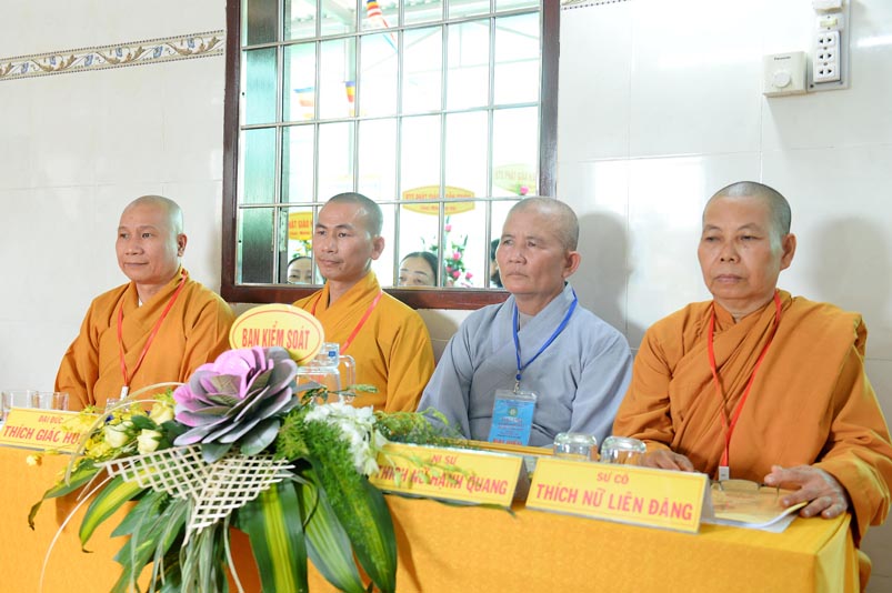 Hòa thượng Thích Minh Thiện- Trưởng Ban Trị sự GHPGVN tỉnh Long An, lấy ý kiến biểu quyết của Đại hội thông qua thành phần nhân sự. Chứng minh 4 vị: HT. Thích Huệ Hồng; Hoà thượng Thích Minh Thiện; HT. Thích Quảng Ý; Ni trưởng Thích Nữ Như Hương( Chứng minh phân ban Ni giới) . Đại hội suy cử ĐĐ. Thích Lệ Ngôn làm Trưởng Ban Trị sự, Trưởng Ban Tăng sự; ĐĐ. Thích Giác Huệ- Phó Ban Trị sự, Trưởng Ban Hướng dẫn Phật tử, Trưởng Ban Nghi lễ; Ni sư Thích nữ Huệ Cảnh- Phó Trưởng Ban,Trưởng Ban Từ thiện Xã hội ; Sư cô Thích nữ Liên Đăng- Phó Trưởng Ban, Trưởng Ban Kinh tế Tài chánh; ĐĐ. Thích Minh Tâm- Chánh Thư ký, Trưởng Ban Hoằng Pháp; Đại đức Thích Thiện Thành- Trưởng Ban Thông tin Truyền Thông; Sư cô Thích nữ An Liễu- Phó Thư Ký, Trưởng Ban Văn Hóa; Sư cô Thích nữ Hạnh Quang- Thủ quỹ.