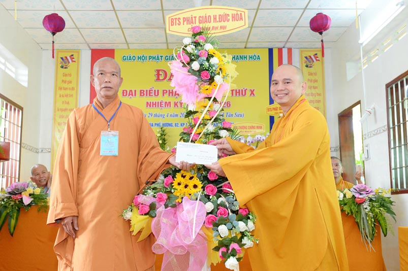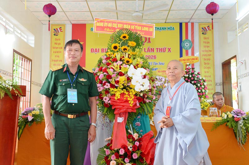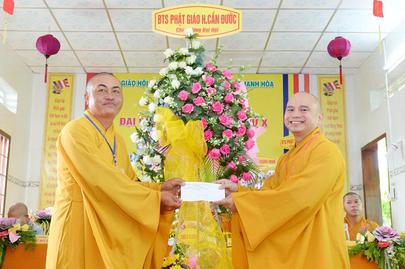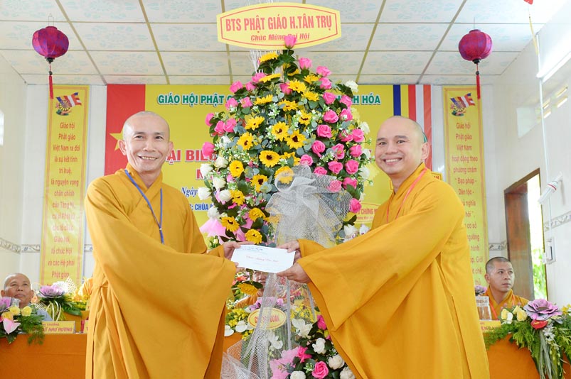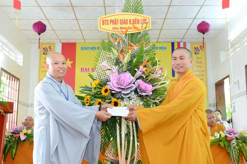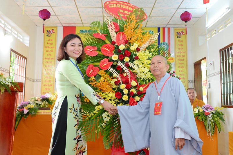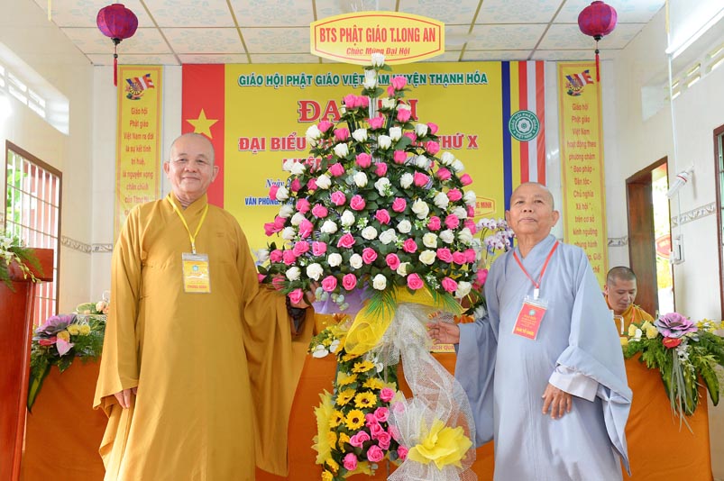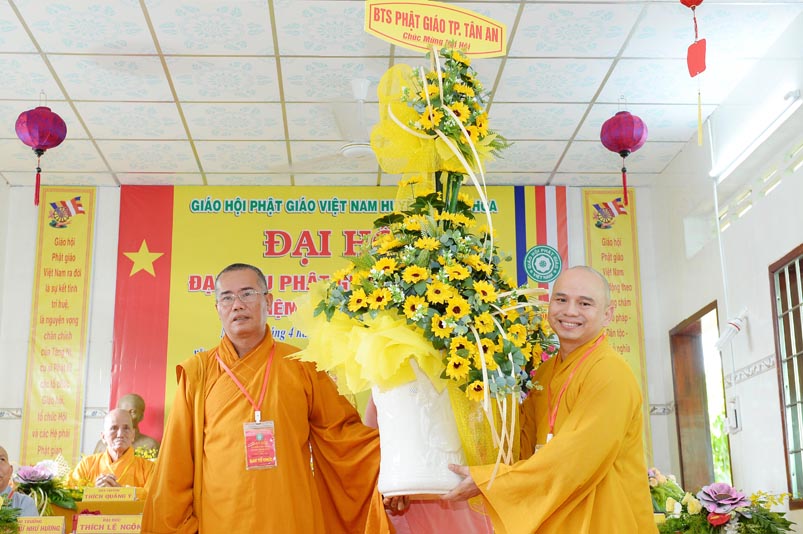 Hoà thượng Thích Minh Thiện đã trao con dấu và tặng khánh vàng tặng hoa chúc mừng đến tân Ban Trị sự. Ban tổ chức đón nhận nhiều lẵng hoa cao quý của Ban Trị sự các huyện, thị, thành phố trực thuộc Phật giáo Long An, lãnh đạo chính quyền địa phương chúc mừng Đại hội.