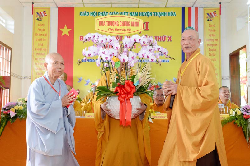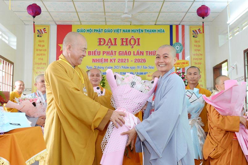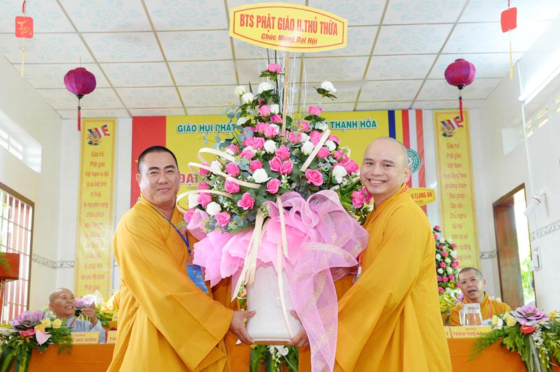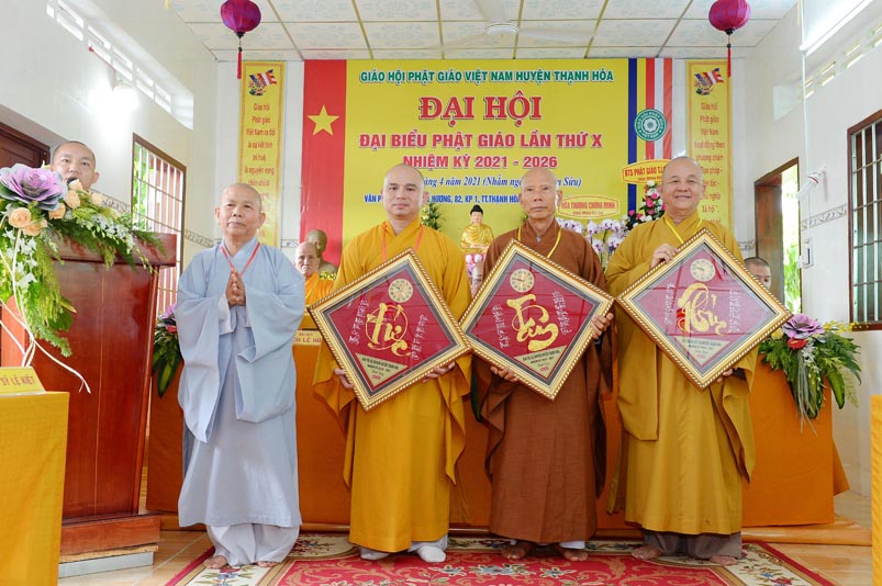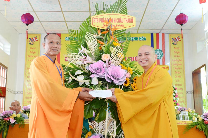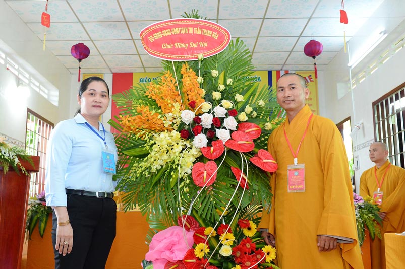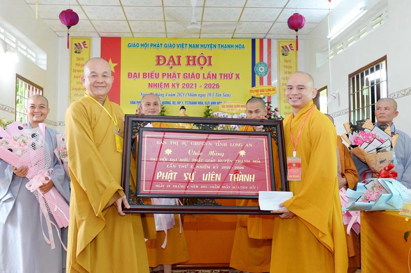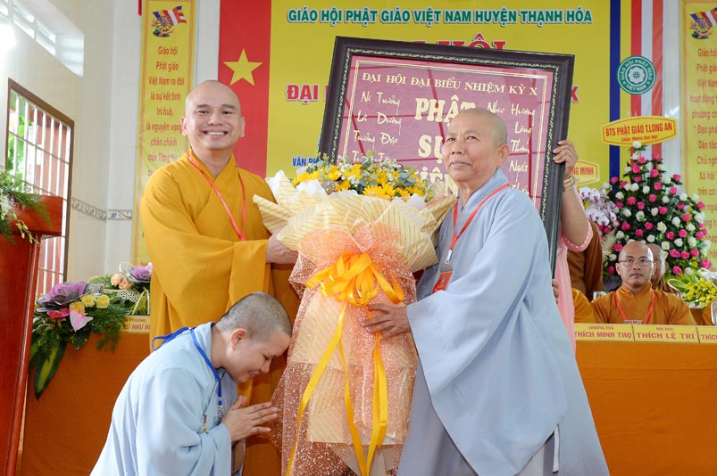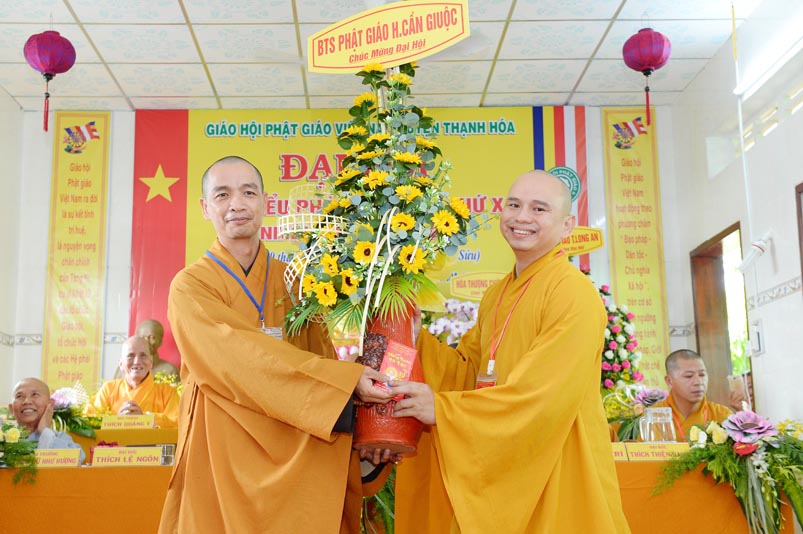 Hoà thượng Thích Minh Thiện đã trao con dấu và tặng khánh vàng tặng hoa chúc mừng đến tân Ban Trị sự. Ban tổ chức đón nhận nhiều lẵng hoa cao quý của Ban Trị sự các huyện, thị, thành phố trực thuộc Phật giáo Long An, lãnh đạo chính quyền địa phương chúc mừng Đại hội.