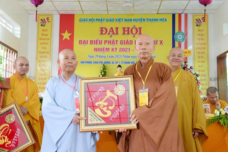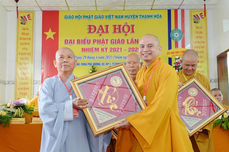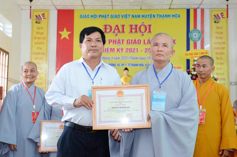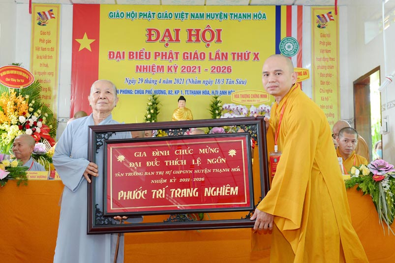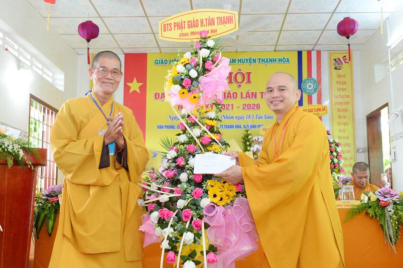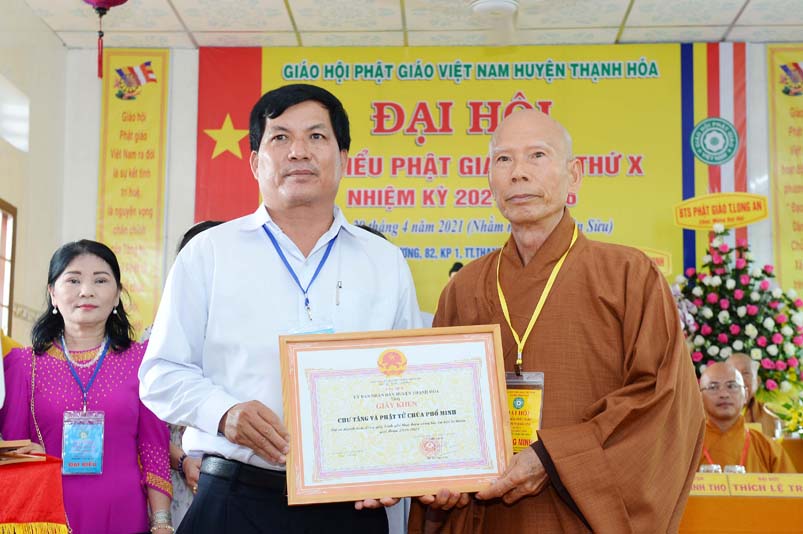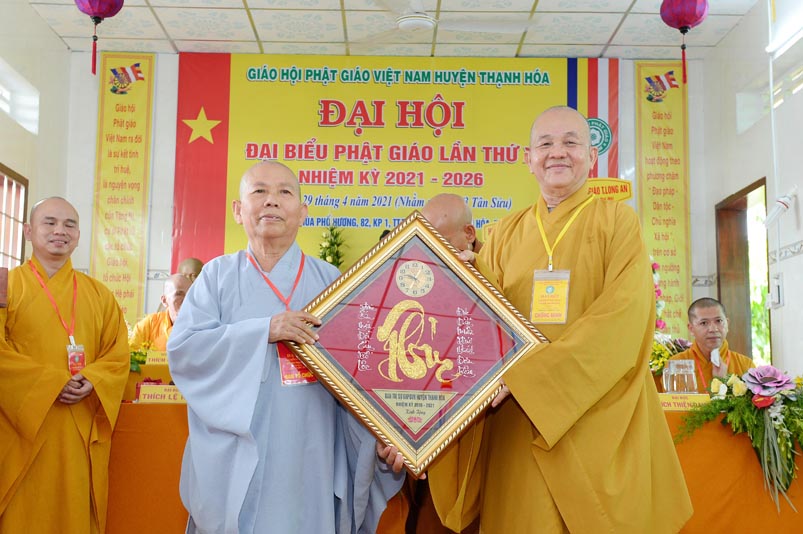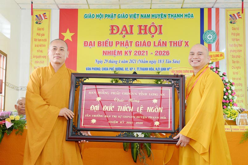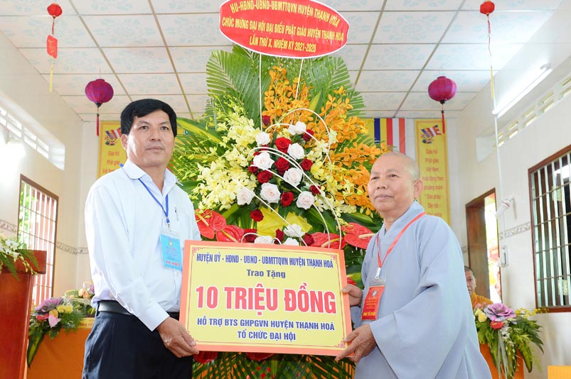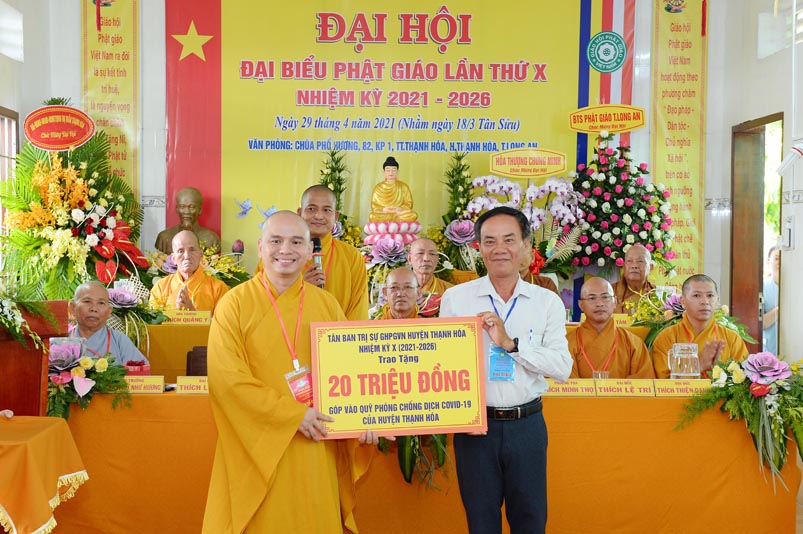Nhân Đại hội, đại diện Ban Trị sự huyện, Đại đức Thích Lệ Ngôn- Trưởng Ban Trị sự GHPGVN huyện Thạnh Hóa đã trao tặng số tiền 20 triệu đồng để ủng hộ chính quyền Huyện Thạnh Hóa trong công tác phòng chống dịch Covid cho ông Nguyễn Minh Trang- Phó chủ tịch UBMTTQ huyện Thạnh Hóa.