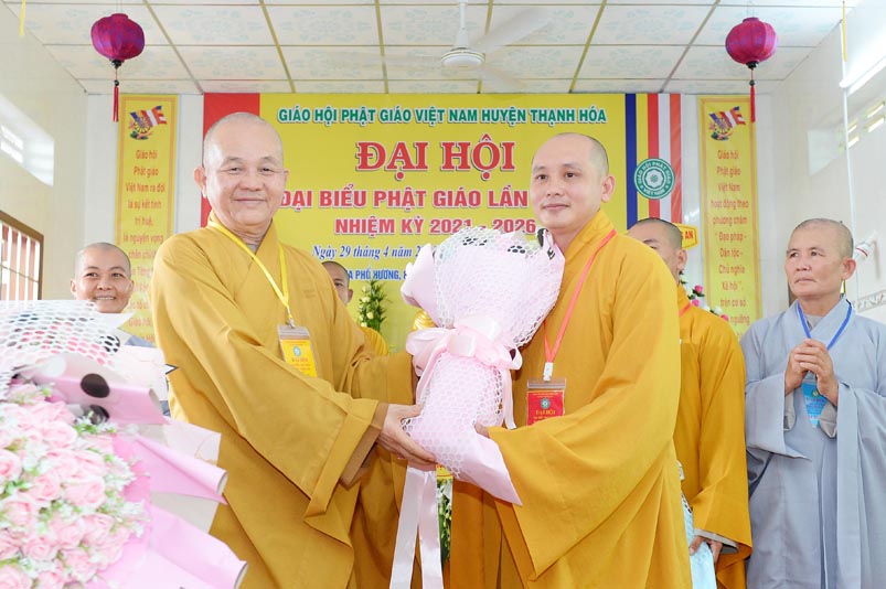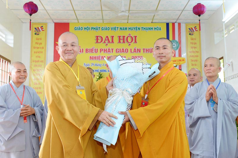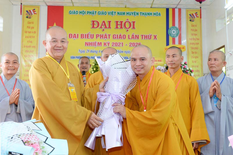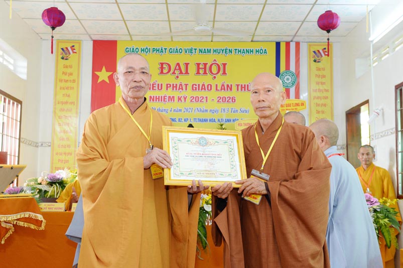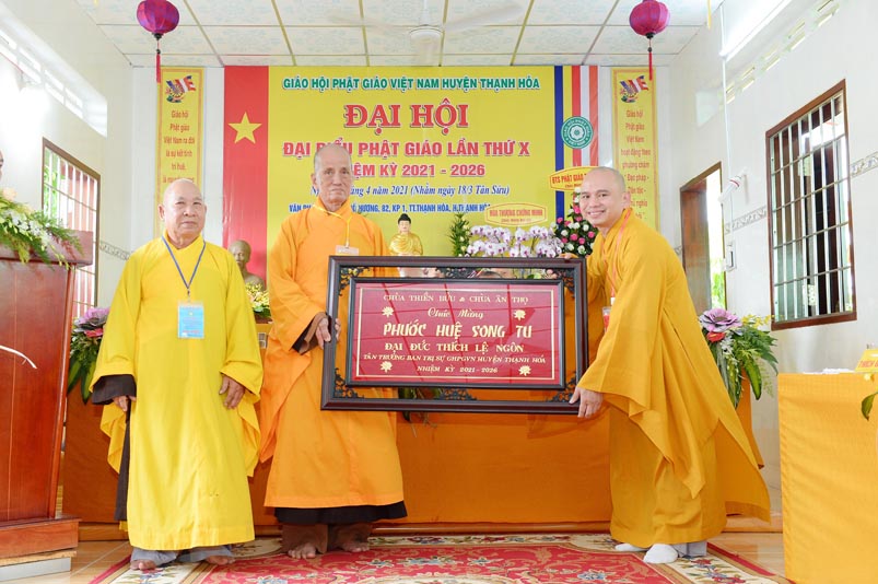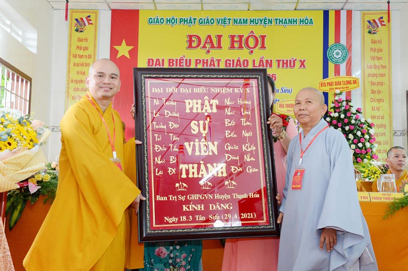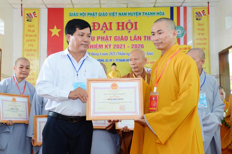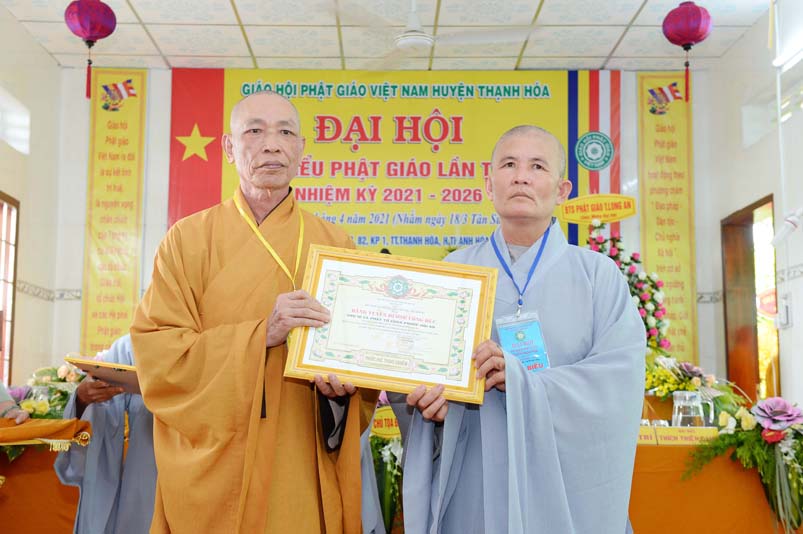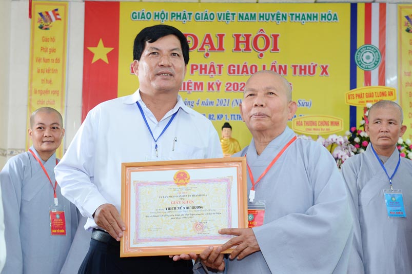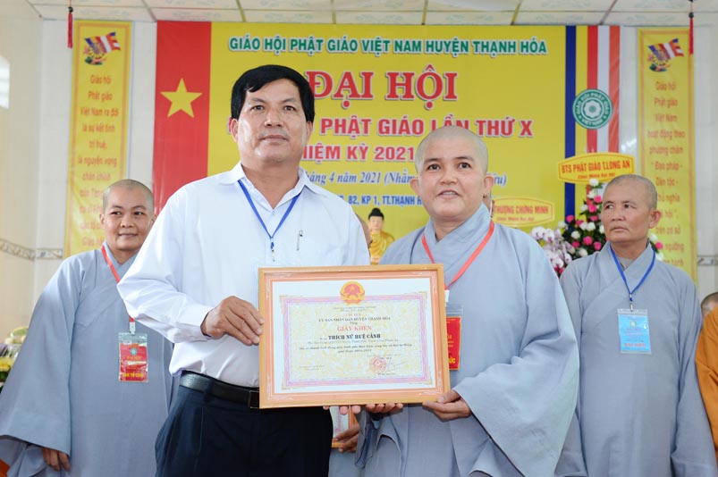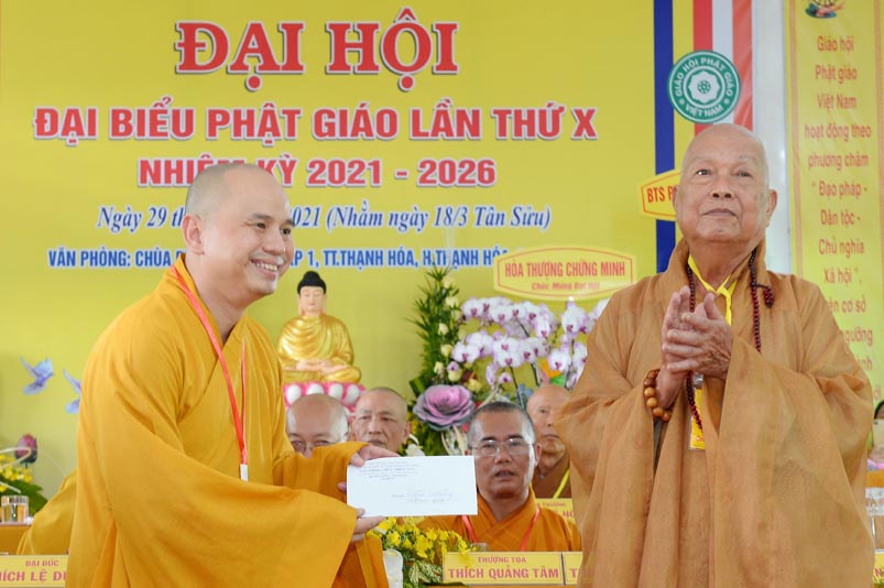 Nhân Đại hội, đại diện Ban Trị sự huyện, Đại đức Thích Lệ Ngôn- Trưởng Ban Trị sự GHPGVN huyện Thạnh Hóa đã trao tặng số tiền 20 triệu đồng để ủng hộ chính quyền Huyện Thạnh Hóa trong công tác phòng chống dịch Covid cho ông Nguyễn Minh Trang- Phó chủ tịch UBMTTQ huyện Thạnh Hóa.