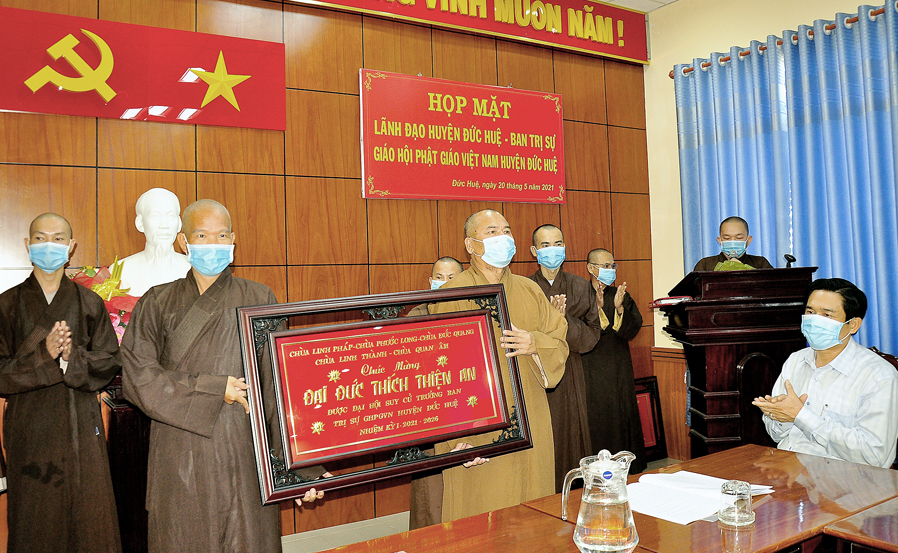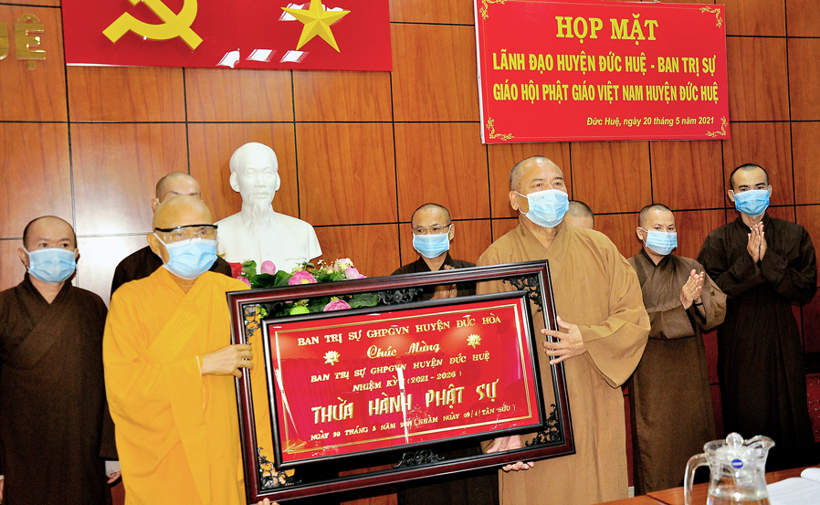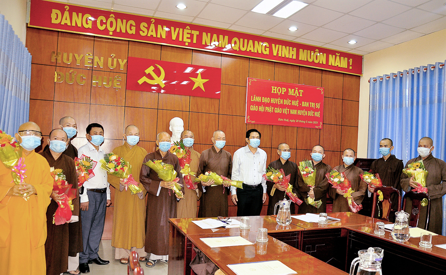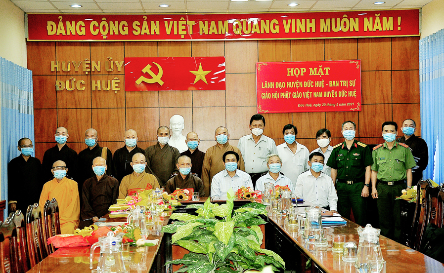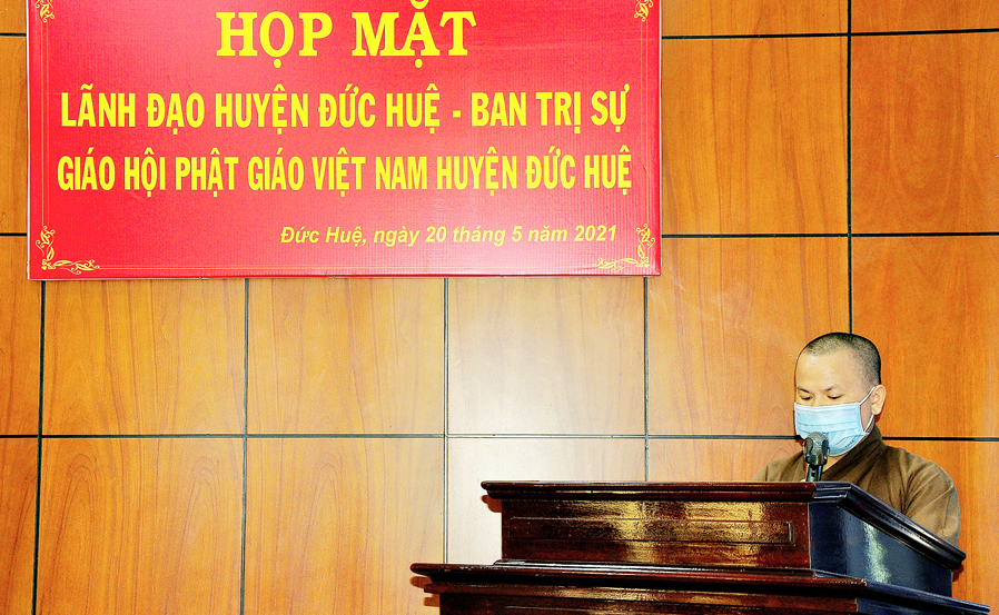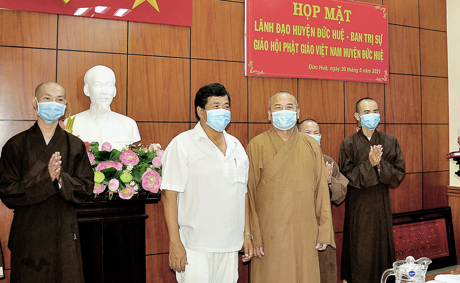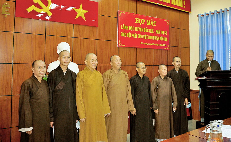 Trước tình hình dịch bệnh covid-19 diễn ra phức tạp. Theo sự chỉ đạo của Ban chỉ đạo công tác tổ chức Đại hội Đại biểu Phật giáo huyện, thị xã, thành phố nhiệm kỳ 2021-2026 Ban Trị sự GHPGVN tỉnh Long An và sự đồng thuận của Chính quyền huyện Đức Huệ, sáng ngày 20/5/2021 (nhằm ngày 9/4/Tân Sửu) tại văn phòng Huyện Ủy huyện Đức Huệ, khu vực 2, Thị trấn Đông Thành, huyện Đức Huệ, tỉnh Long An, Ban Trị sự GHPGVN huyện Đức Huệ nhiệm kỳ I (2021-2026) tổ chức buổi lễ Họp Mặt Lãnh Đạo Chính Quyền Và Ra Mắt Tân Ban Trị Sự GHPGVN huyện Đức Huệ nhiệm kỳ I (2021-2026).