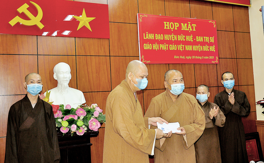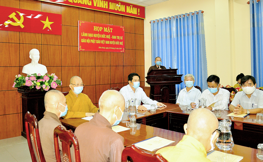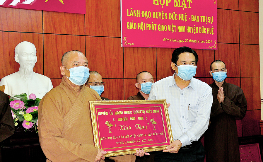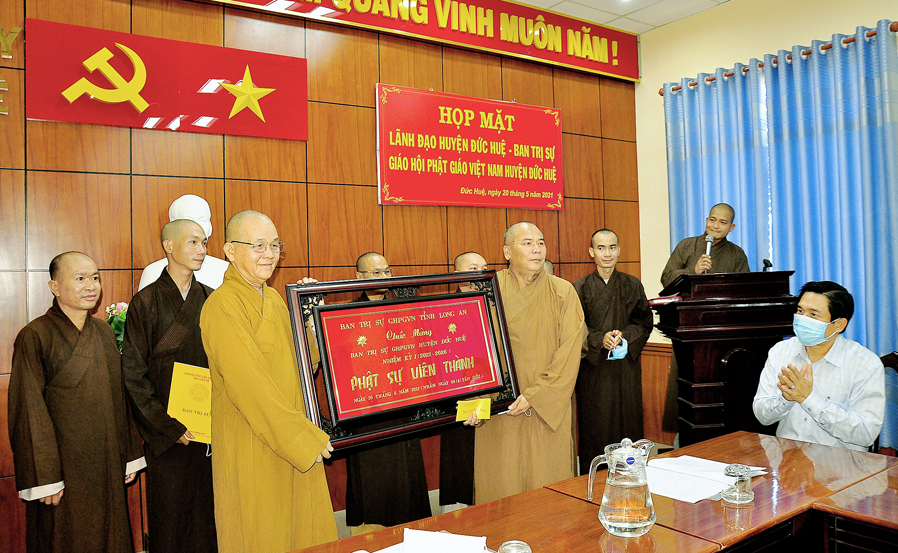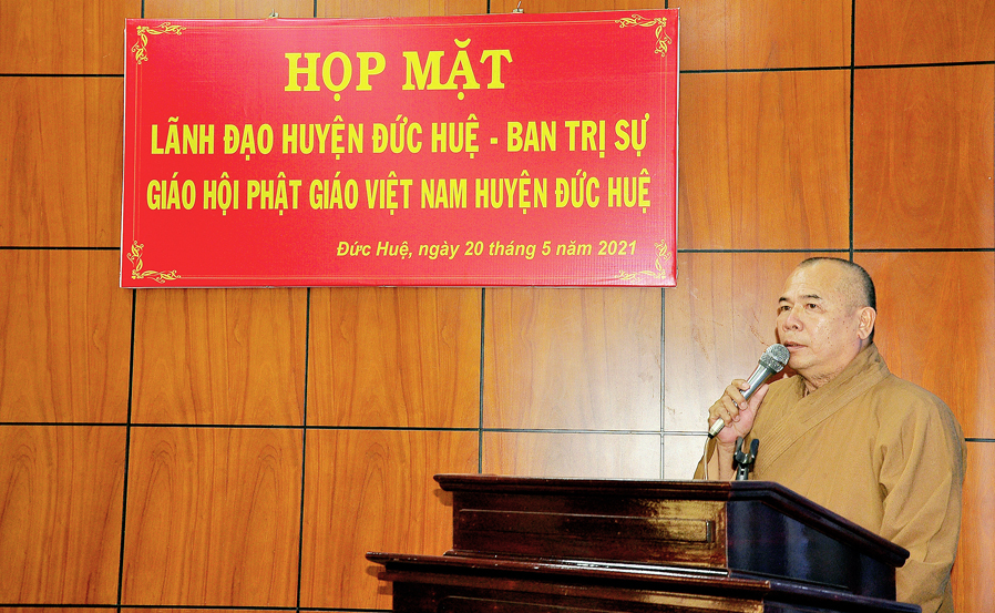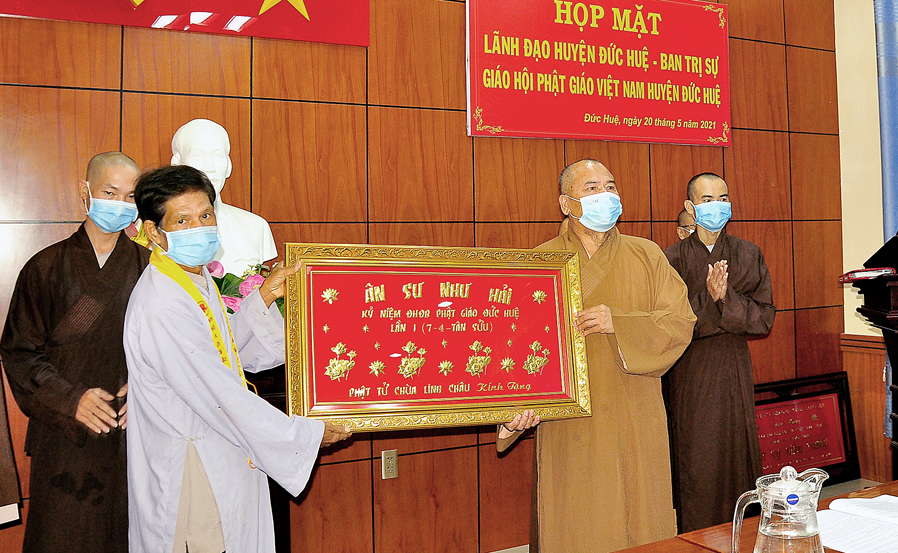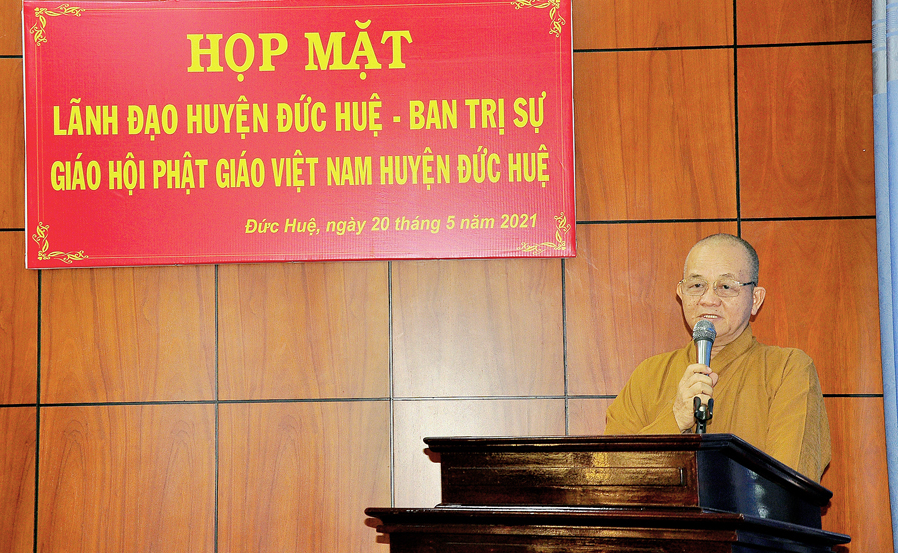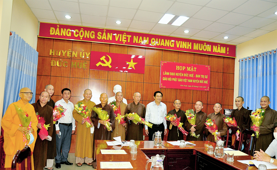 Trước tình hình dịch bệnh covid-19 diễn ra phức tạp. Theo sự chỉ đạo của Ban chỉ đạo công tác tổ chức Đại hội Đại biểu Phật giáo huyện, thị xã, thành phố nhiệm kỳ 2021-2026 Ban Trị sự GHPGVN tỉnh Long An và sự đồng thuận của Chính quyền huyện Đức Huệ, sáng ngày 20/5/2021 (nhằm ngày 9/4/Tân Sửu) tại văn phòng Huyện Ủy huyện Đức Huệ, khu vực 2, Thị trấn Đông Thành, huyện Đức Huệ, tỉnh Long An, Ban Trị sự GHPGVN huyện Đức Huệ nhiệm kỳ I (2021-2026) tổ chức buổi lễ Họp Mặt Lãnh Đạo Chính Quyền Và Ra Mắt Tân Ban Trị Sự GHPGVN huyện Đức Huệ nhiệm kỳ I (2021-2026).