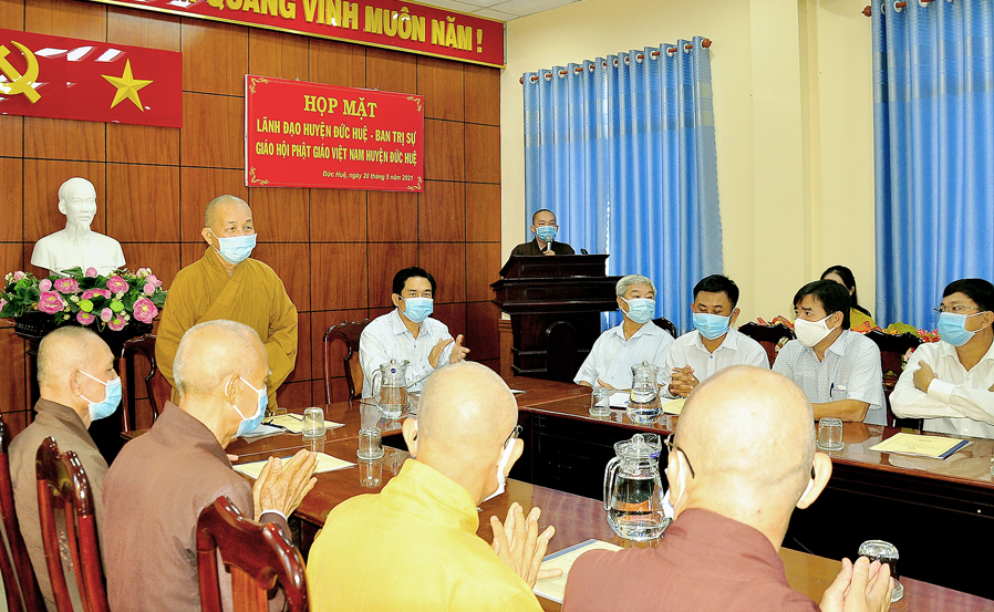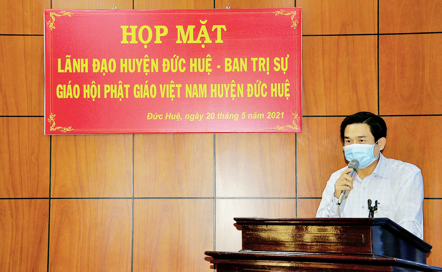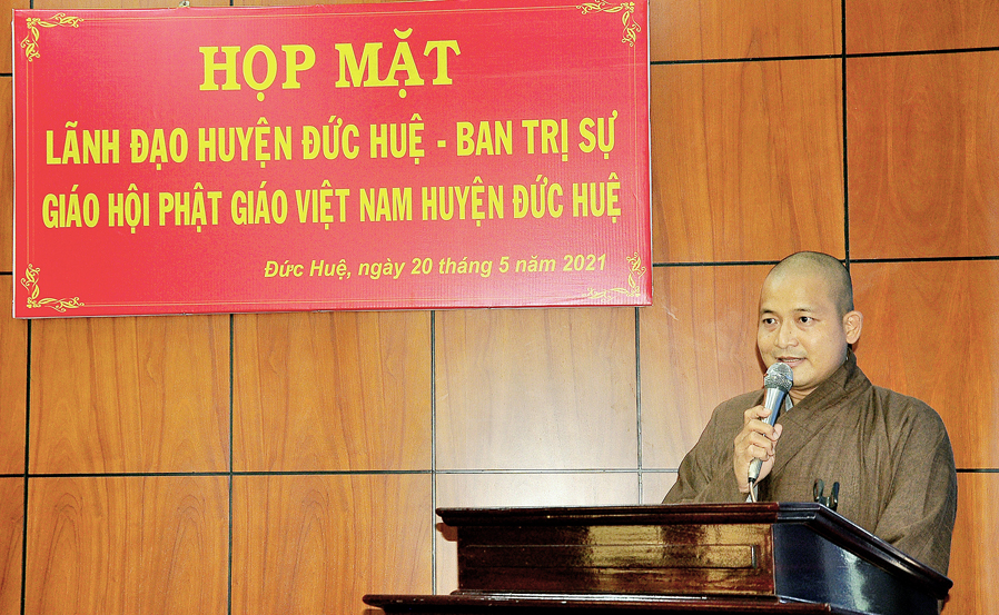 Đại diện chính quyền ông Nguyễn Thanh Phong- Tỉnh Ủy viên, Bí Thư huyện Ủy huyện Đức Huệ phát biểu chúc mừng buổi họp mặt công bố thành phần nhân sự Tân Ban trị sự huyện Đức Huệ. Ông thông tin về tình hình kinh tế huyện nhà. Đồng thời vui mừng khi Chư tôn đức Phật giáo tỉnh nhà về động tham dự, sách tấn động viên Tân Ban Trị sự. Ông mong các thành viên tiếp thu lời dạy của Hòa thượng Thích Minh Thiện phối hợp với Chính quyền địa phương để làm Phật sự tốt góp phần cùng địa phương phát triển huyện nhà. Đối với Tăng Ni được xem là tu tại gia cần phải rà soát đưa vào danh sách để hướng dẫn tu học đúng với tinh thần phương hướng hoạt động của Phật giáo huyện đề ra. Các ngành liên quan nhà nước của huyện Vĩnh Hưng và các ban ngành sở tại cần hỗ trợ tích cực đối với tân Ban Trị sự huyện nhà, như quản lý về đất đai, xây dựng, đăng ký chương trình hành lễ.v.v…
