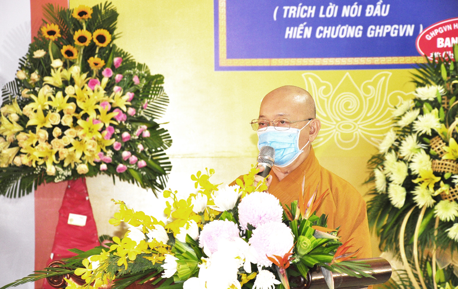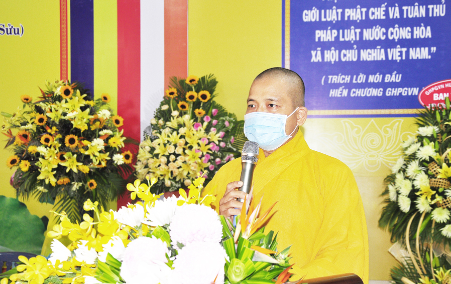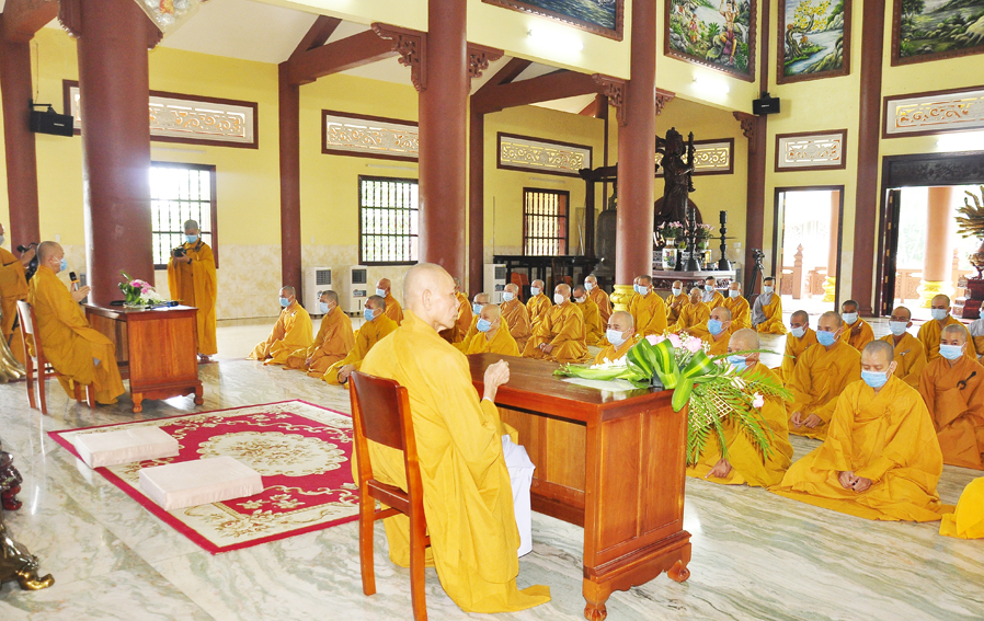 Tiếp đó, ĐĐ. Thích Lệ Ngôn- trưởng Ban Hoằng pháp GHPGVN tỉnh Long An báo cáo chương trình tu học. Theo báo cáo nữa tháng đầu tất cả hành giả chuyên tâm tu tập. Sau đó căn cứ vào tình hình diễn biến dịch bệnh covid-19 và khuyến cáo của các nghành chức năng, Ban Hoằng pháp Ban Trị sự GHPGVN tỉnh sẽ thỉnh cử giảng sư Ban Hoằng pháp tỉnh thuyết giảng cho hành giả. Nội dung học gồm nội điển Kinh – Luật – Luận, ngoại điển Hành chánh Giáo hội, Bồi dưỡng Kiến thức Trụ trì, Luật Tín ngưỡng Tôn giáo …