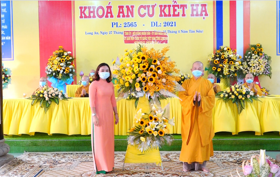 Thay mặt tỉnh ủy, HĐND, UBND, UBMTTQVN tỉnh Long An Bà Lê Thị Cẩm Tú- Phó Chủ tịch MTTQVN tỉnh phát biểu chúc mừng. Bà mong rằng sau khóa An cư kiết hạ khi trở về trú xứ, Tăng Ni tích cực đem đạo vào đời tốt và thiết thực hơn nữa. Tăng Ni tiếp tục thực hiện đúng mục đích của Giáo hội Phật giáo VN là Hoằng dương chánh pháp, phát triển Giáo hội trong và ngoài nước, tham gia bảo vệ Tổ quốc, phục vụ Dân tộc, góp phần xây dựng hòa bình an lạc cho chúng sanh. Đồng thời Bà cũng mong Tăng Ni vận động Phật tử tích cực tham gia hưởng ứng phong trào thi đua yêu nước, các hoạt động do Mặt trận và các đoàn thể địa phương phát động.