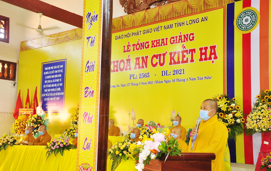 Tại buổi lễ, TT.Thích Quảng Tâm – Uỷ viên HĐTS, Phó trưởng Ban Thường trực Ban Trị sự GHPGVN tỉnh Long An báo cáo công tác tổ chức Khoá An cư Kiết hạ Phật lịch 2565. Theo báo cáo: Các trường hạ sẽ học các chuyên đề về Kinh – Luật – Luận, Hành chánh Giáo hội, Bồi dưỡng Kiến thức Trụ trì, Luật Tín ngưỡng Tôn giáo …