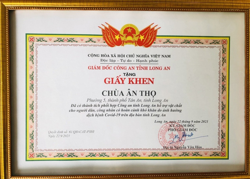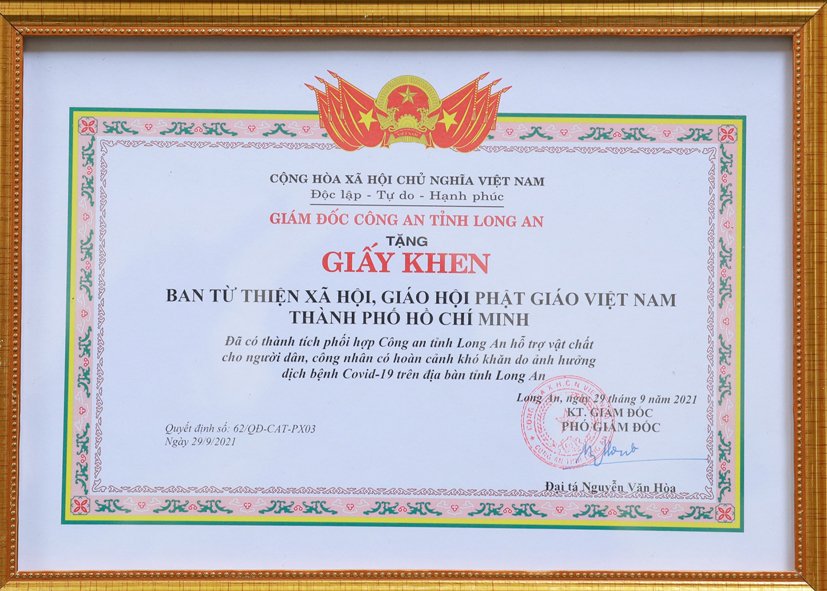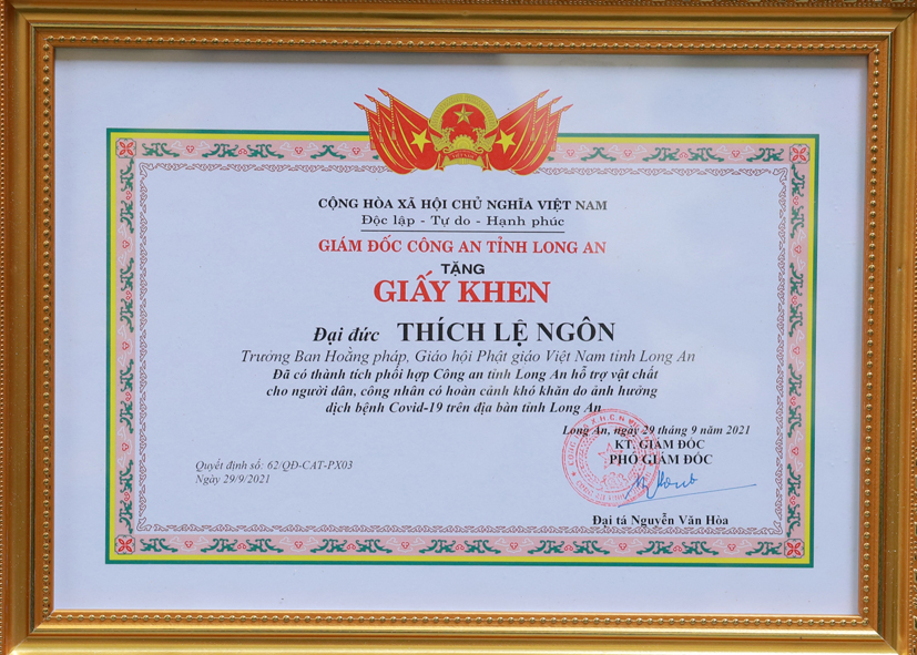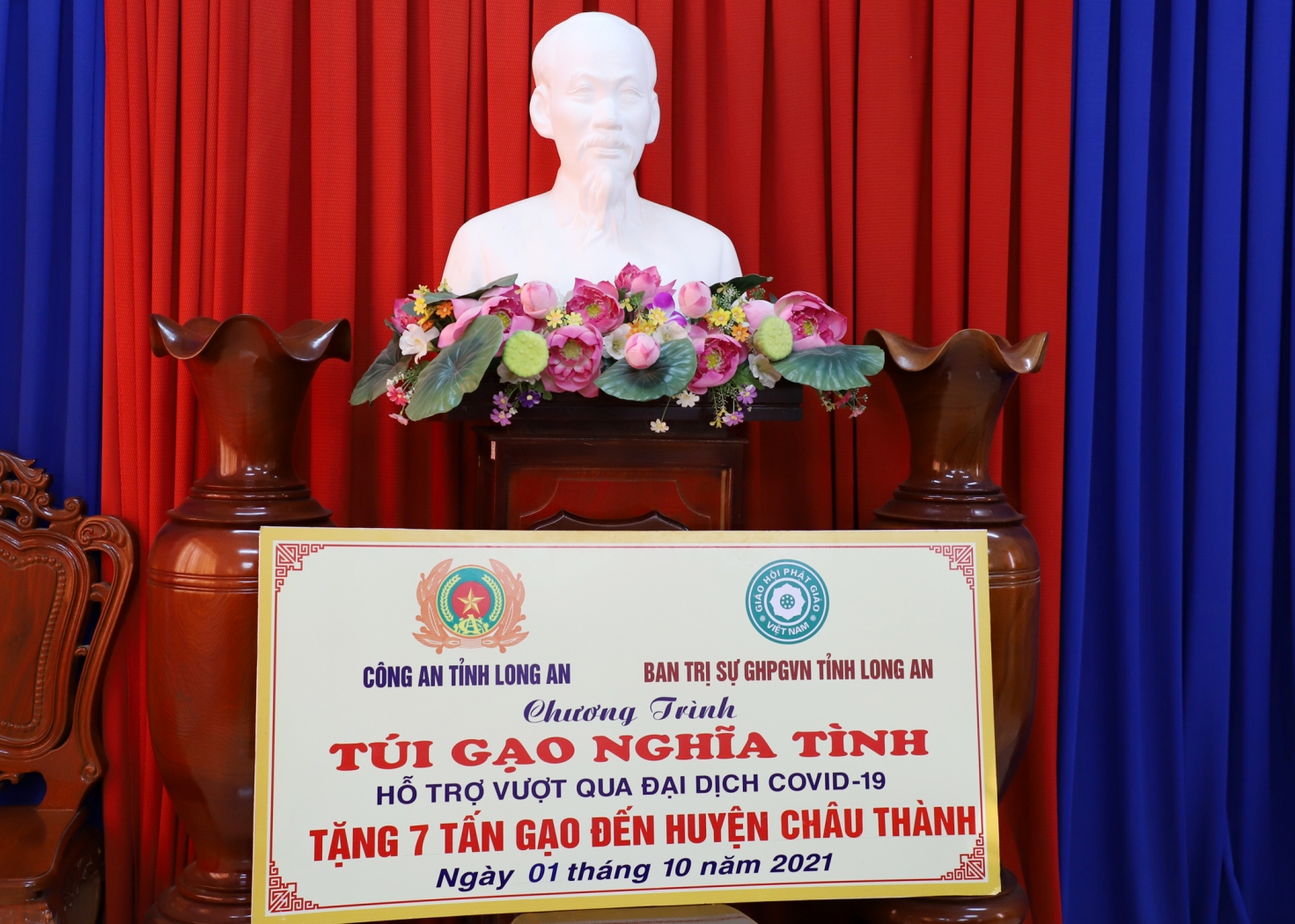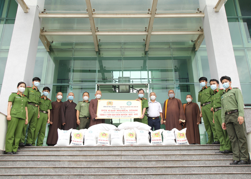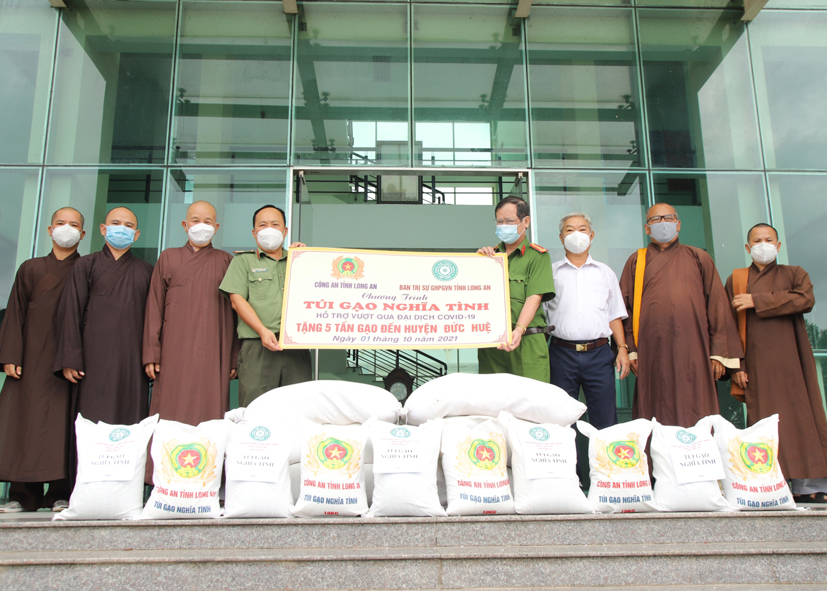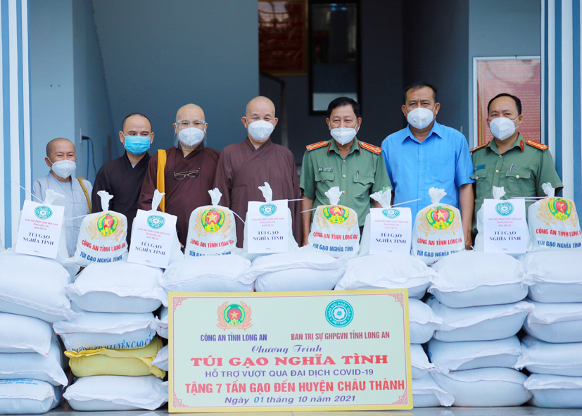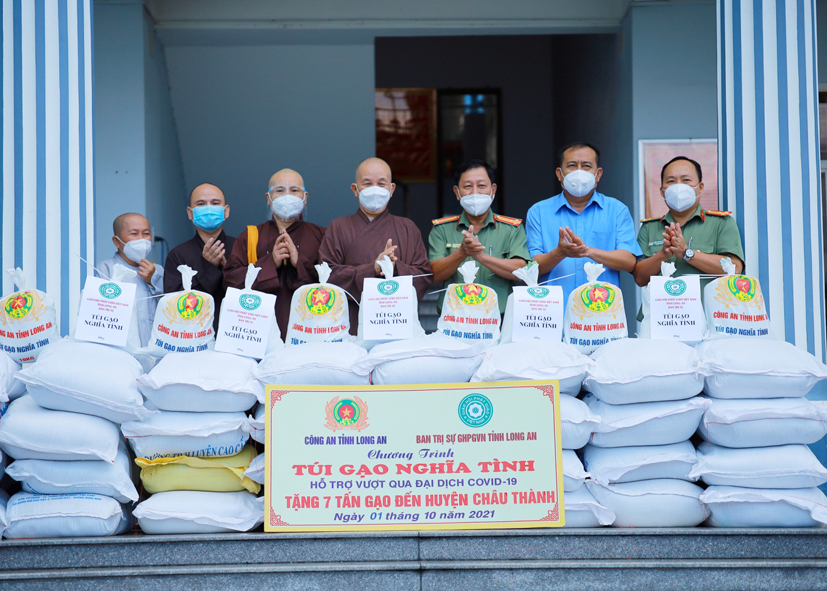 Ngày 02/10/2021, tiếp nối chương trình “túi gạo nghĩa tình” của Ban Trị sự GHPGVN tỉnh và Công an tỉnh Long An kết hợp thực hiện, ngày thứ 7, trao tặng 12 tấn gạo đến huyện Châu Thành (7 tấn) và huyện Đức Huệ (5 tấn) nhằm hỗ trợ người dân, công nhân có hoàn cảnh khó khăn do ảnh hưởng của dịch Covid-19.