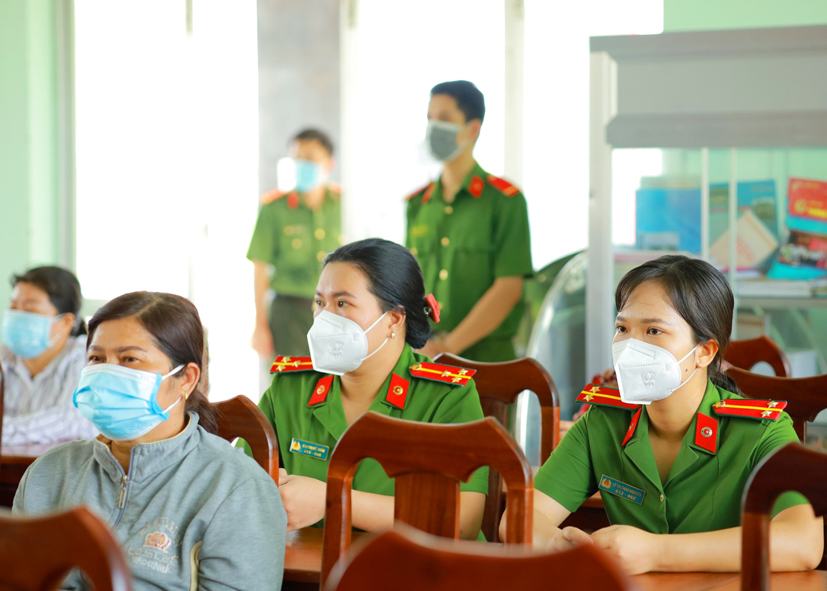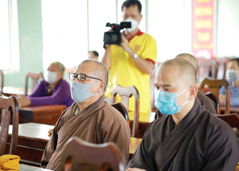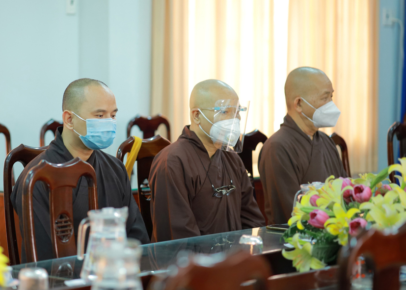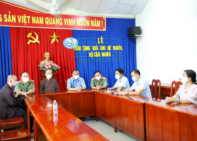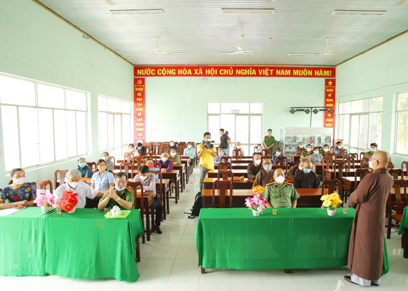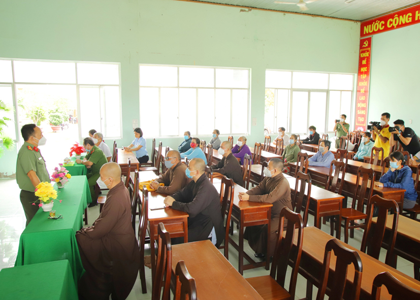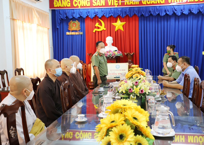 Hướng dẫn đoàn: Hòa thượng Thích Minh Thiện – UV HĐTS GHPGVN, Trưởng ban BTS GHPGVN tỉnh; Thượng tá Đặng Thanh Phong – Phó Trưởng phòng Công tác Đảng, Công tác Chính trị Công an tỉnh; và Đại đức Thích Lệ Ngôn – Trưởng ban Hoằng pháp GHPGVN tỉnh Long An.