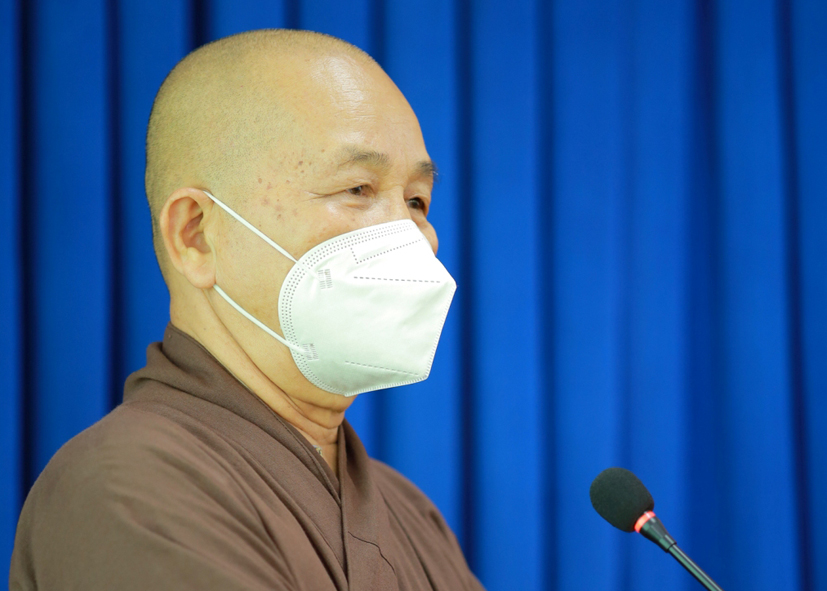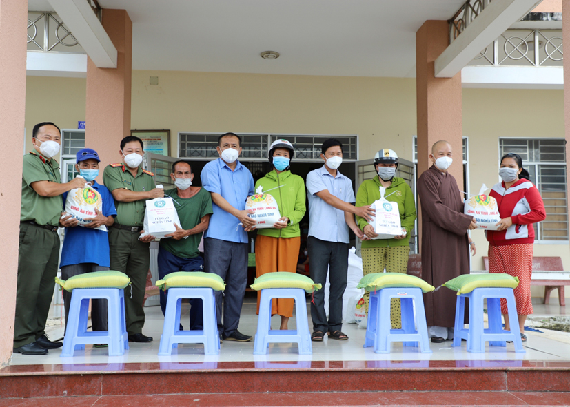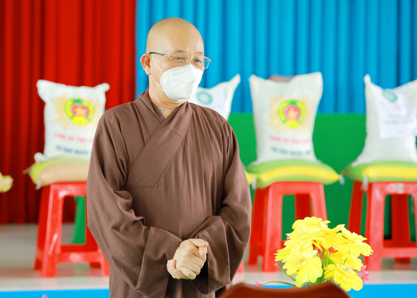 Hòa thượng Thích Minh Thiện chia sẻ: Cùng với Công an tỉnh thực hiện chương trình “Túi gạo nghĩa tình” hỗ trợ cho những người dân khó khăn, bị ảnh hưởng bởi dịch bệnh covid 19 đến đời sống, sinh hoạt. Hòa thượng Trưởng phái đoàn thay lời cho Tăng, Ni Phật giáo tỉnh nhà cùng quý mạnh thường quân,nhà hảo tâm gửi lời thăm, chúc sức khỏe đến quý bà con, cô bác trong huyện và động viên tinh thần cùng chính quyền đoàn kết vượt qua đại dịch. Trong chương trình Hòa thượng nhấn mạnh: Mọi người dân hãy cùng nâng cao tinh thần đoàn kết, tương thân tương ái, quyết tâm chống dịch như chống giặc; tránh xa những tư tưởng cực đoan, sự xúi dục xấu ác của người tiêu cực. Hãy cùng nhau phòng, chống dịch bệnh Covid-19 theo phương thức 5k, bảo vệ an toàn cho chính mình, mọi người là góp phần bảo vệ an ninh cho xã hội.