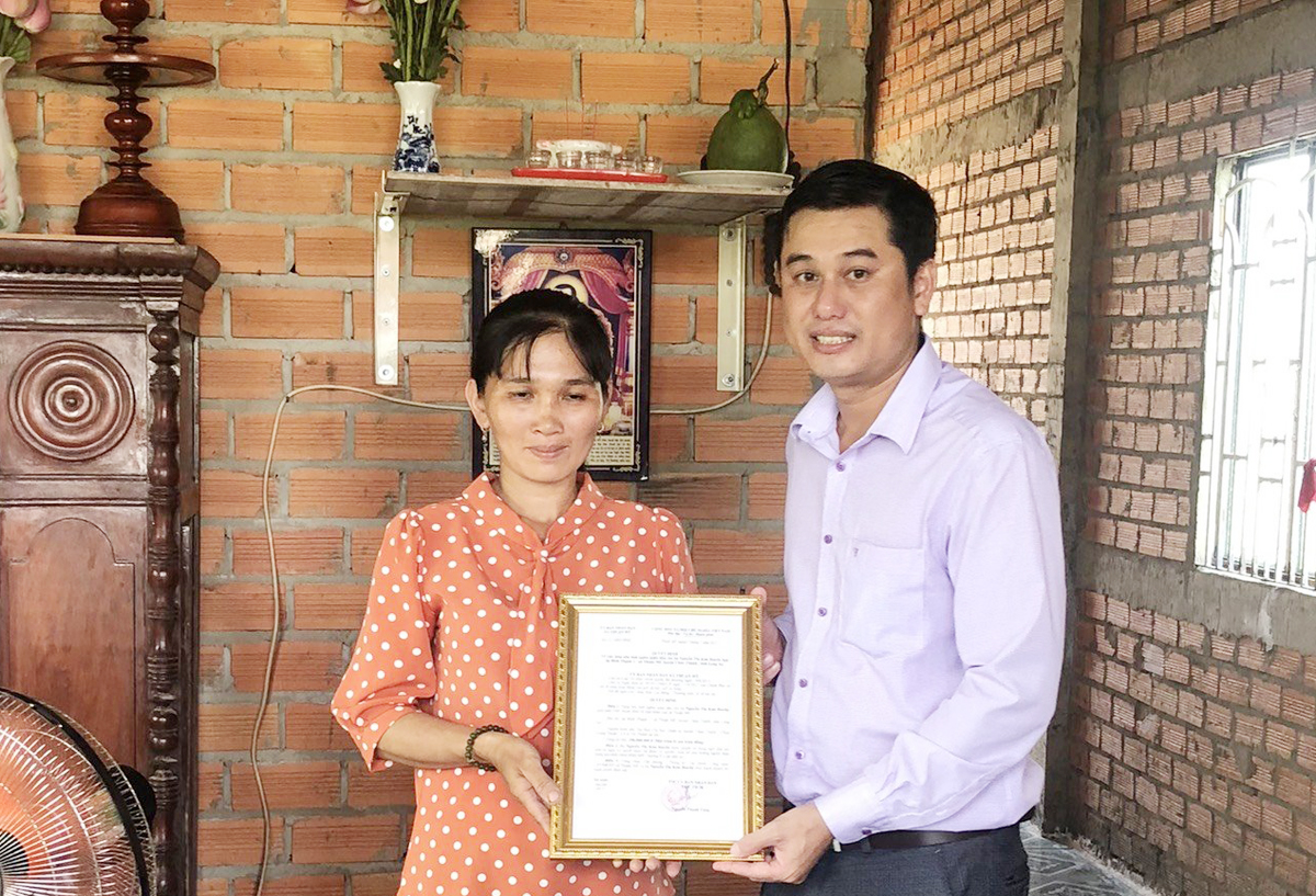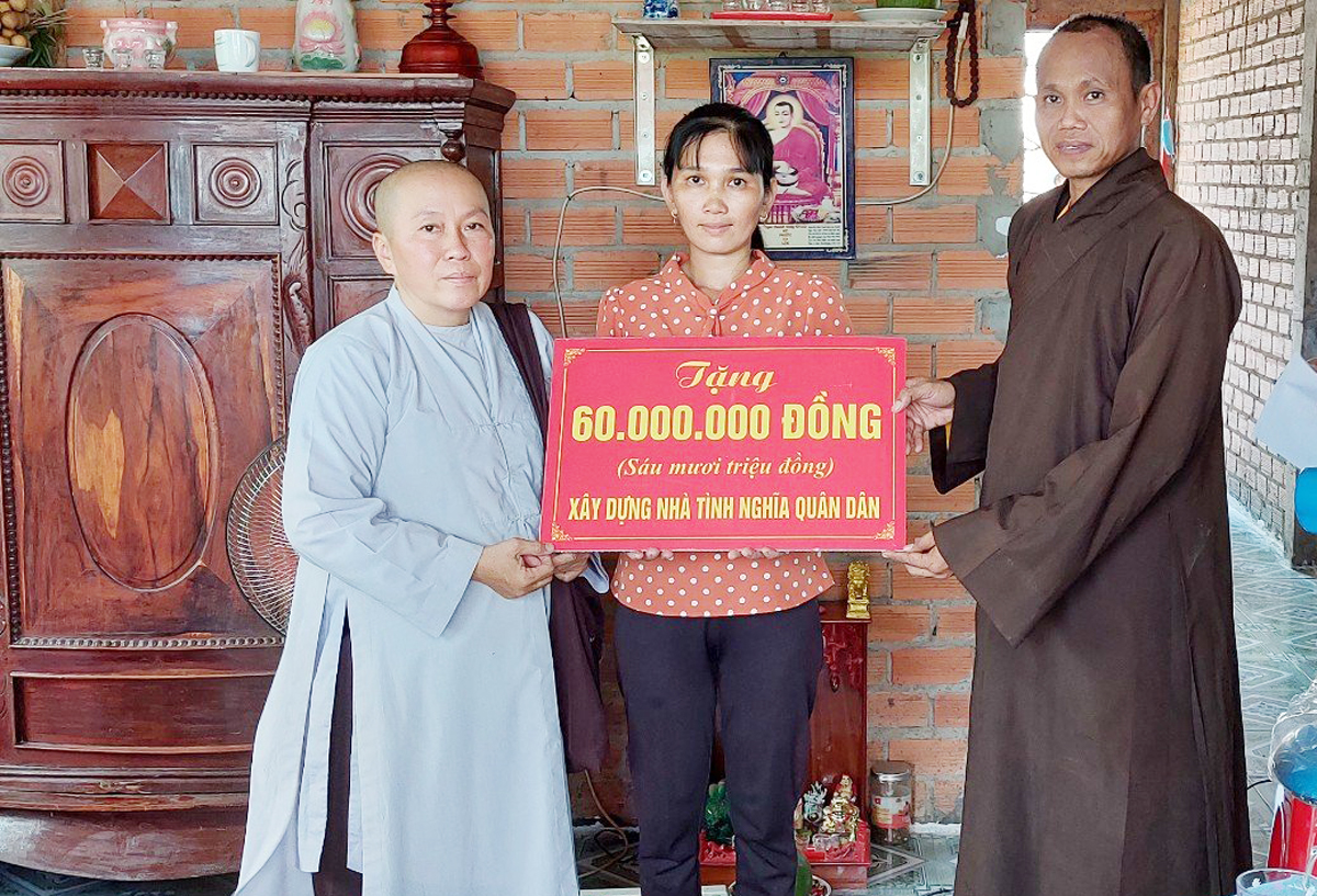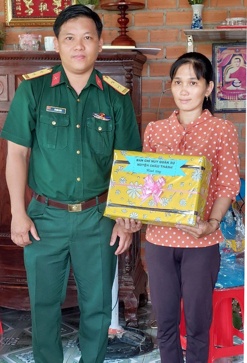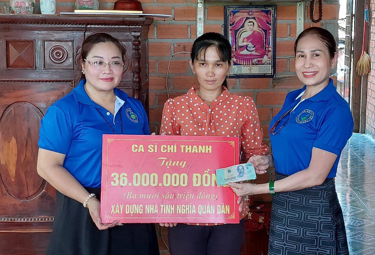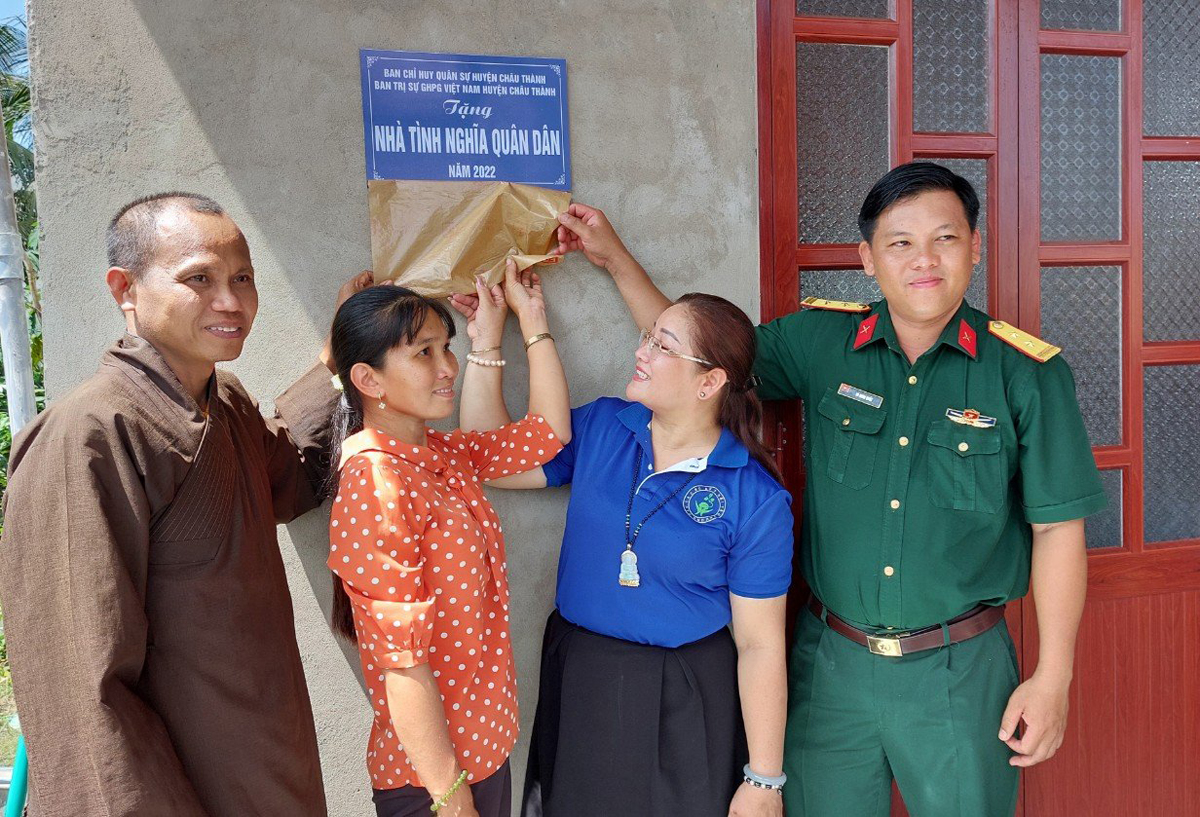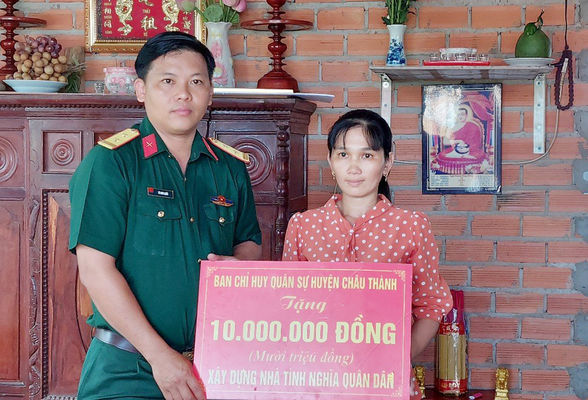 Chị Nguyễn Thị Kim Huyến, sinh năm 1987, thuộc diên hộ nghèo, đang khó khăn về nhà ở. Căn nhà tình nghĩa quân dân trao tặng chị Nguyễn Thị Kim Huyến có diện tích 60 m2, trị giá 120 triệu đồng. Trong đó, Ban Chỉ huy Quân sự huyện hỗ trợ, Ban Trị sự GHPGVN huyện vận động Phật tử chùa Trung Thuận và Ca sĩ Chí Thanh, nhóm câu lạc bộ kết nối yêu thương ủng hộ 106 triệu đồng.