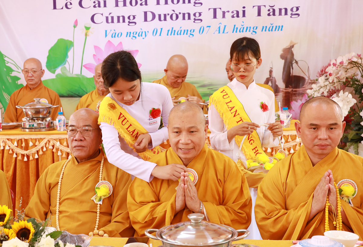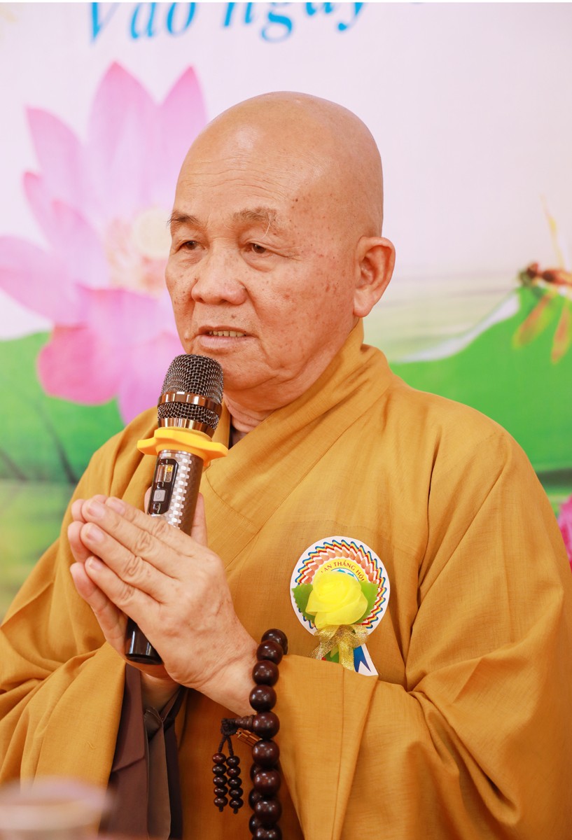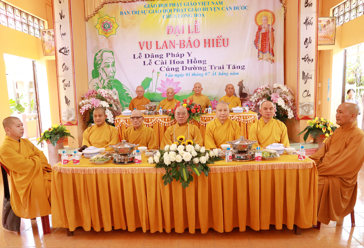 Trong thời khắc thiêng liêng, toàn thể đại chúng được lắng nghe lời đạo từ của Hòa thượng Thích Minh Thiện – Uỷ viên HĐTS – Phó Ban Hoằng pháp TW – Trưởng BTS. GHPGVN tỉnh Long An, trong lời đạo từ, Hòa thượng đã nhắc lại ý nghĩa và nguồn gốc cao đẹp của nghi thức bông hồng cài áo, bốn sắc hoa tượng trưng với ý nghĩa tôn quý, màu vàng dâng cúng chư Tôn đức, tượng trưng cho màu giải thoát cao đẹp, màu đỏ dành cho những ai hạnh phúc trên đời còn đầy đủ hai đấng sinh thành, màu hường cho những ai thiếu vắng đi một trong hai hình bóng của cha và mẹ và hoa hồng trắng là sự tưởng nhớ dành cho những ai không còn cha mẹ trên đời. Hòa thượng đã sách tấn chư tôn đức Tăng Ni tỉnh Long An nói chung và huyện Cần Đước nói riêng nên có thời khóa tụng kinh Vu lan, thực hiện các chương trình tri ân, báo ân thực tiễn để hướng dẫn Phật tử hướng về báo đáp công ơn cha mẹ trong thực tại, đồng thời nhắn nhủ Chư Ni tại Ni viện Long Hoa luôn vững tâm trên lộ trình tu tập, giữ vững niềm tin vào sự che chở và hướng dẫn của Thường trực BTS. GHPGVN tỉnh Long An trong quá trình thừa hành Phật sự tử nhị vị Cố Ni Trưởng đã truyền trao, đưa Phật sự tại Ni viện Long Hoa ổn định và phát triển hưng thịnh.