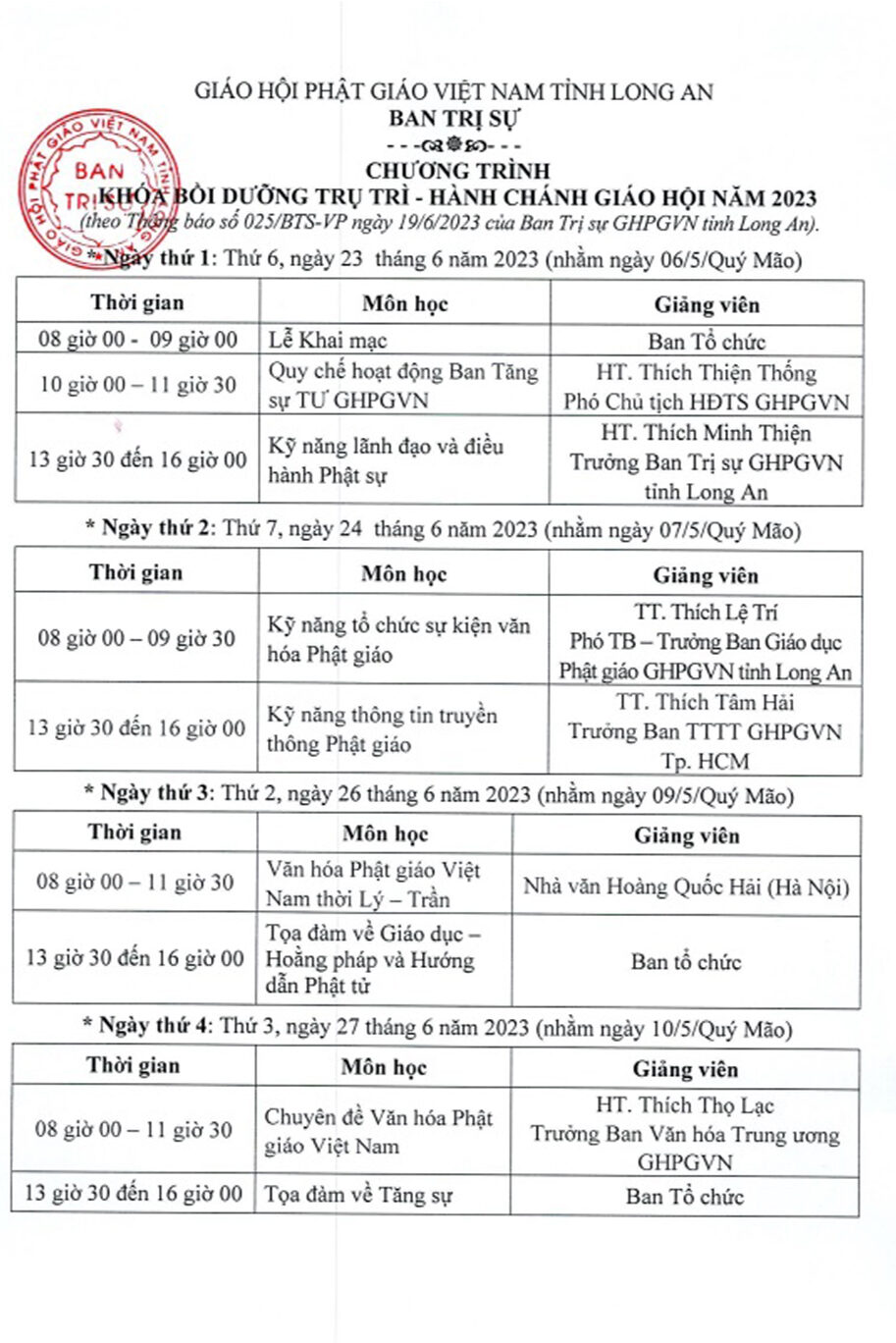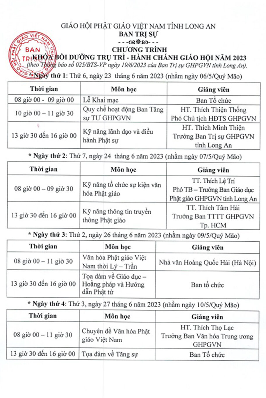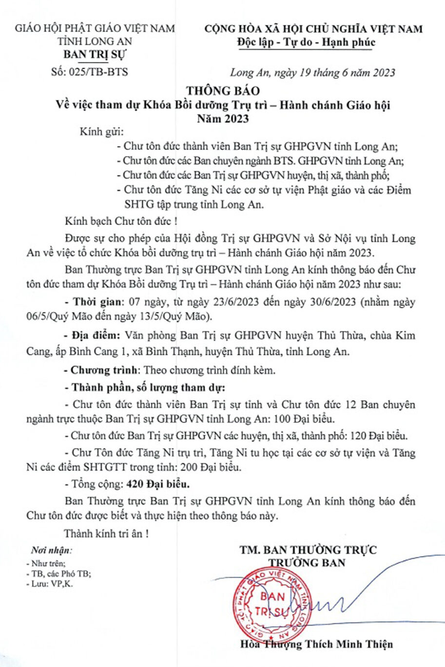 Ban Thường trực Ban Trị sự GHPGVN tỉnh Long An kính thông báo đến Chư tôn đức tham dự Khóa Bồi dưỡng Trụ trì – Hành chánh Giáo hội năm 2023 như sau: