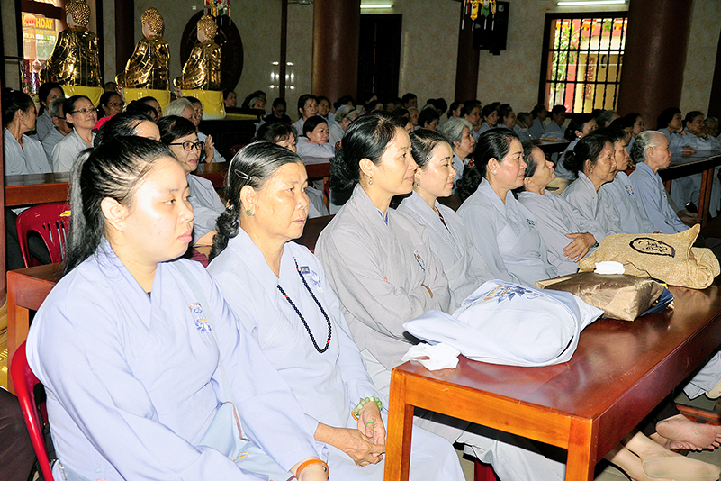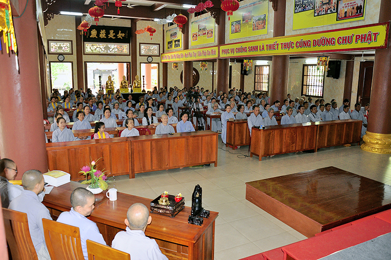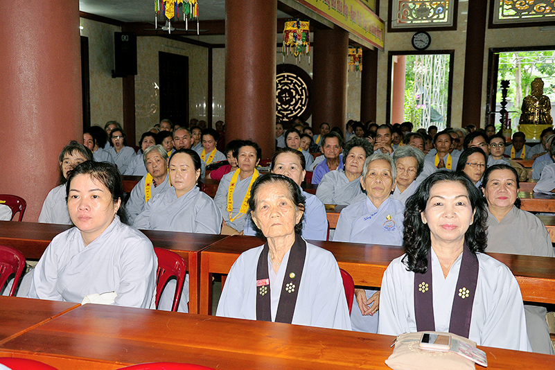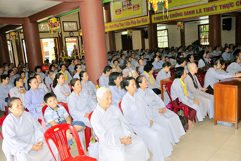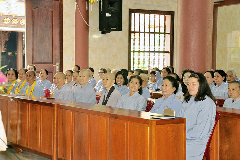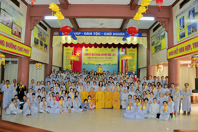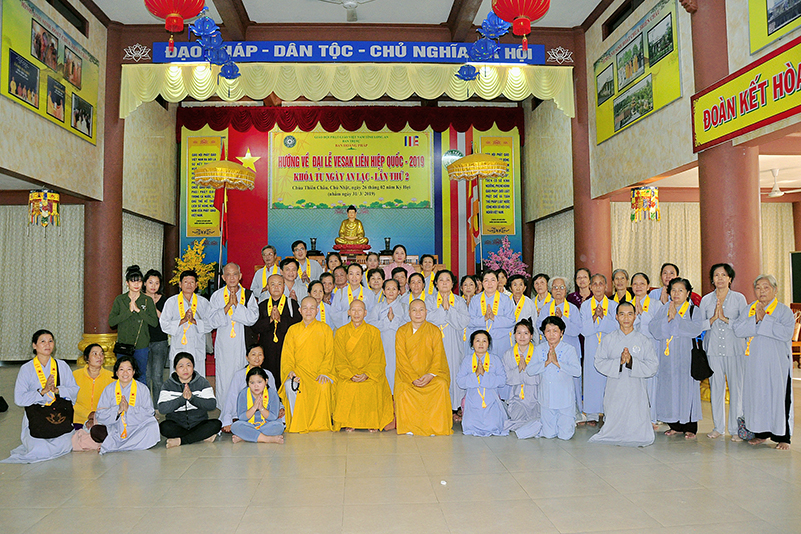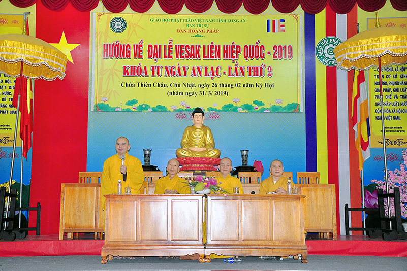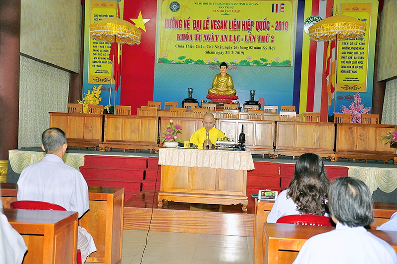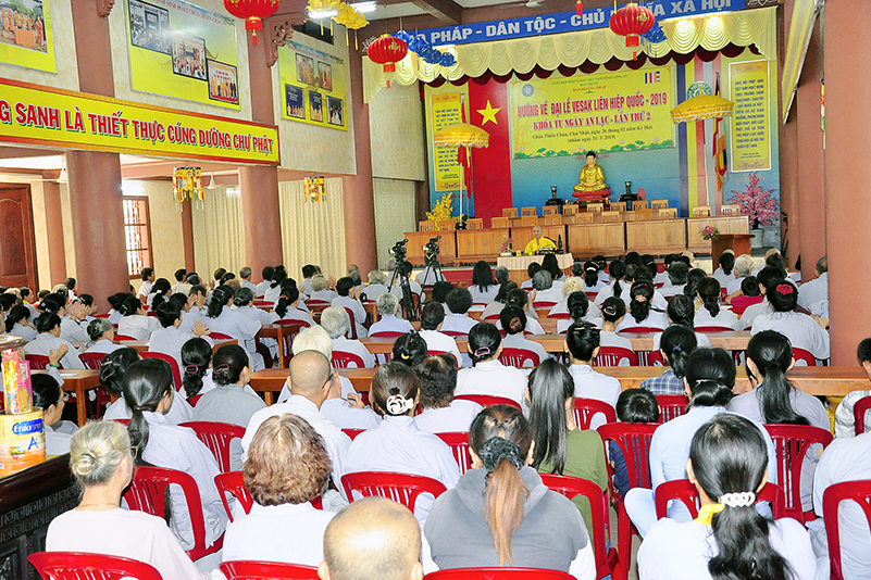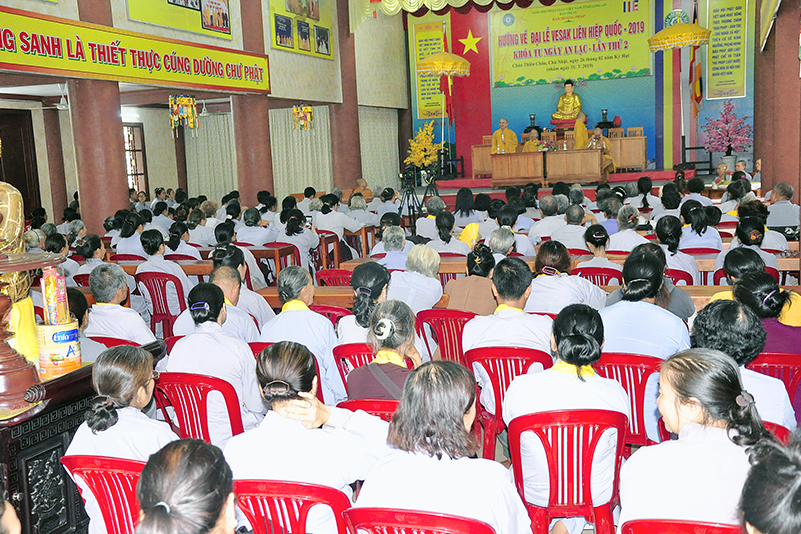 Theo chương trình được ấn định của khóa tu: 7h 30 chư Phật tử vân tập dùng điểm tâm sáng; 8h00 khóa tụng kinh cầu Quốc Thái Dân An; 9h00 nghe thuyết pháp do ĐĐ. Thích An Đạt tổ trưởng Tổ Báo Chí văn phòng II TƯ GHPGVN với chủ đề “ Hướng Về Đại Lễ Vesak Liên Hiệp Quốc” qua nội dung bài giảng Đại Đức giảng giải cho Phật tử hiểu về sự ra đời và những hoạt động của đại lễ Phật đản liên hiệp quốc. Ngoài ra, Đại Đức còn hướng dẫn cho Phật tủ phương pháp tu tập, nhằm thay đổi cuộc sống đưa đến sự an lạc, hạnh phúc. Điều chỉnh tự thân, tu sửa khẩu nghiệp, thay đổi từ thể xác đến tâm hồn cho được thanh tịnh trong sạch.